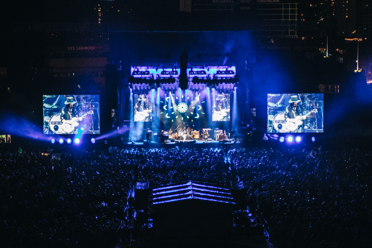 Last Thursday evening, thousands of people crowded into Wrigley Field for a sold-out performance by Tom Petty and the Heartbreakers, and many were concerned the show would be delayed or even canceled. Thunderstorms ominously crept closer and closer to the baseball field, but there was no lightning to be seen. During opener Chris Stapleton’s set, the clouds opened up, dumping massive amounts of rain on fans in ponchos, but the concert carried on. No lightning meant no delay.