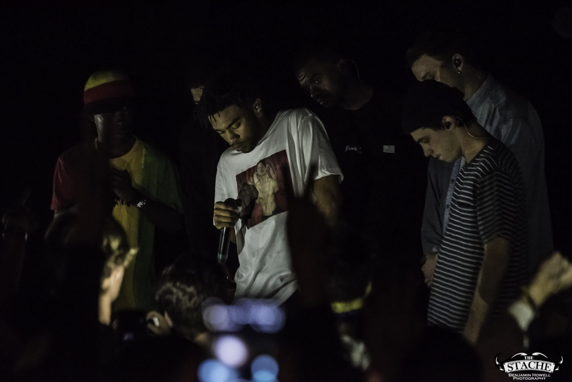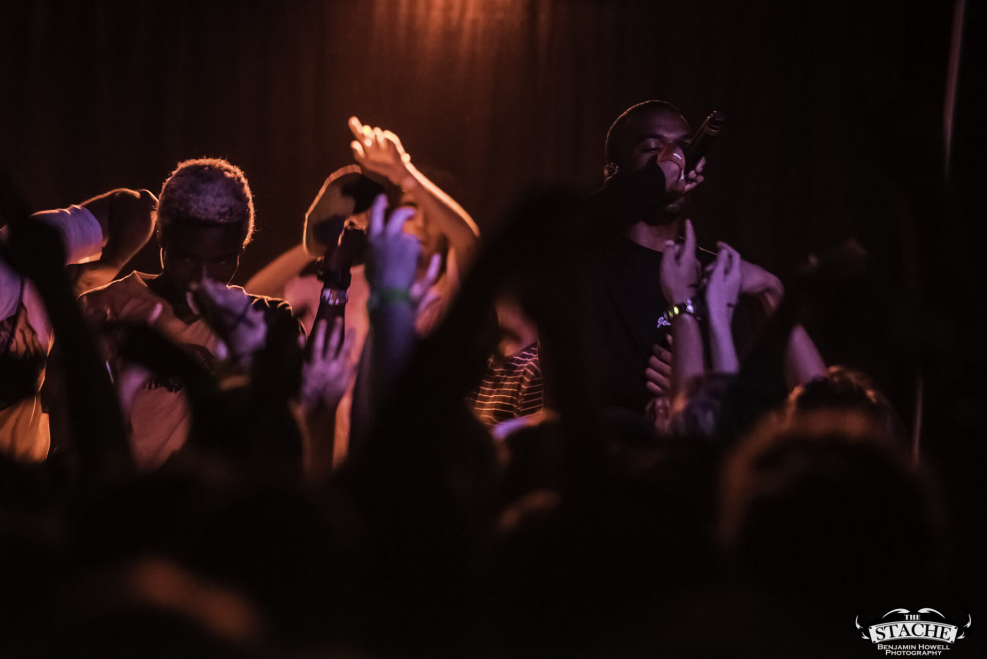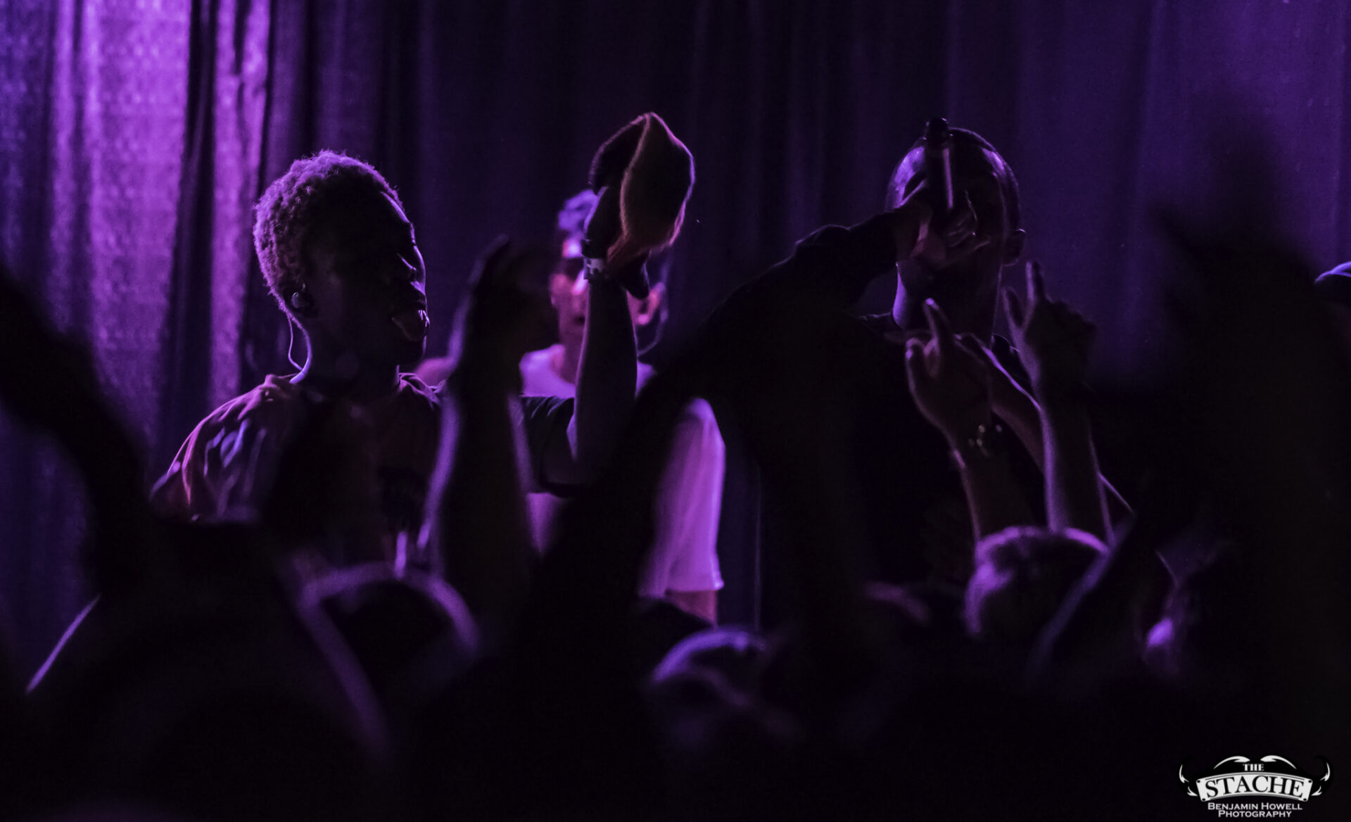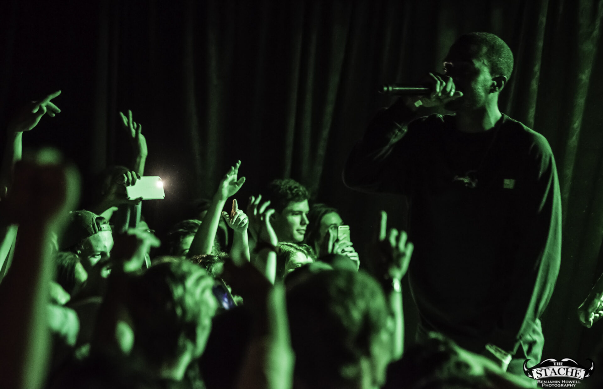What no one in this room knew, including myself, were the events that happened immediately preceding the 7:30 doors. The Stache is a beloved venue with a stage located in the corner of somewhat rectangular space. There is no easy way for an artist choosing to perform with no barrier between the crowd and the stage to make it to said stage without entering through the crowd. The seven members of BROCKHAMPTON present did not want to attempt to navigate the sold out space in order to make their entrance so they chose instead to stand together – all seven members – behind a small black curtain placed in the very back corner of the stage. This happened before the group knew the start time would be delayed half an hour to accommodate extra time needed to get the crowd who had been gathering for hours outside into the venue. In total the group would spend an hour and half just feet from their fans without making their presence known.