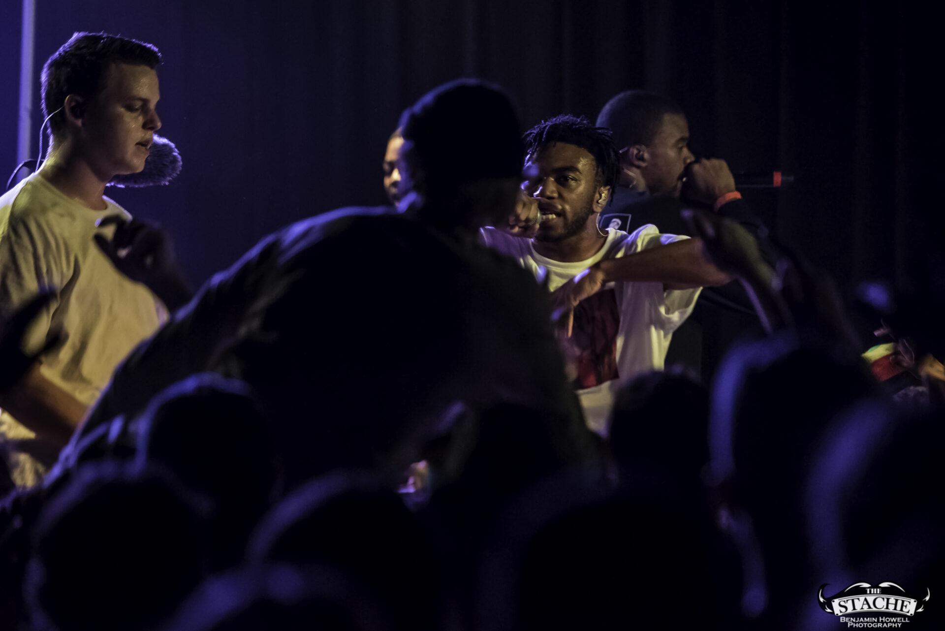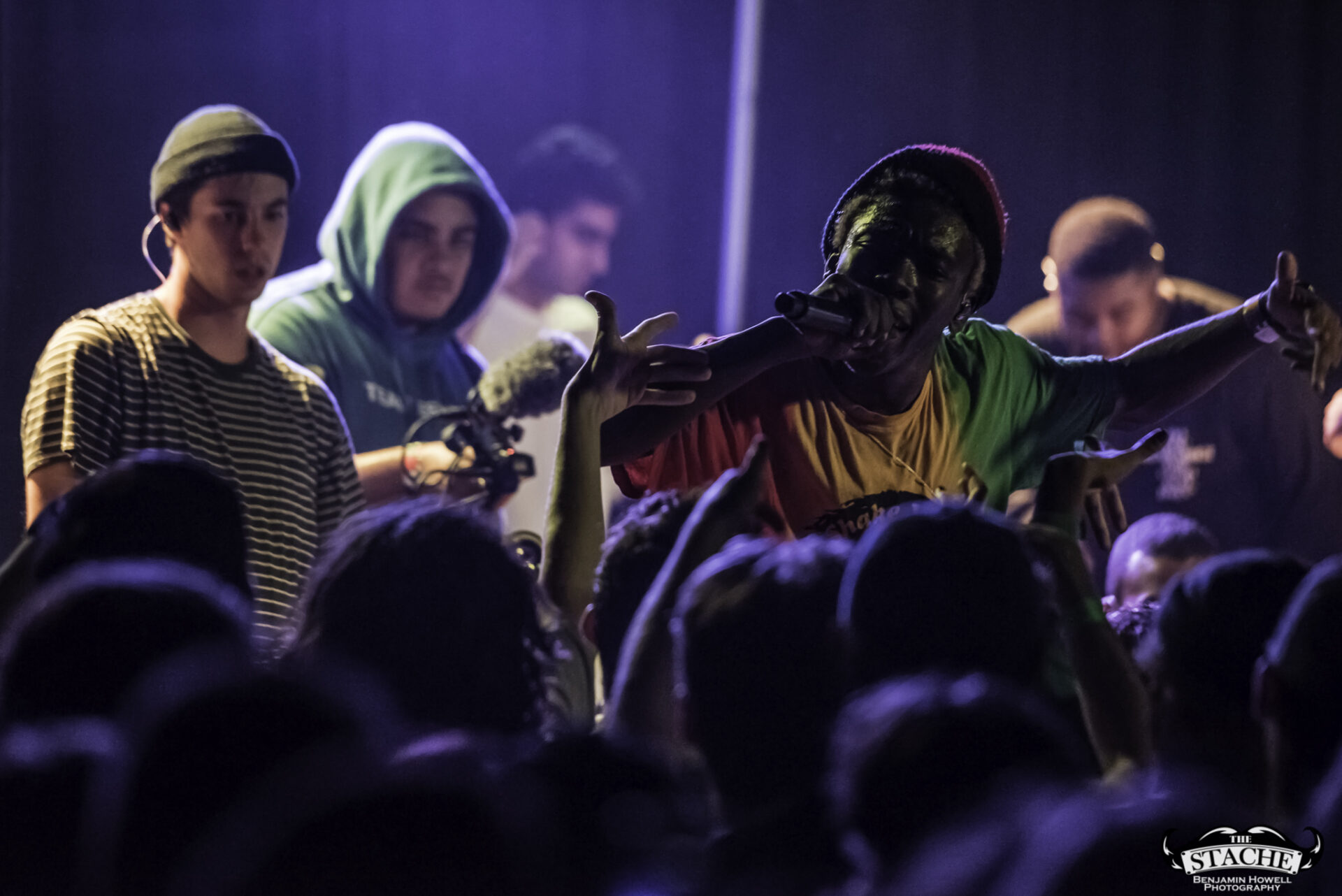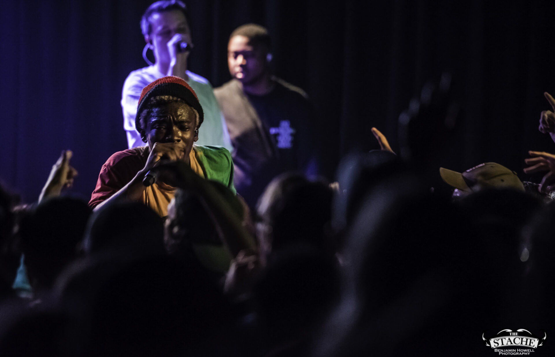 What no one in this room knew, including myself, were the events that happened immediately preceding the 7:30 doors. The Stache is a beloved venue with a stage located in the corner of somewhat rectangular space. There is no easy way for an artist choosing to perform with no barrier between the crowd and the stage to make it to said stage without entering through the crowd. The seven members of BROCKHAMPTON present did not want to attempt to navigate the sold out space in order to make their entrance so they chose instead to stand together – all seven members – behind a small black curtain placed in the very back corner of the stage. This happened before the group knew the start time would be delayed half an hour to accommodate extra time needed to get the crowd who had been gathering for hours outside into the venue. In total the group would spend an hour and half just feet from their fans without making their presence known.