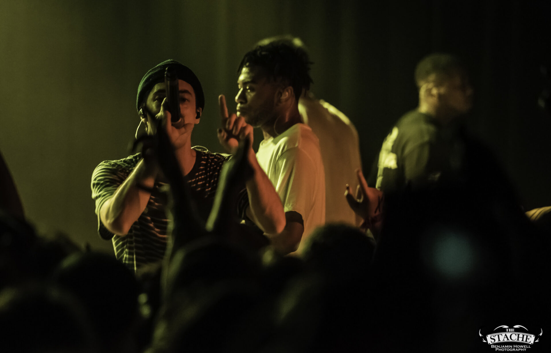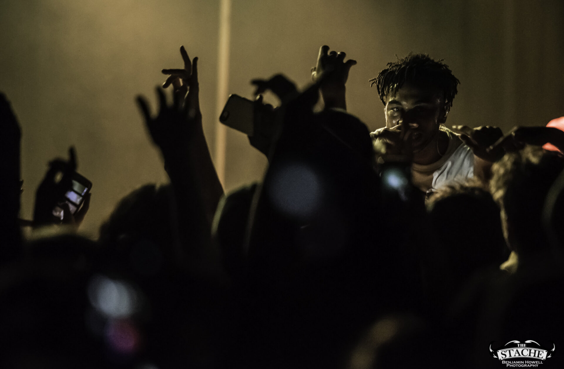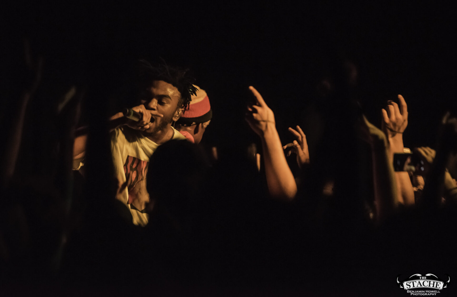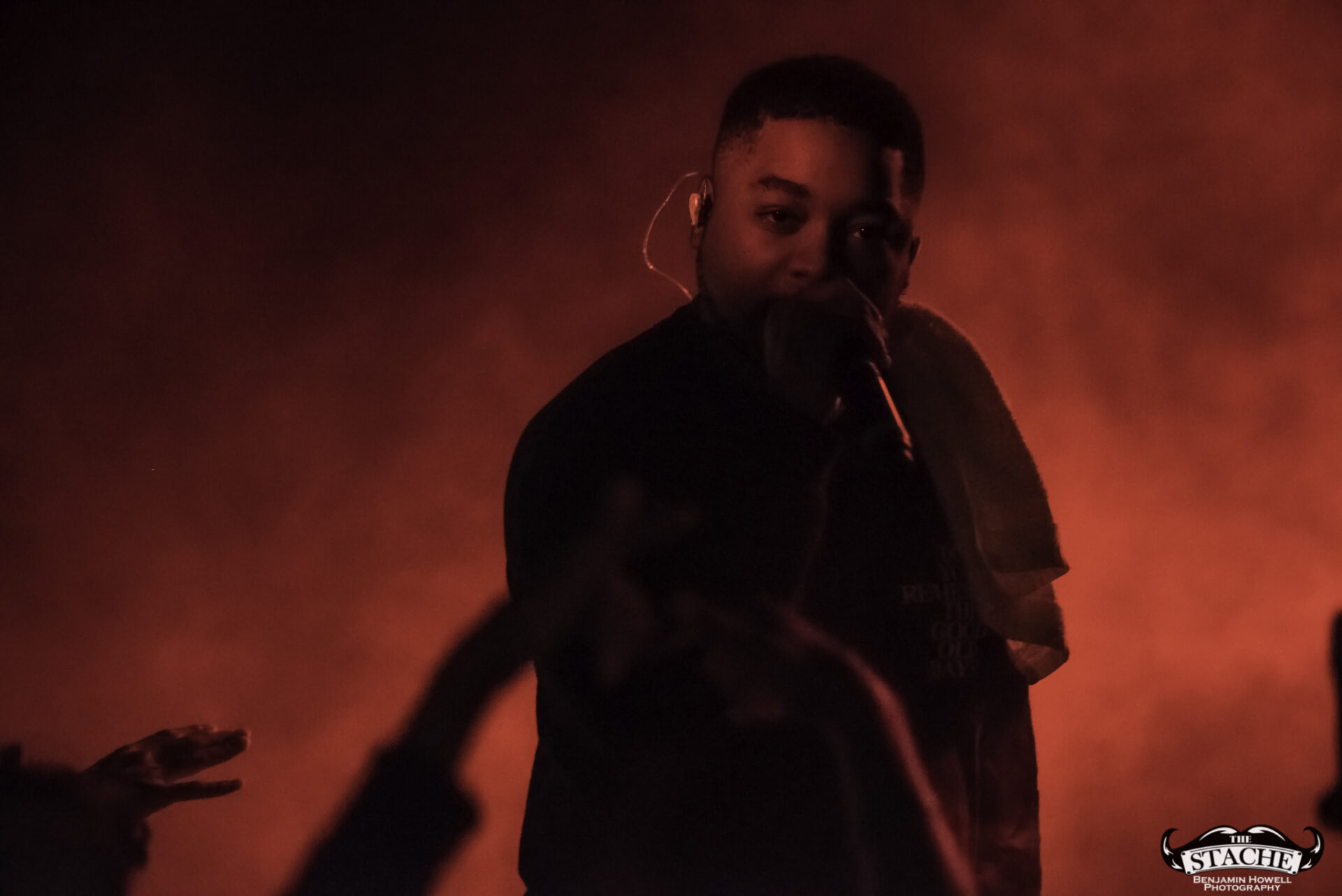 What no one in this room knew, including myself, were the events that happened immediately preceding the 7:30 doors. The Stache is a beloved venue with a stage located in the corner of somewhat rectangular space. There is no easy way for an artist choosing to perform with no barrier between the crowd and the stage to make it to said stage without entering through the crowd. The seven members of BROCKHAMPTON present did not want to attempt to navigate the sold out space in order to make their entrance so they chose instead to stand together – all seven members – behind a small black curtain placed in the very back corner of the stage. This happened before the group knew the start time would be delayed half an hour to accommodate extra time needed to get the crowd who had been gathering for hours outside into the venue. In total the group would spend an hour and half just feet from their fans without making their presence known.