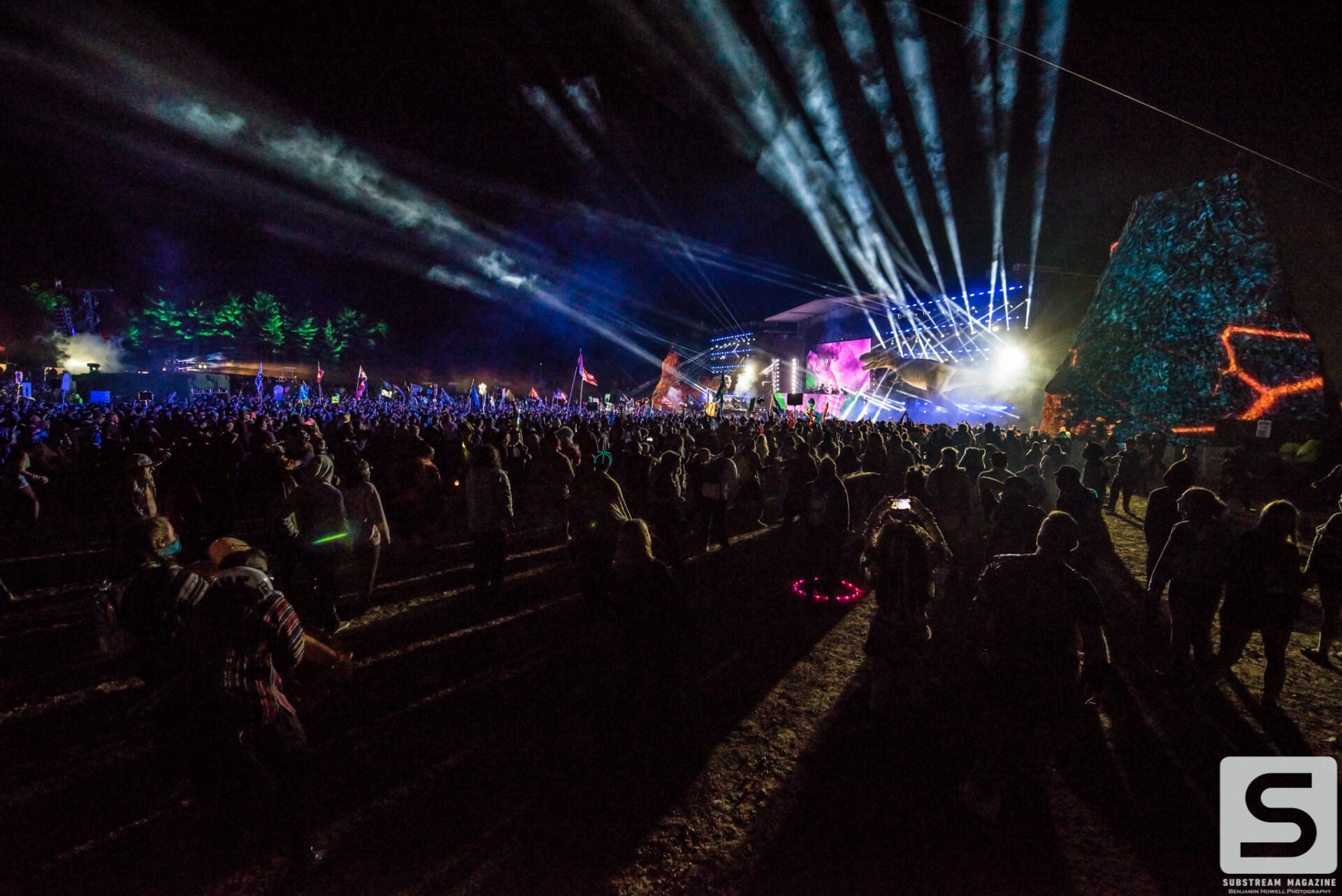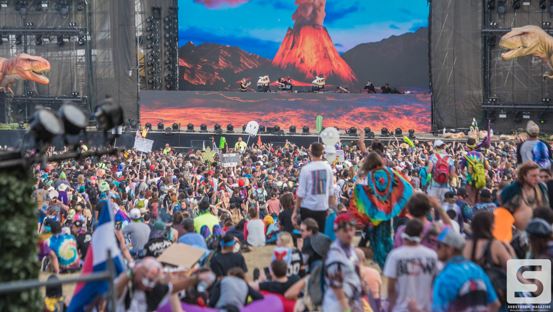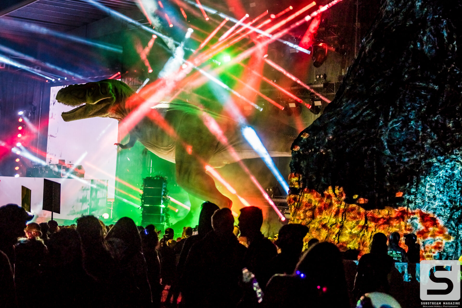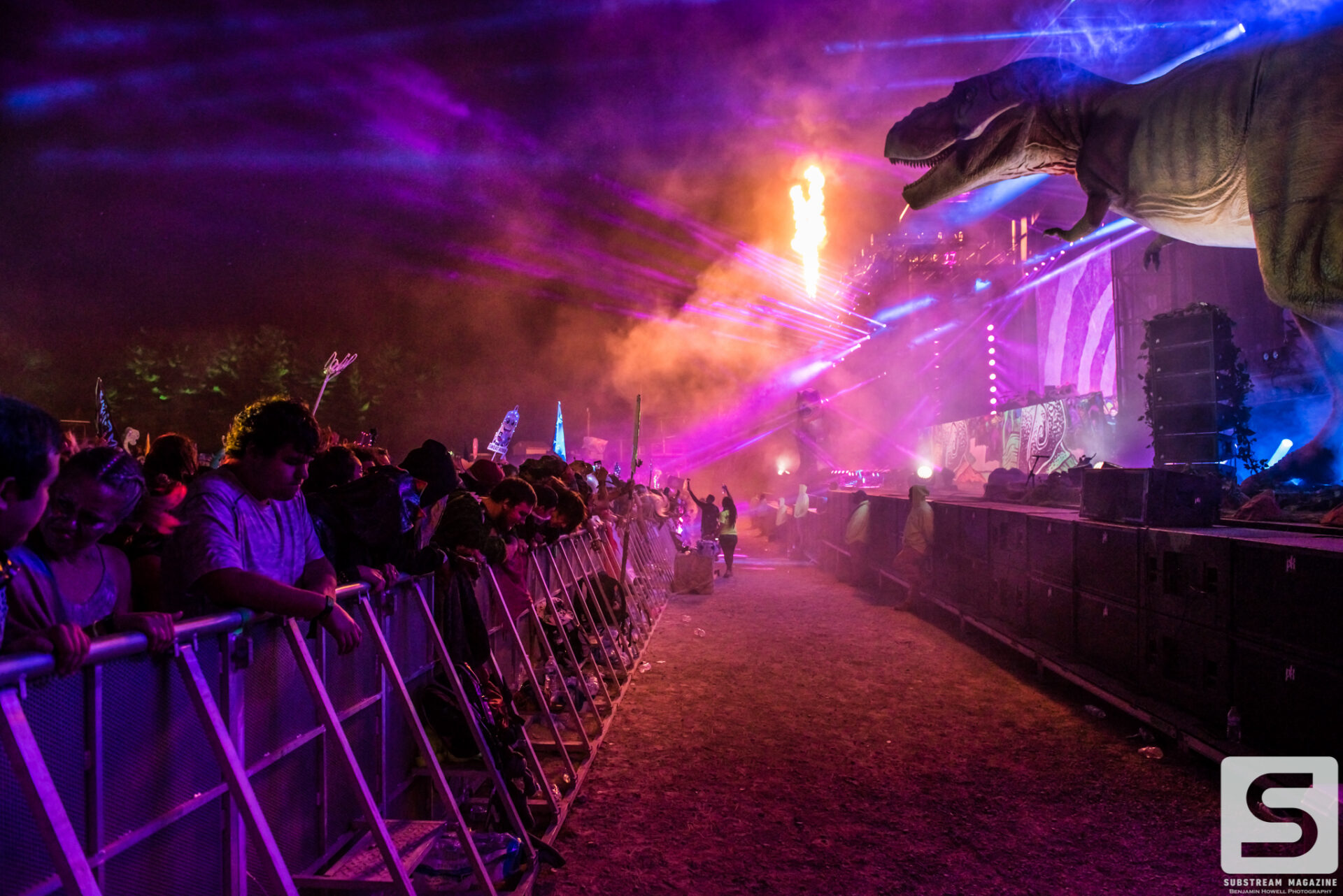 As I made my first approach towards the Prehistoric Paradox stage I was completely awestruck by the level of production, the amount of speakers, and the two enormous tyrannosauruses that were perched on each side. The size of the volcanos was astonishing and I could not wait to see what they looked like shooting fire. My mind began to race with ideas of shots, and then it hit me – he had already pulled it off. I’ve covered festivals all summer long and with just a few steps into this enchanted land I was already blown away by the amount of imagination and work that had gone into it. When I turned around I noticed a large brachiosaurus head hovering above the trees. As I approached it, I couldn’t believe how massive it was. It was easily the size of a 10 story building and by far the largest structure I have ever seen constructed solely for a music festival.