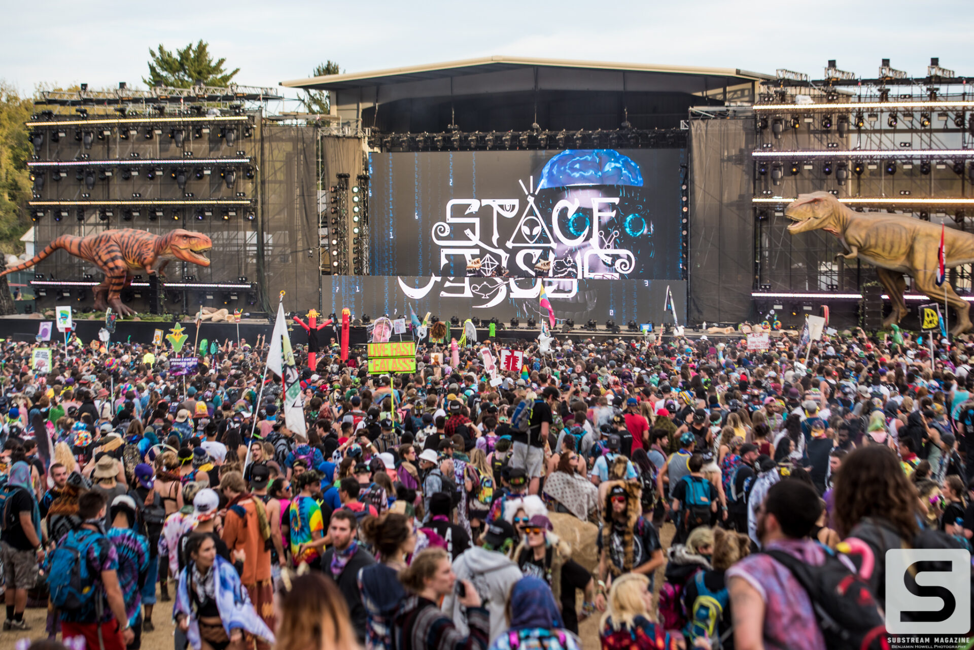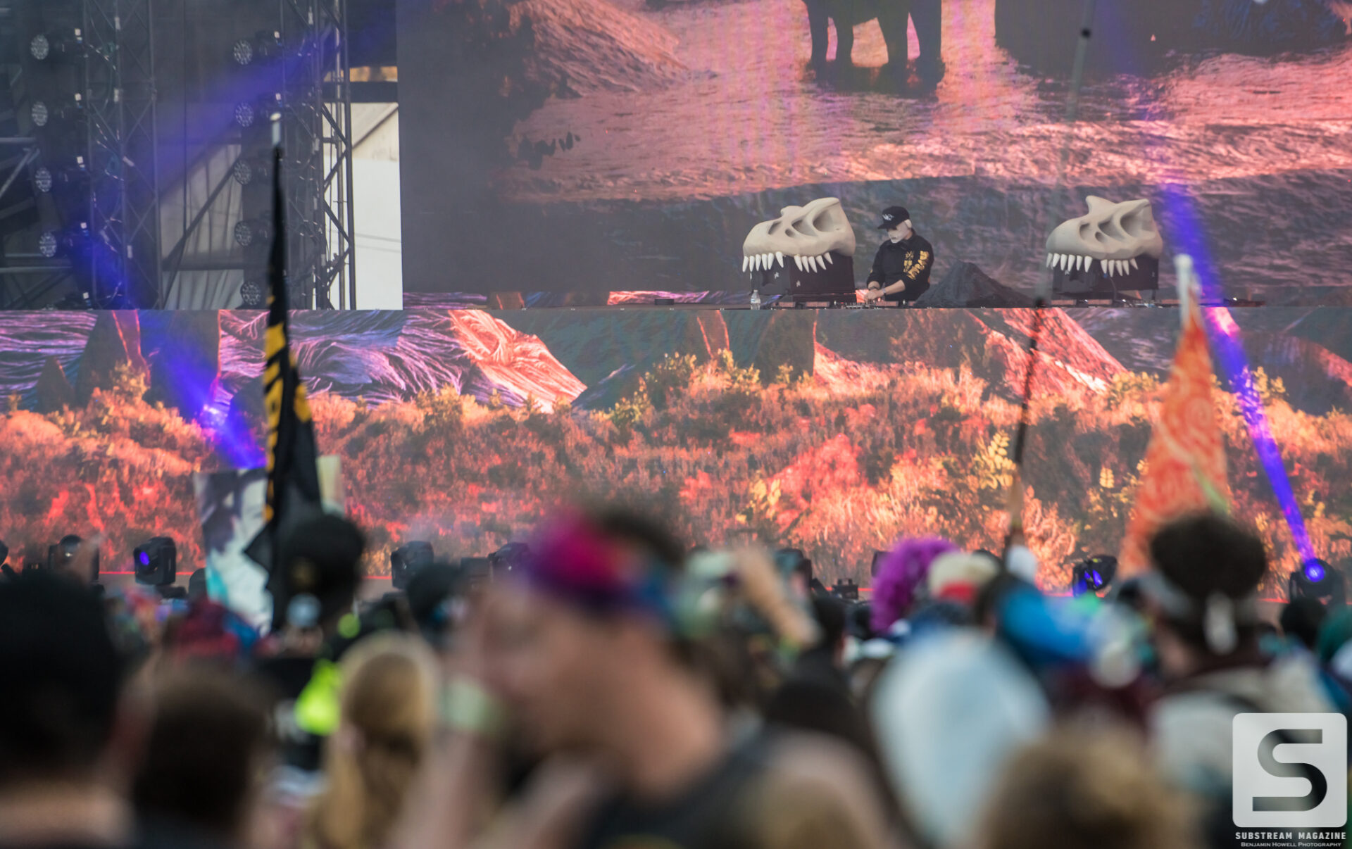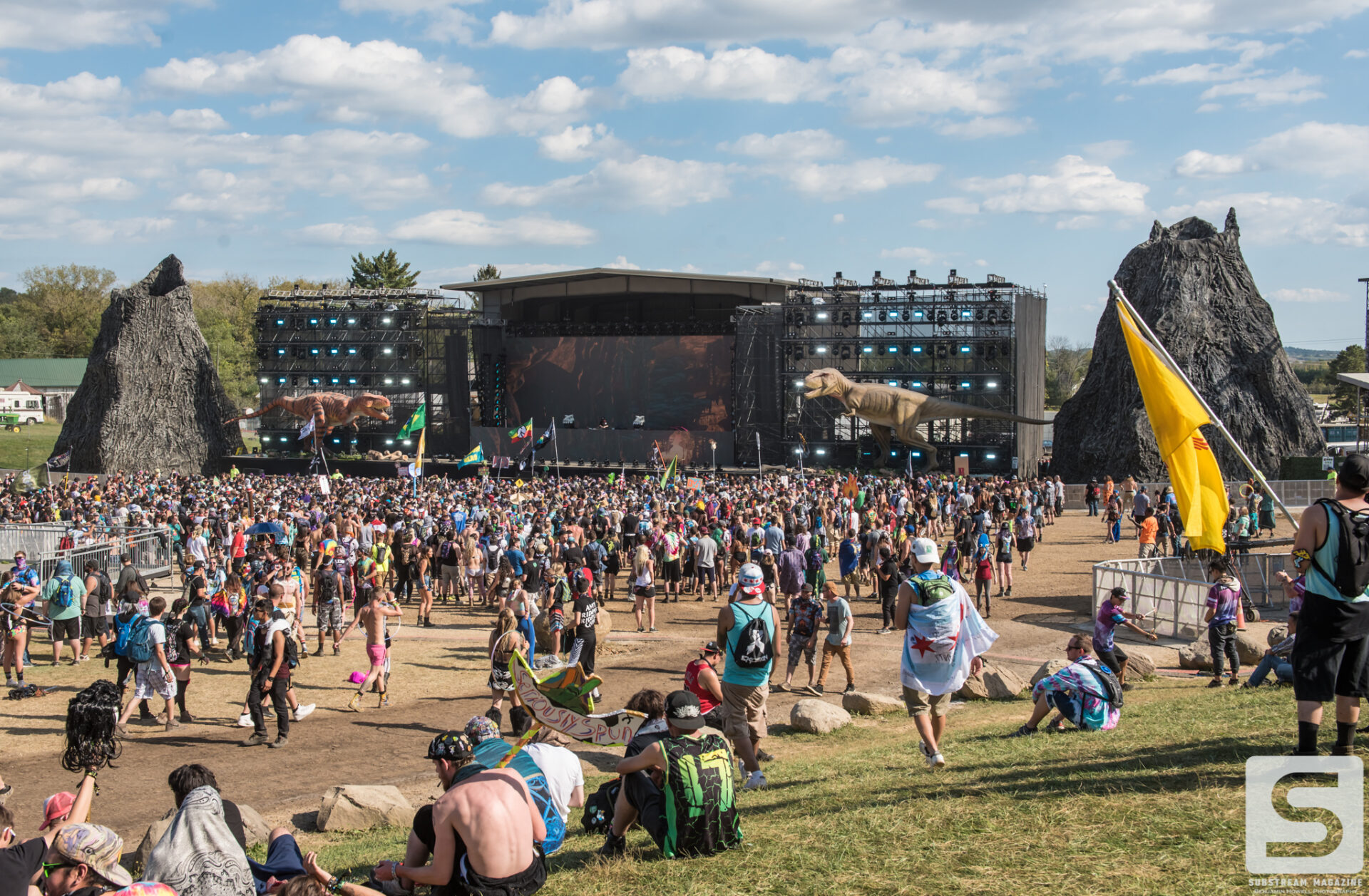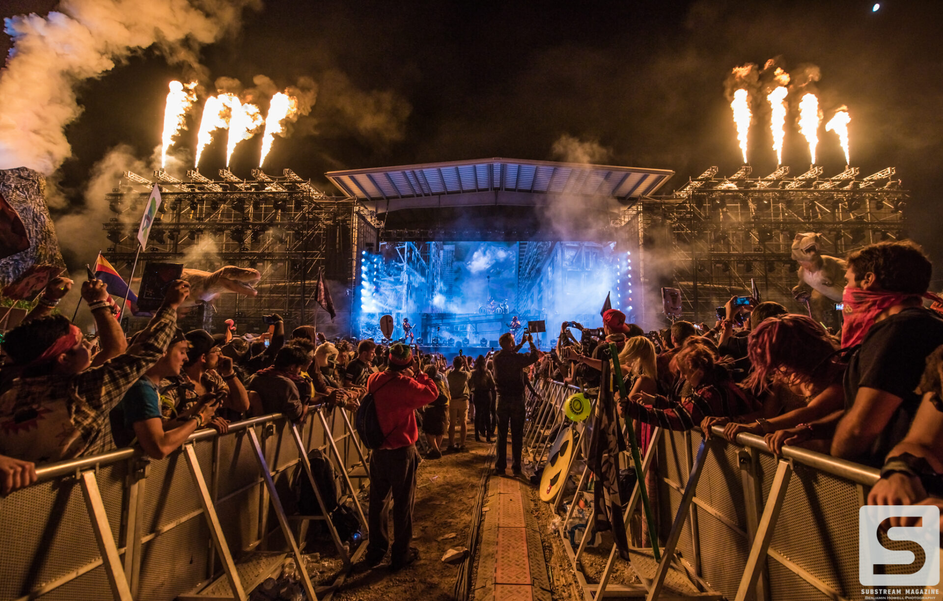 As I made my first approach towards the Prehistoric Paradox stage I was completely awestruck by the level of production, the amount of speakers, and the two enormous tyrannosauruses that were perched on each side. The size of the volcanos was astonishing and I could not wait to see what they looked like shooting fire. My mind began to race with ideas of shots, and then it hit me – he had already pulled it off. I’ve covered festivals all summer long and with just a few steps into this enchanted land I was already blown away by the amount of imagination and work that had gone into it. When I turned around I noticed a large brachiosaurus head hovering above the trees. As I approached it, I couldn’t believe how massive it was. It was easily the size of a 10 story building and by far the largest structure I have ever seen constructed solely for a music festival.