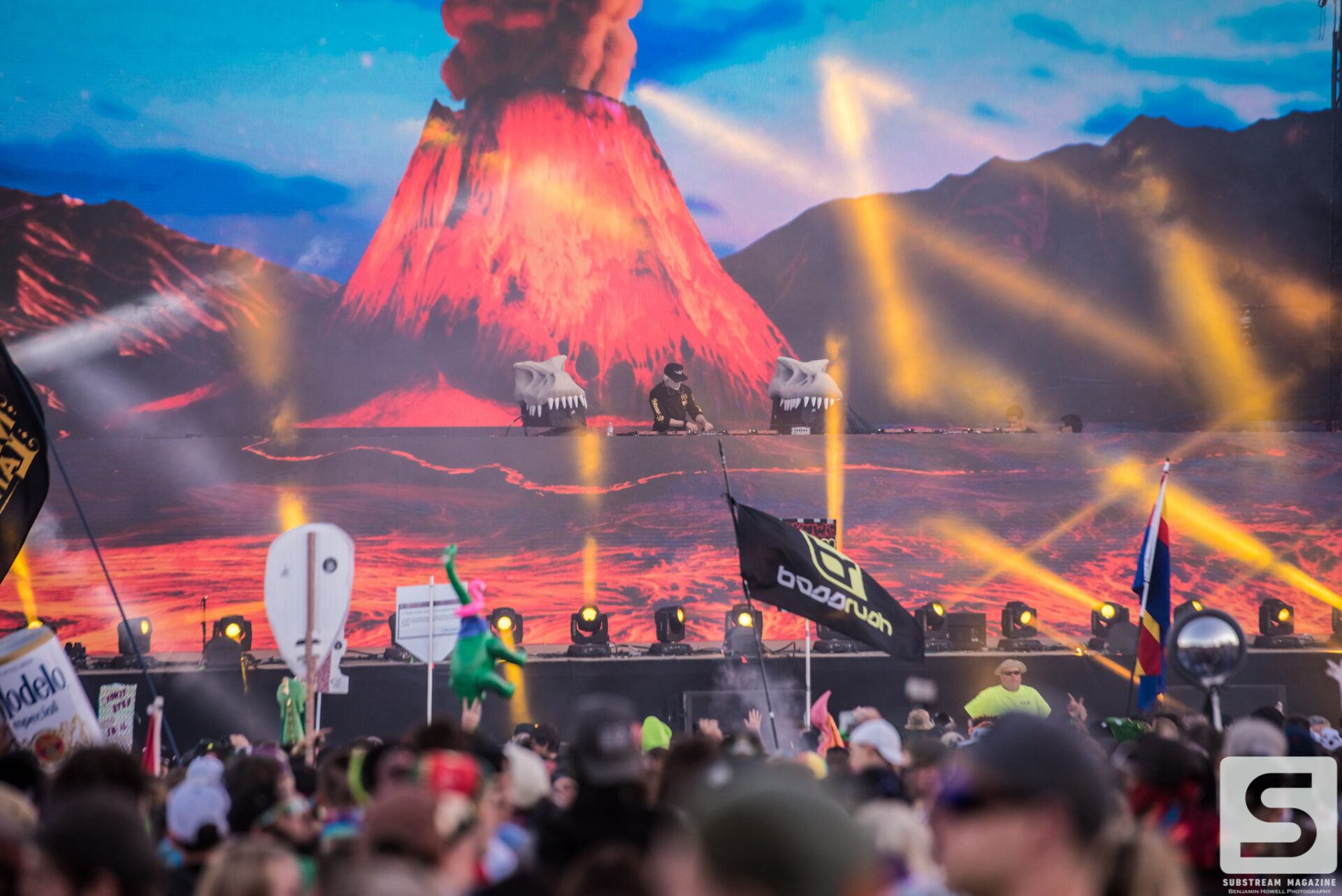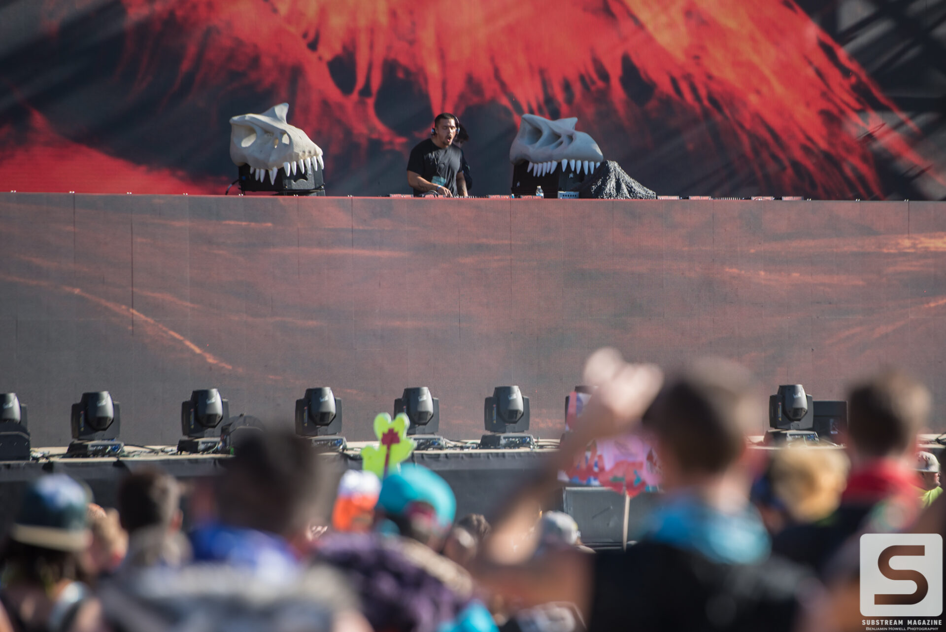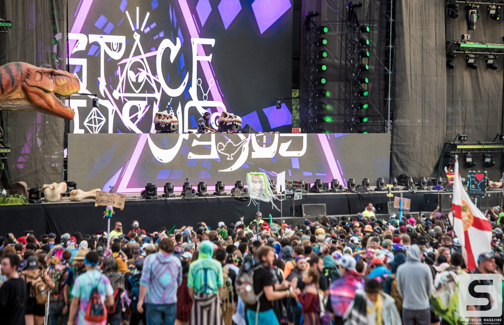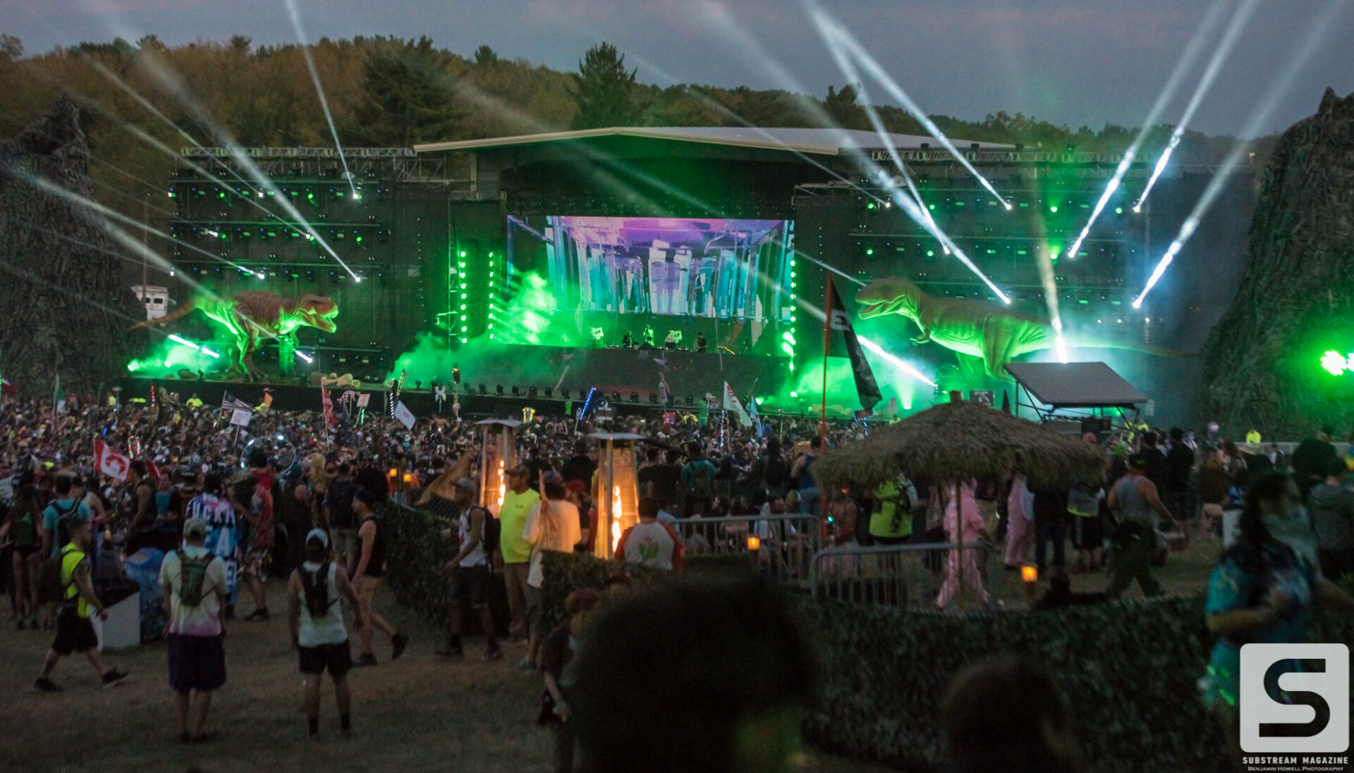 As I made my first approach towards the Prehistoric Paradox stage I was completely awestruck by the level of production, the amount of speakers, and the two enormous tyrannosauruses that were perched on each side. The size of the volcanos was astonishing and I could not wait to see what they looked like shooting fire. My mind began to race with ideas of shots, and then it hit me – he had already pulled it off. I’ve covered festivals all summer long and with just a few steps into this enchanted land I was already blown away by the amount of imagination and work that had gone into it. When I turned around I noticed a large brachiosaurus head hovering above the trees. As I approached it, I couldn’t believe how massive it was. It was easily the size of a 10 story building and by far the largest structure I have ever seen constructed solely for a music festival.