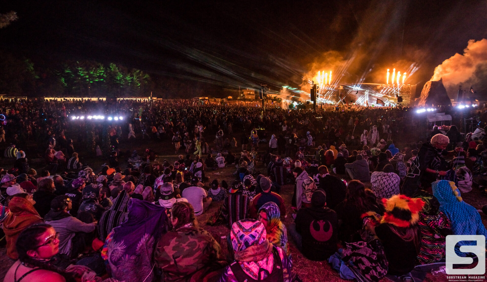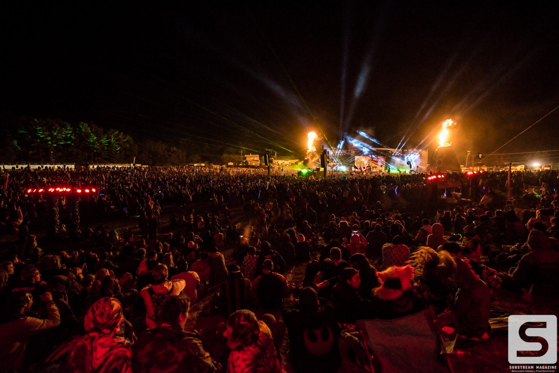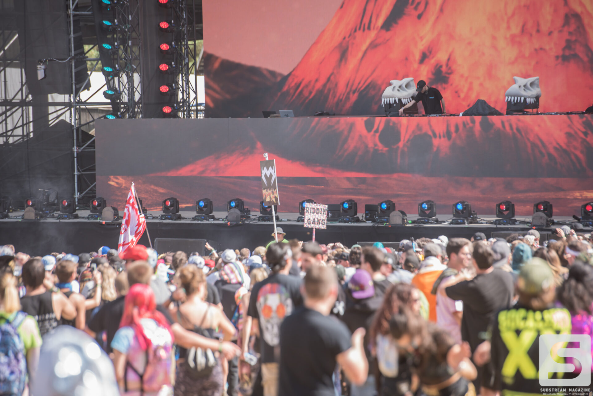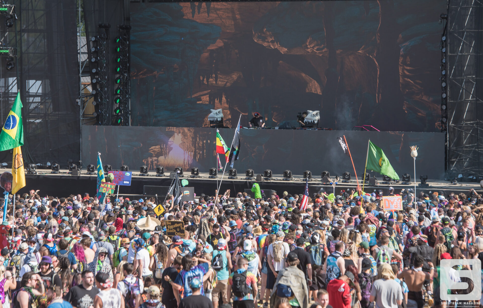 Everyone seemed to have a favorite day, mine was the second. I spent the majority of the day capturing as many artists as I could, from Sullivan King to Cookie Monsta, Snails, Black Tiger Sex Machine and many more. It was costume day, so no matter which way you turned there was always something interesting to see. During the early afternoon I ran across a brawl with over 30 inflatable dinosaurs that was hilarious to watch. But the real highlight for me came when Destroid (Excision/Downlink/KJ Sawka) took the stage in their fully illuminated suits. Everyone on the production team seemed to really be going the extra mile for this set, which is why I wasn’t entirely surprised when I first heard the sound cut out. Initially I figured something had just blown, but then I saw a some flickering flames and heard a voice come across the speakers saying, “I think we just destroyed the stage.” Running back to grab my camera, I managed to snag a quick shot of the flames before they went out. The crowd politely moved back out of harm’s way, and the Paradox stage was shut down for about 20 minutes before being allowed to resume without pyro for the rest of the night. As of Saturday night the festival was 100% sold out.