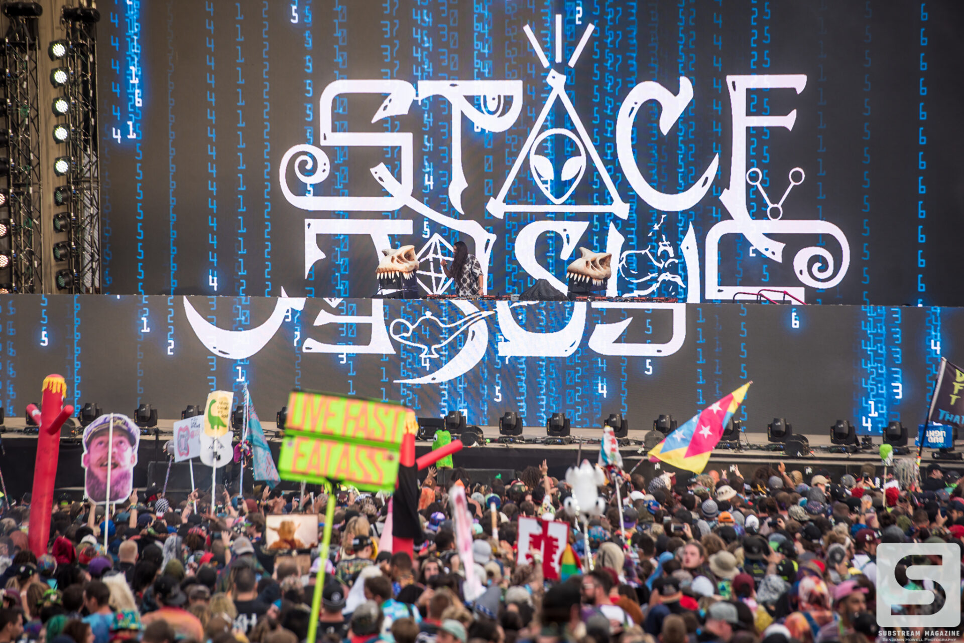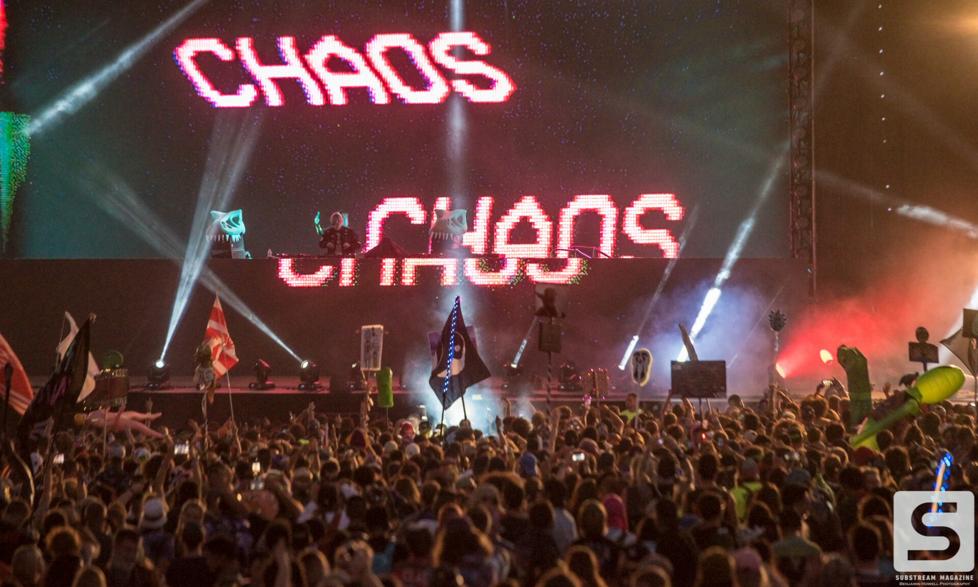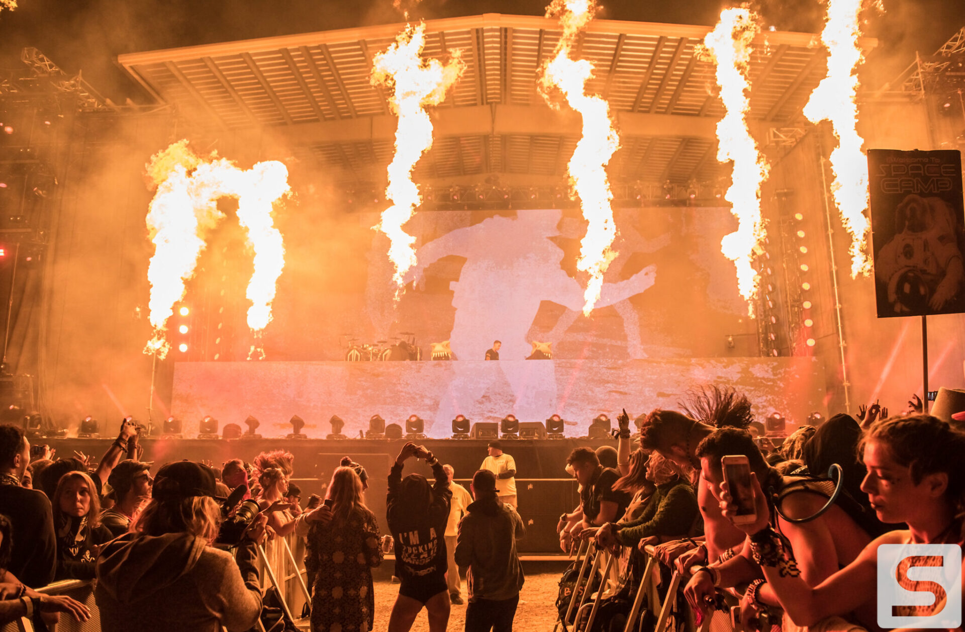Everyone seemed to have a favorite day, mine was the second. I spent the majority of the day capturing as many artists as I could, from Sullivan King to Cookie Monsta, Snails, Black Tiger Sex Machine and many more. It was costume day, so no matter which way you turned there was always something interesting to see. During the early afternoon I ran across a brawl with over 30 inflatable dinosaurs that was hilarious to watch. But the real highlight for me came when Destroid (Excision/Downlink/KJ Sawka) took the stage in their fully illuminated suits. Everyone on the production team seemed to really be going the extra mile for this set, which is why I wasn’t entirely surprised when I first heard the sound cut out. Initially I figured something had just blown, but then I saw a some flickering flames and heard a voice come across the speakers saying, “I think we just destroyed the stage.” Running back to grab my camera, I managed to snag a quick shot of the flames before they went out. The crowd politely moved back out of harm’s way, and the Paradox stage was shut down for about 20 minutes before being allowed to resume without pyro for the rest of the night. As of Saturday night the festival was 100% sold out.