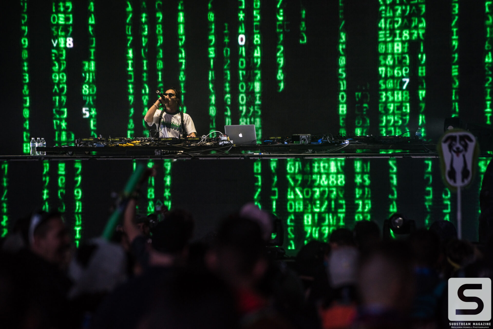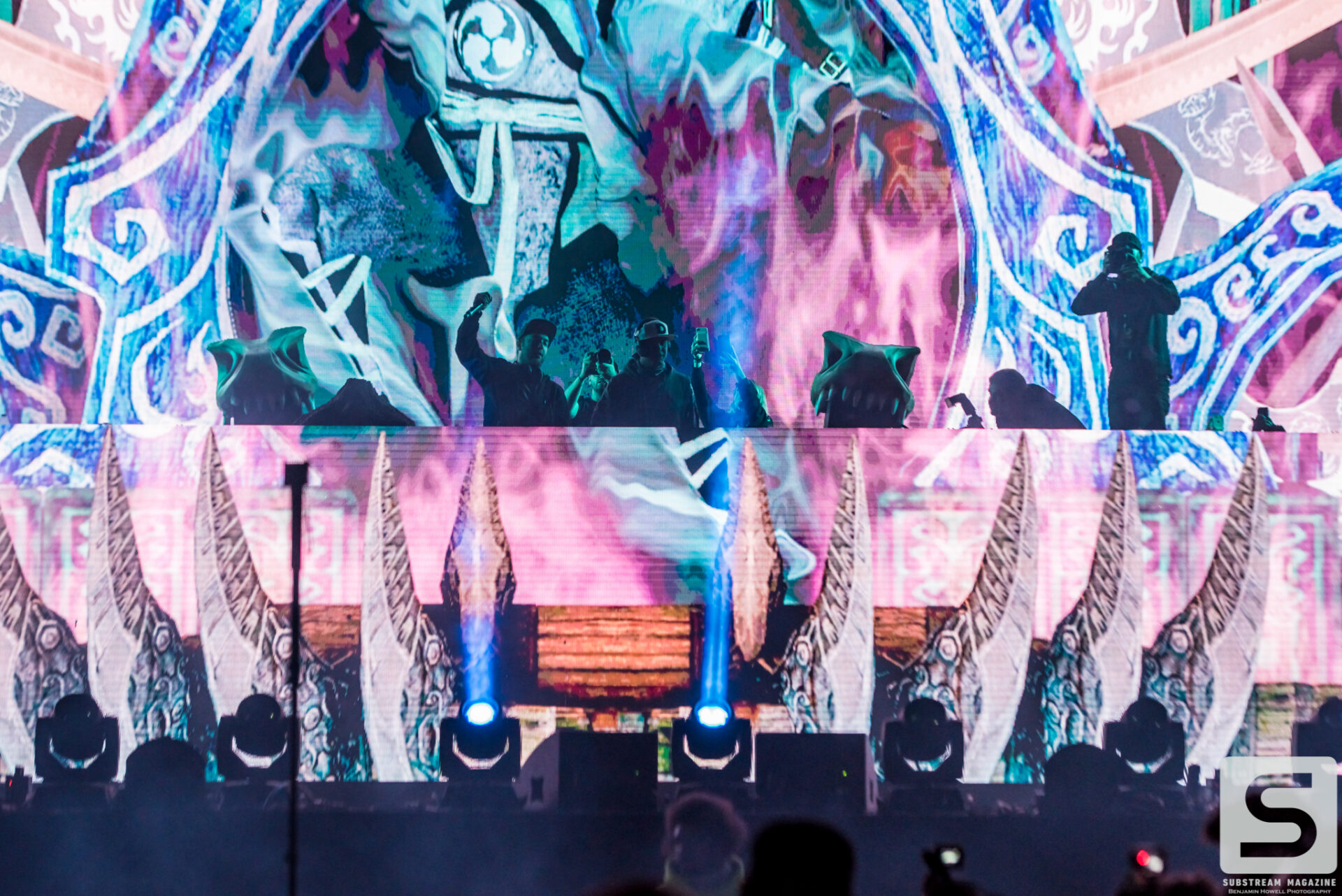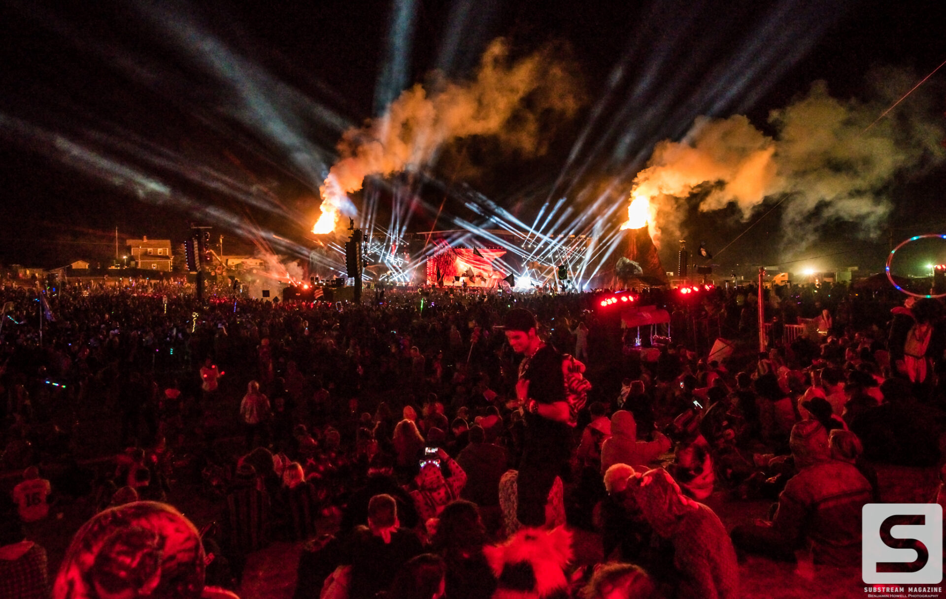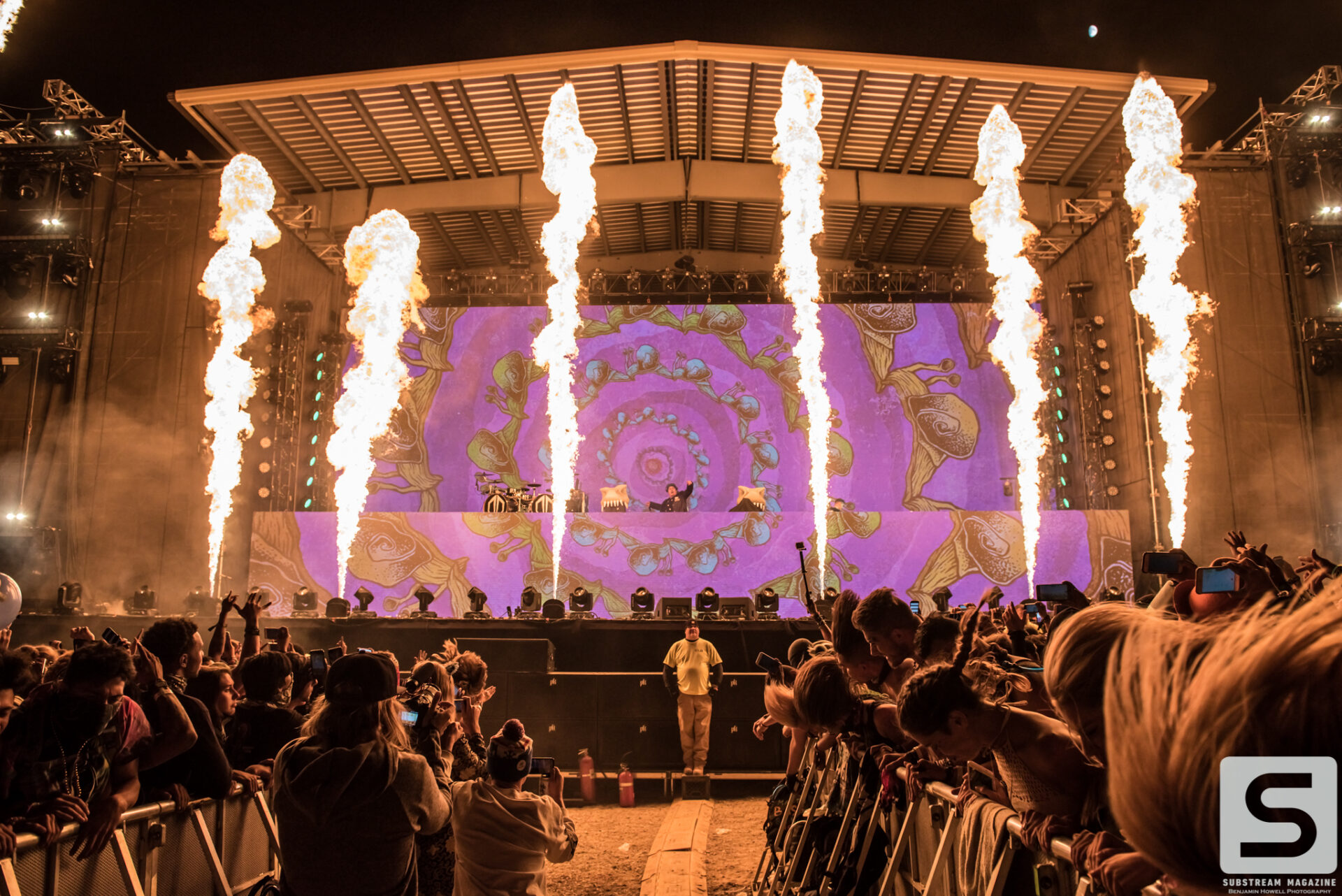 With such an incredible lineup, it’s hard to pick highlights from the evening, but nobody will forget when Excision finally took the stage. The headbangers had secured their spots on the rail that ran all the way from the stage, through the crowd, and to the sound booth. Smoke was rolling from the volcanos. We finally hear his voice, “Loooosssst Lannnnndss,” and the crowd goes completely berserk. The lights go down and the intro music for Jurassic Park begins to play. Minutes later his set begins with fire shooting from every part of the stage and the volcanos erupting into the sky with green, pink and orange flames. The Paradox lights up with the visuals that most of us have only seen in cell phone videos and it’s completely breathtaking. Everyone in the crowd is either losing their minds or frozen in a state of ecstasy. I have never experienced so much energy in all of my years of covering festivals, and the best part was there was still hours of talented artists left ahead of us. Even as the night approached 40 degrees, the crowd remained impressively active.