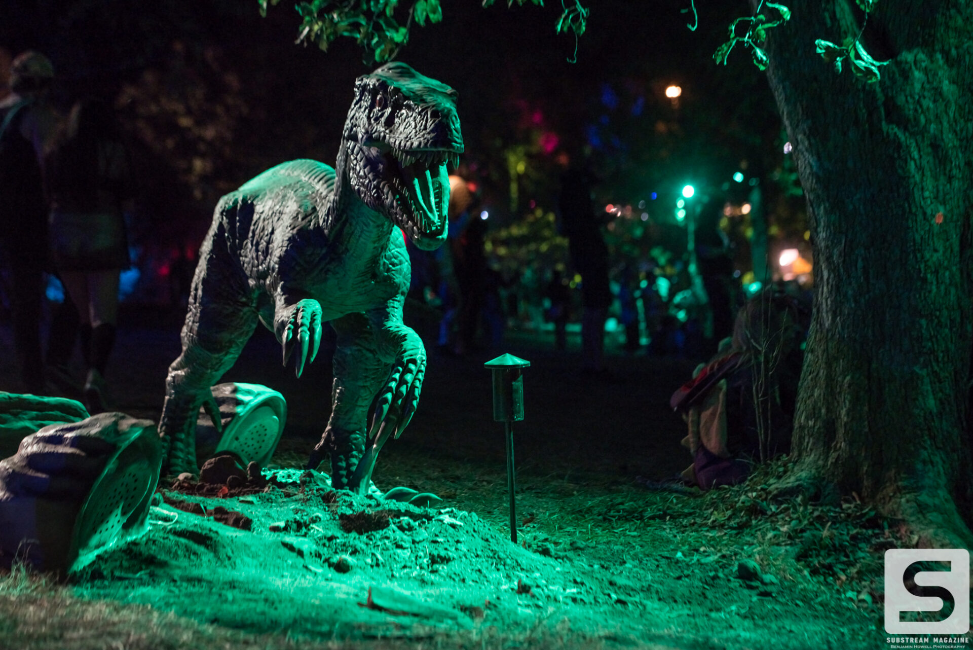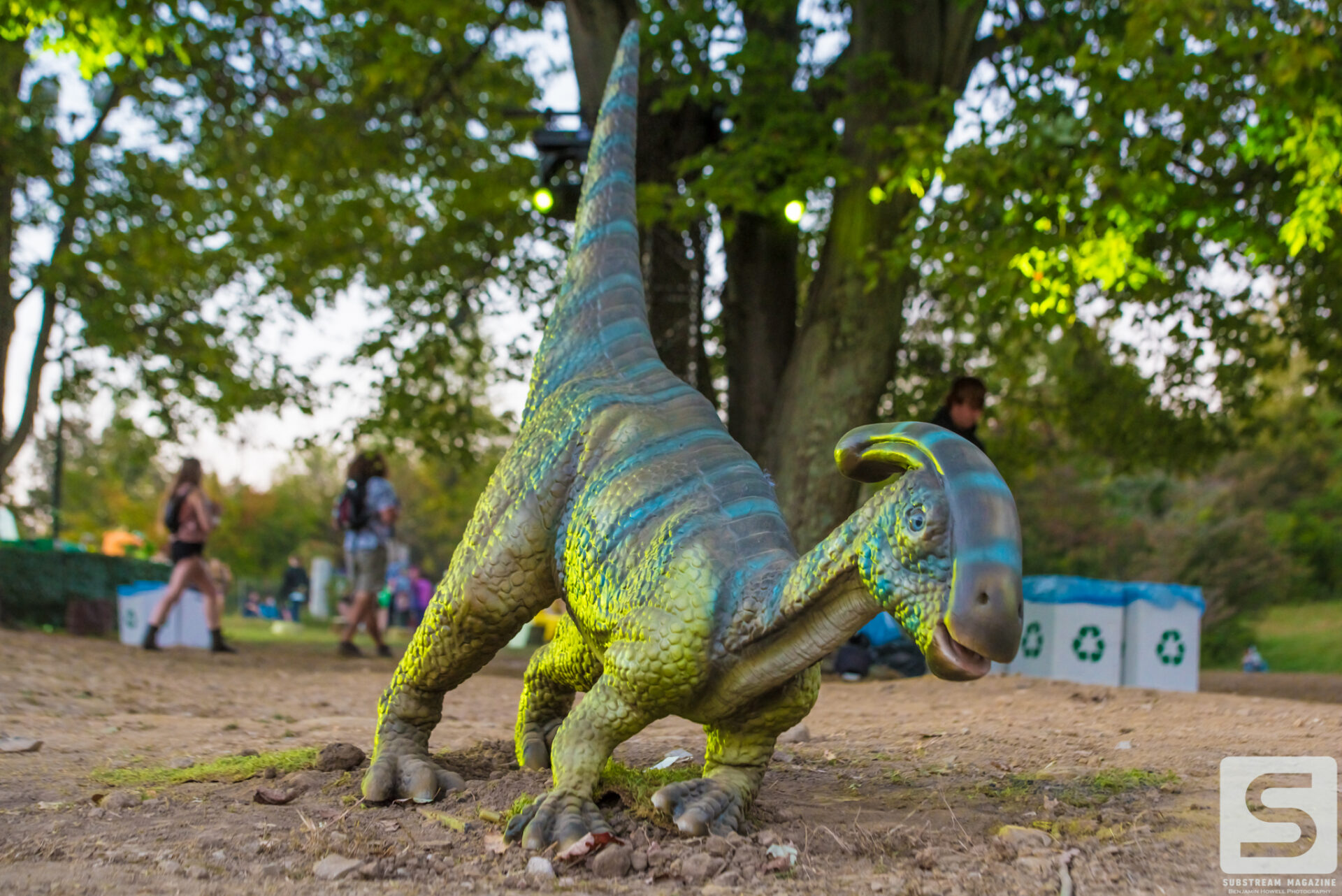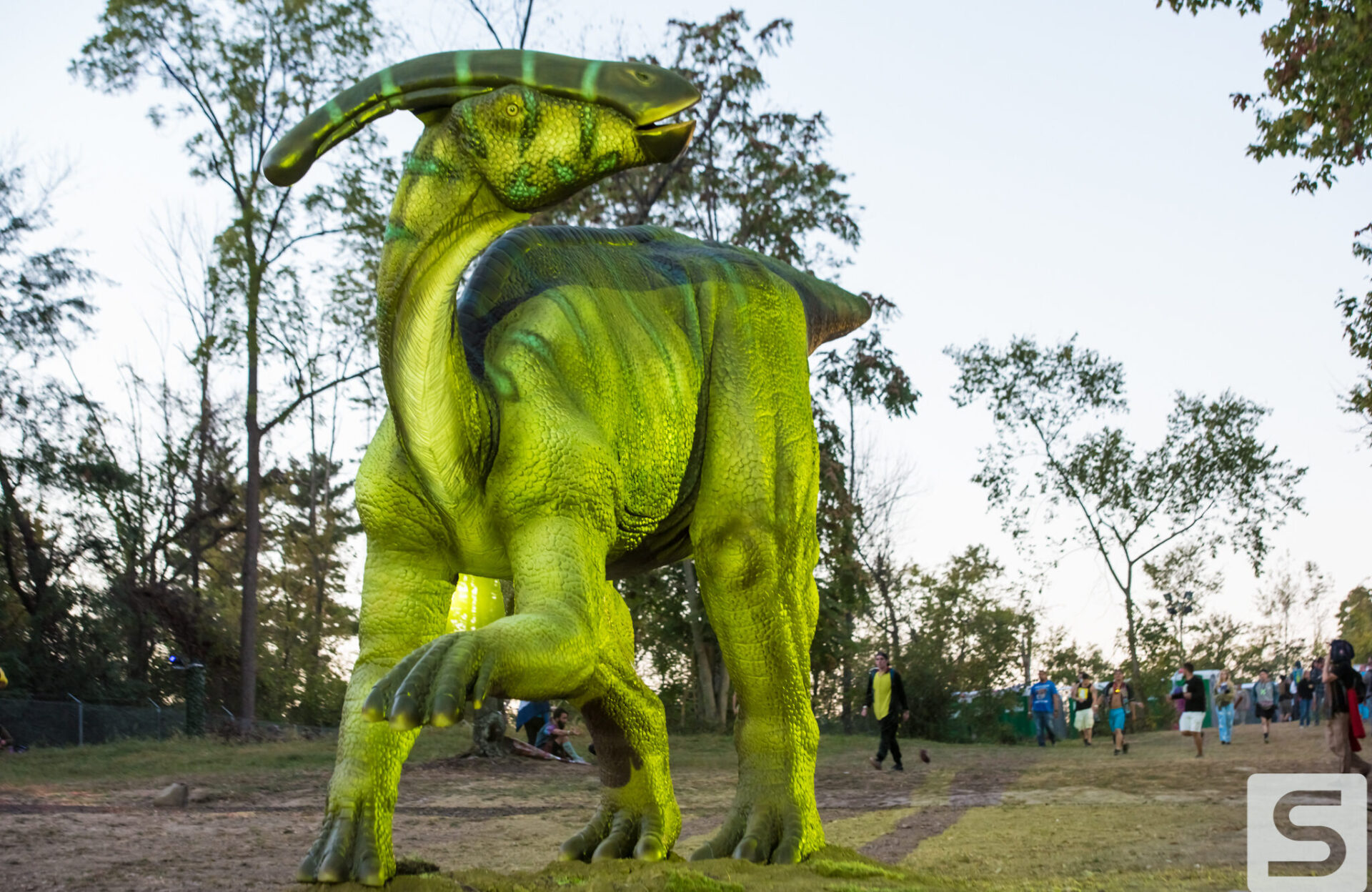As I met up with the rest of the media team for the walkthrough, I was still finding massive dinosaurs hidden all over the place. Throughout the walk we learned a ton of information, some that didn’t even seem to make sense. We learned that they purchased every available piece of ivy in the United States to line every fence of the venue, and that every tree was lit with LED lights. The building of the volcanos and the hanging of the lights around the venue took about two weeks. The volcanos had to be lifted by crane and placed into position. Each volcano weighs ~10,000 lbs. and shoot flames 70 feet into the air.