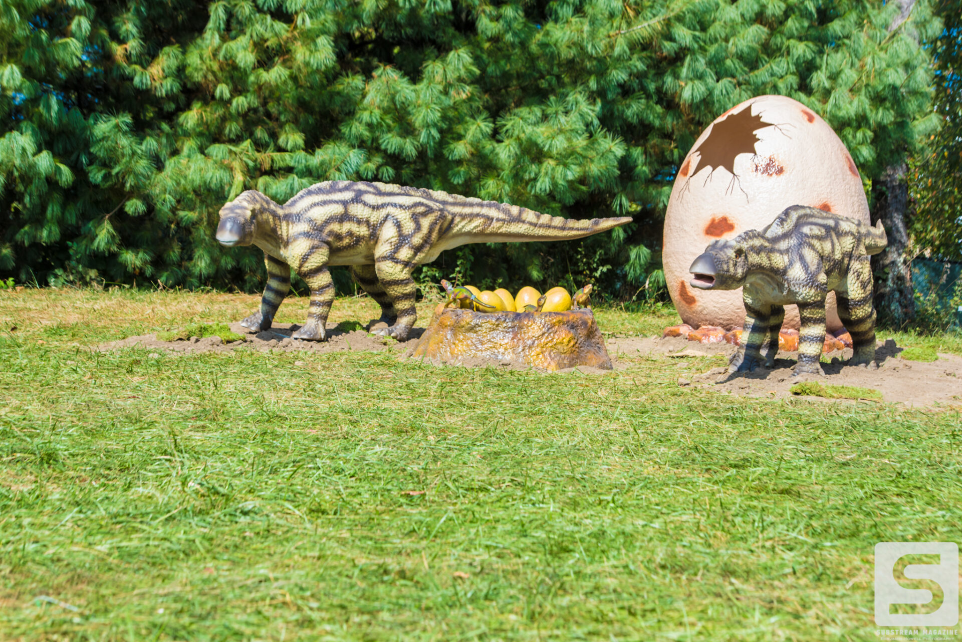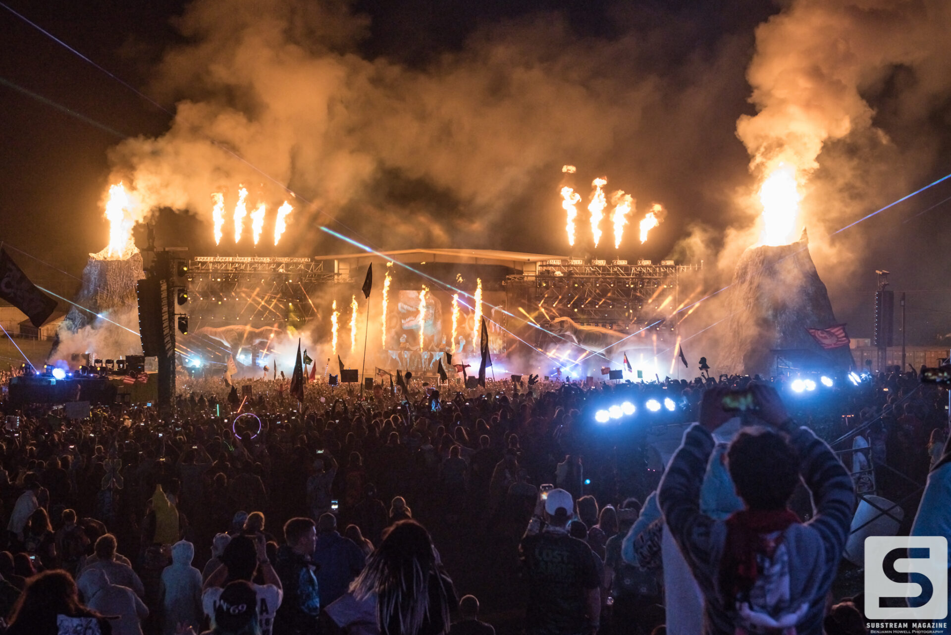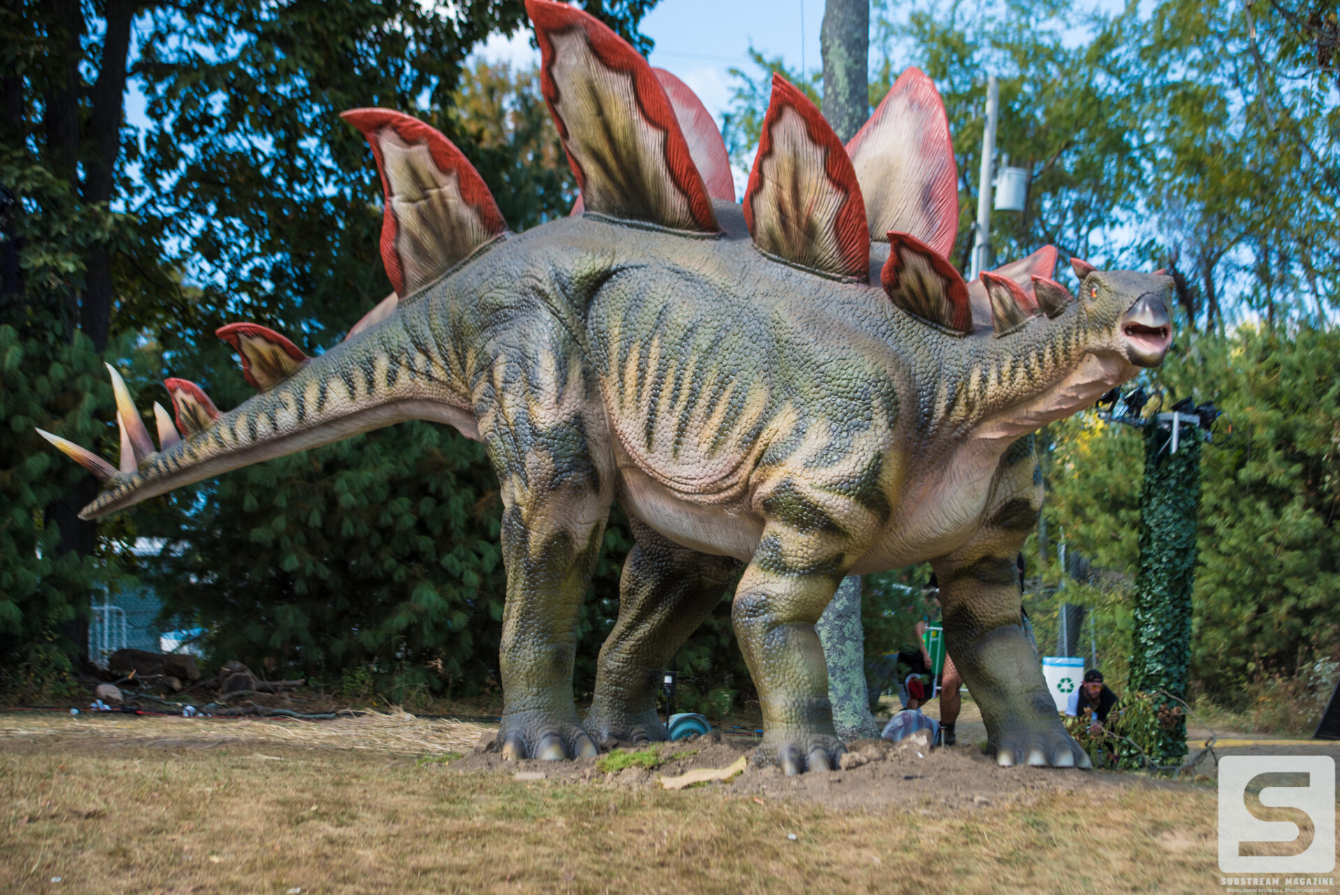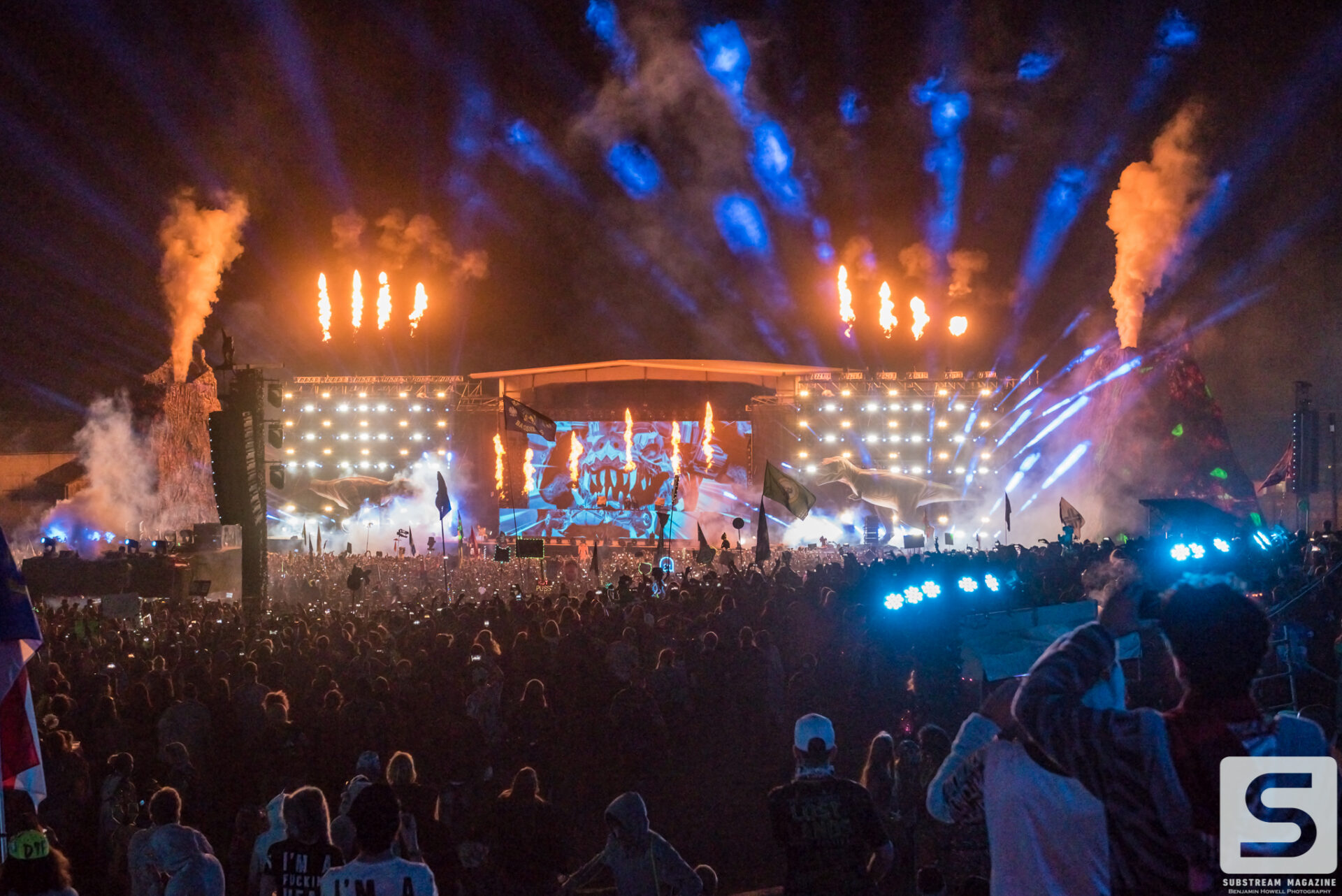 As I met up with the rest of the media team for the walkthrough, I was still finding massive dinosaurs hidden all over the place. Throughout the walk we learned a ton of information, some that didn’t even seem to make sense. We learned that they purchased every available piece of ivy in the United States to line every fence of the venue, and that every tree was lit with LED lights. The building of the volcanos and the hanging of the lights around the venue took about two weeks. The volcanos had to be lifted by crane and placed into position. Each volcano weighs ~10,000 lbs. and shoot flames 70 feet into the air.