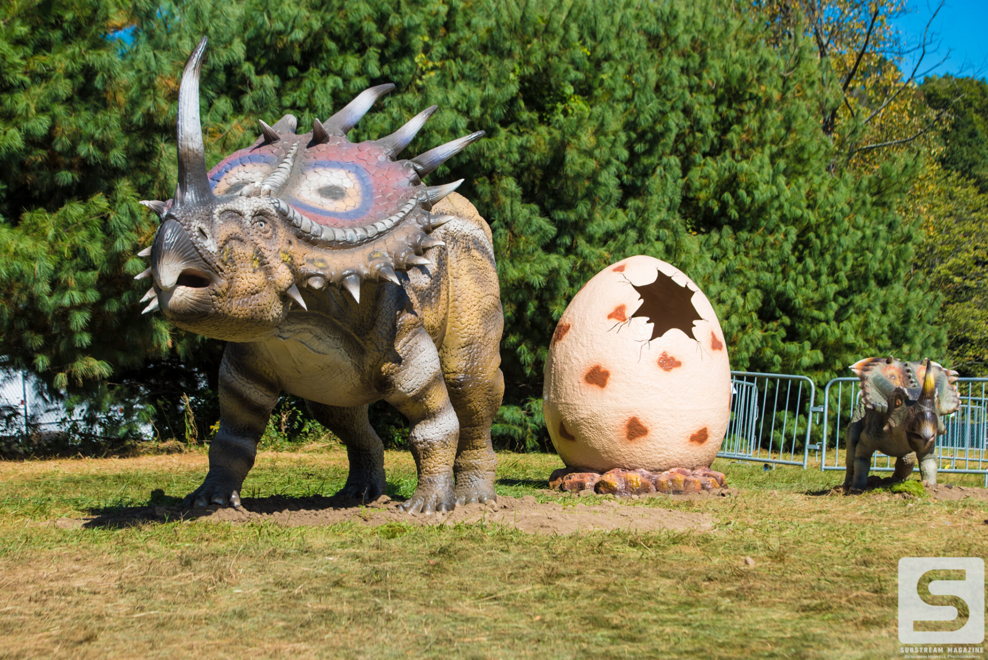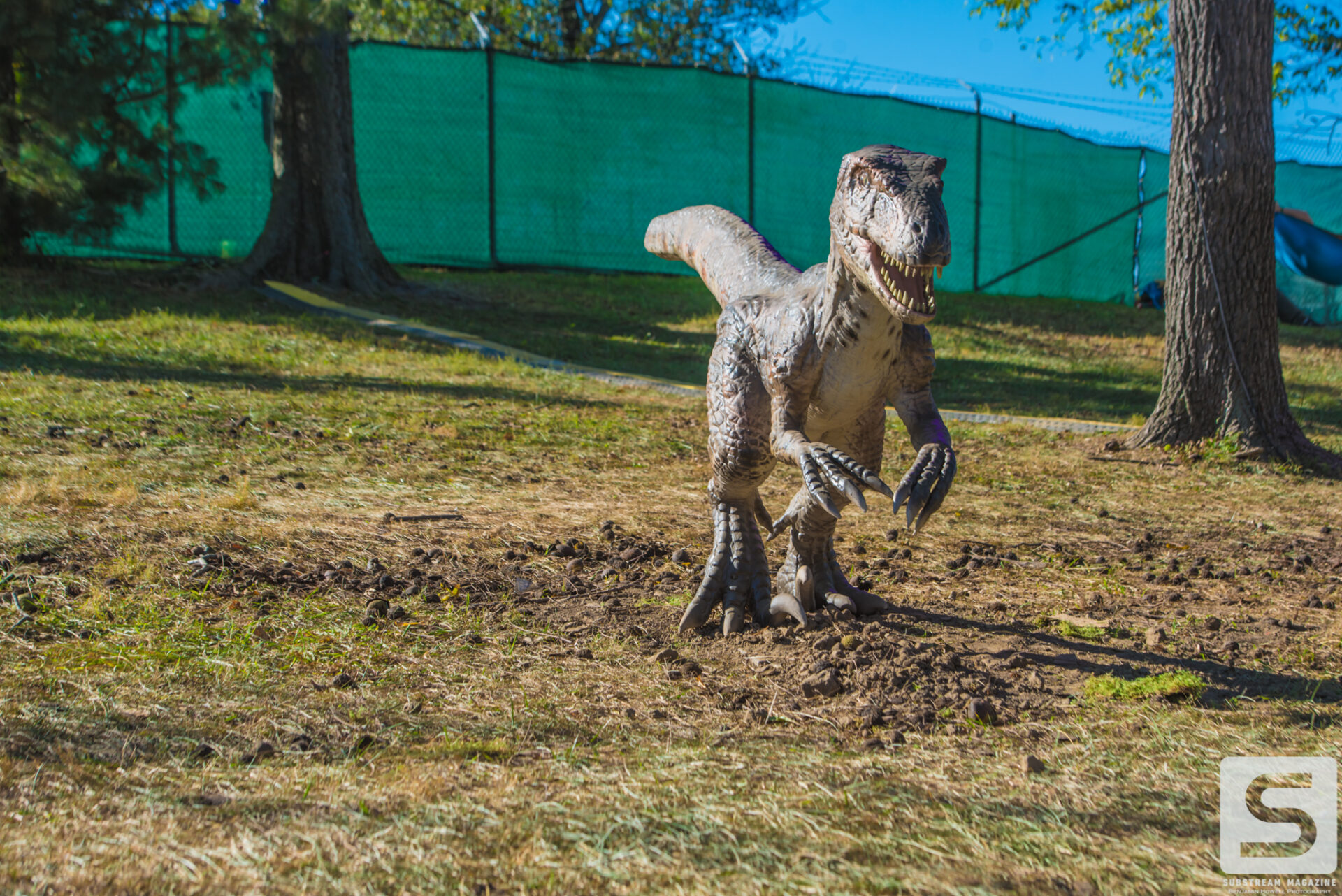 As I arrived at the Legend Valley Concert Venue in Thornville, OH early Friday morning, I was greeted by smiles and handshakes from everyone around. The staff were all extremely happy to be working and seemed to have a firm grasp on their responsibilities. Everything from obtaining passes to setting up camp was an absolute breeze. With a couple hours of free time, I decided to walk in and get a sneak peek before our media walkthrough. Every barrier in the festival was lined with ivy leaves to entice a feeling of being in the jungle. As I walked through the gates I was instantly blown away by the size and intricacy of the dinosaurs. As I approached one of the raptors it started flailing, biting and howling at me. Even during the day they were impressively terrifying, and all over the place.