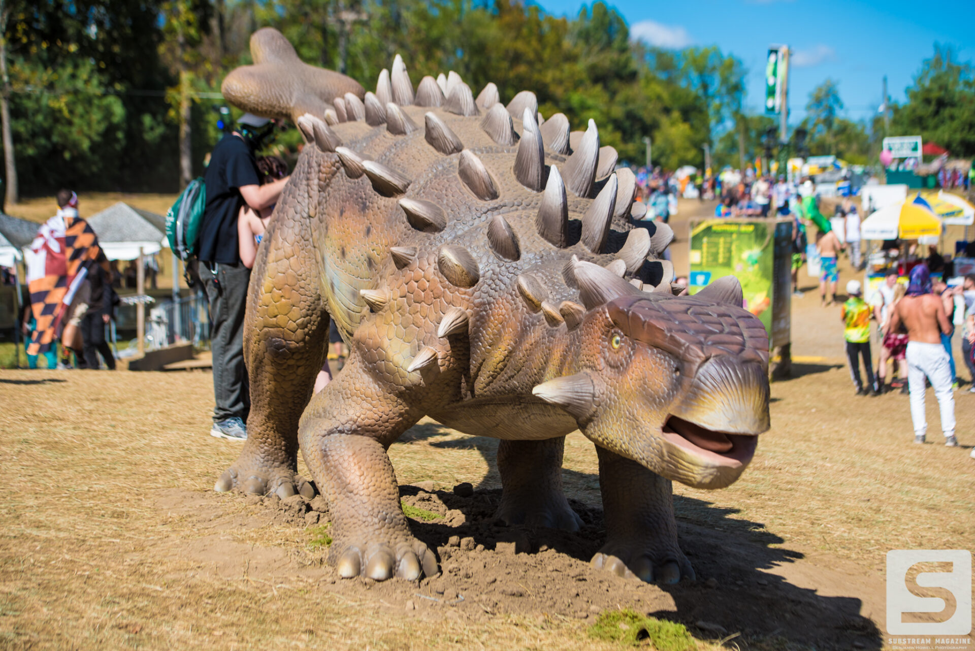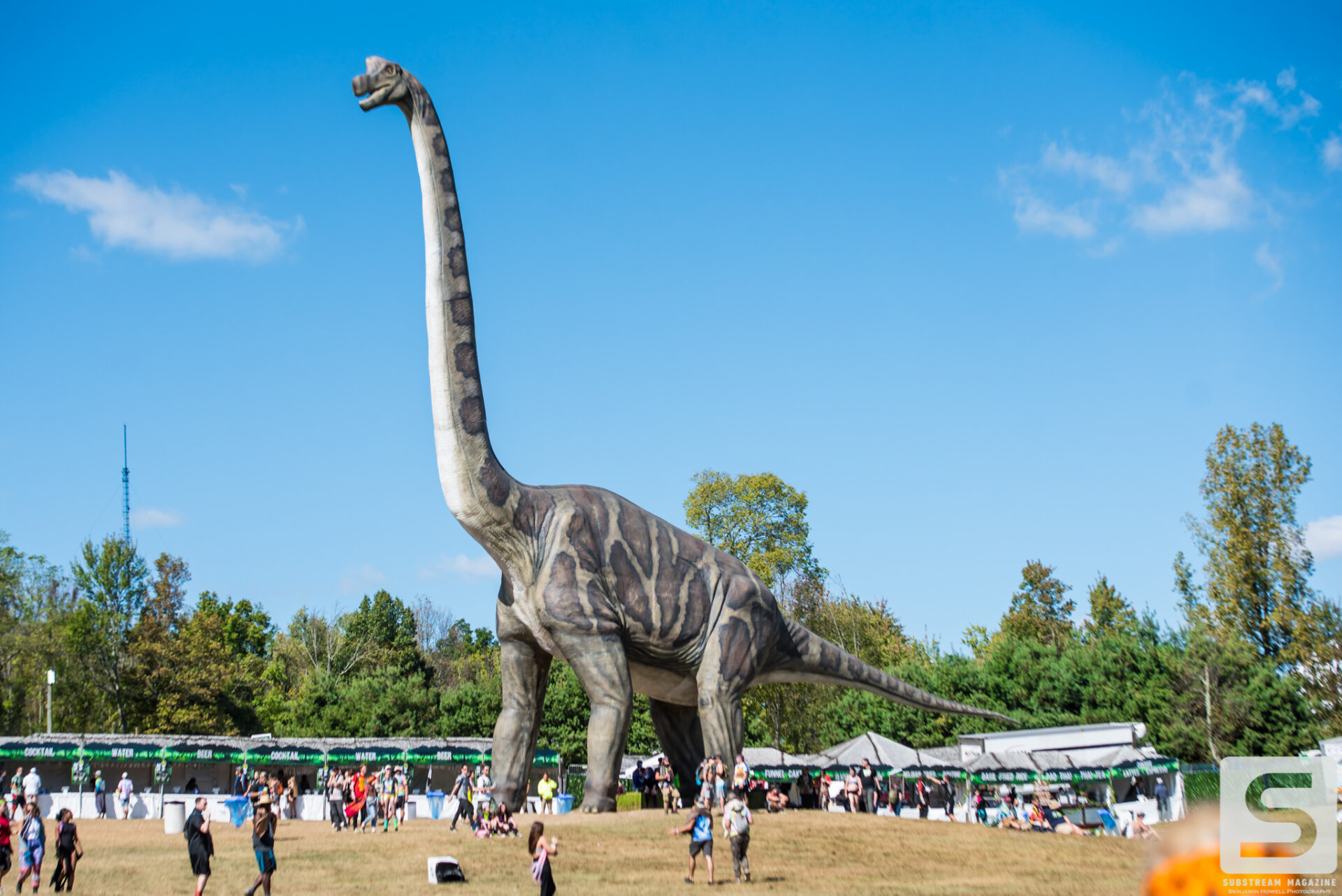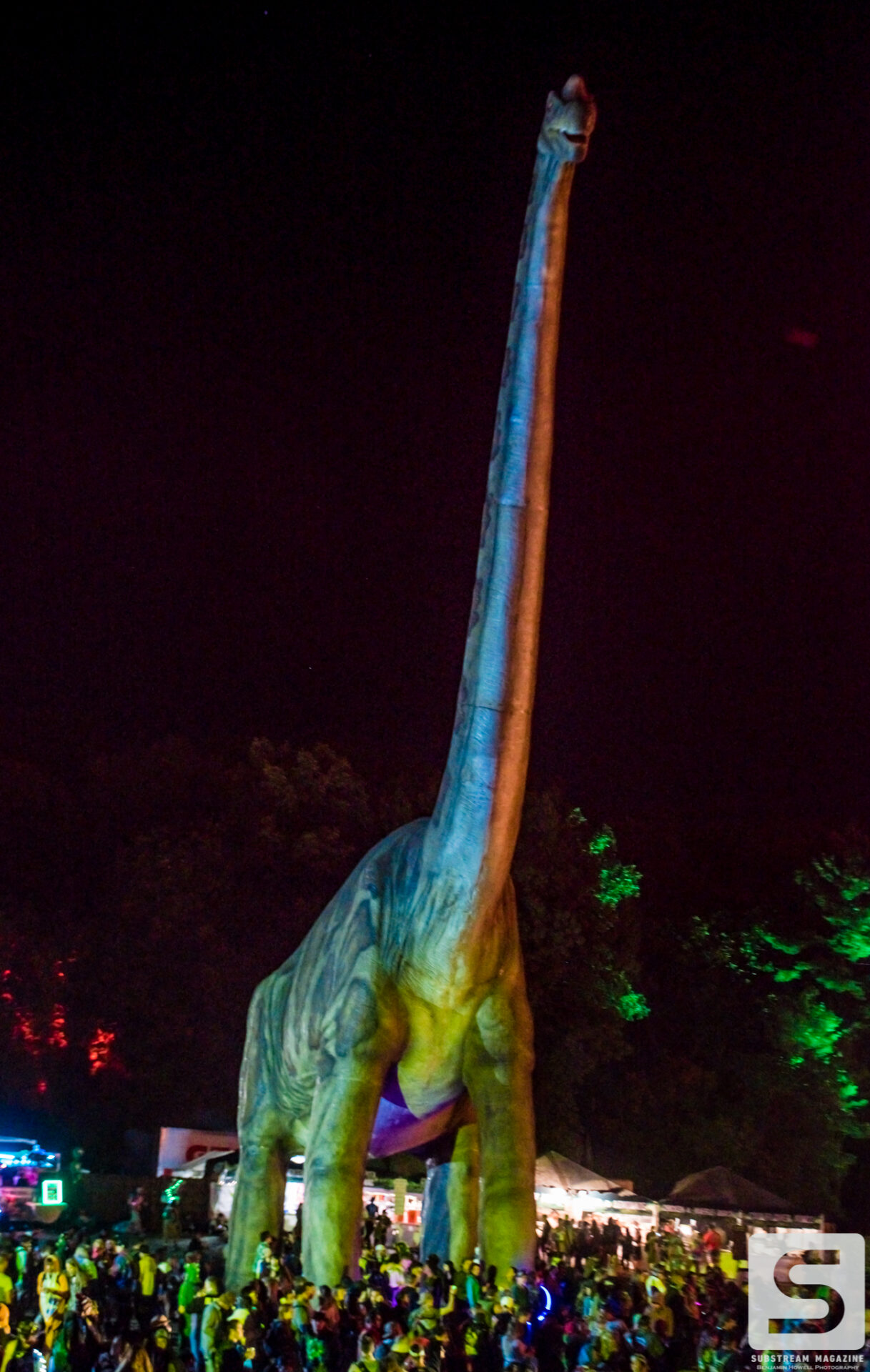 The dinosaurs were all created new for the Lost Lands Music Festival. They were made in China and sent over with three Chinese Nationalists that knew so little English that they couldn’t recognize greetings when they first arrived 4 days before the festival. Most of the dinosaurs required a few days to build, but the larger ones such as the brachiosaurus, were estimated to take 11 days. When the festival from the weekend before came to an end, they had to politely ask everyone to pack up and go as soon as possible so they could start building immediately. We were told the brachiosaurus was created to be life size and weighs over 18,000 lbs.