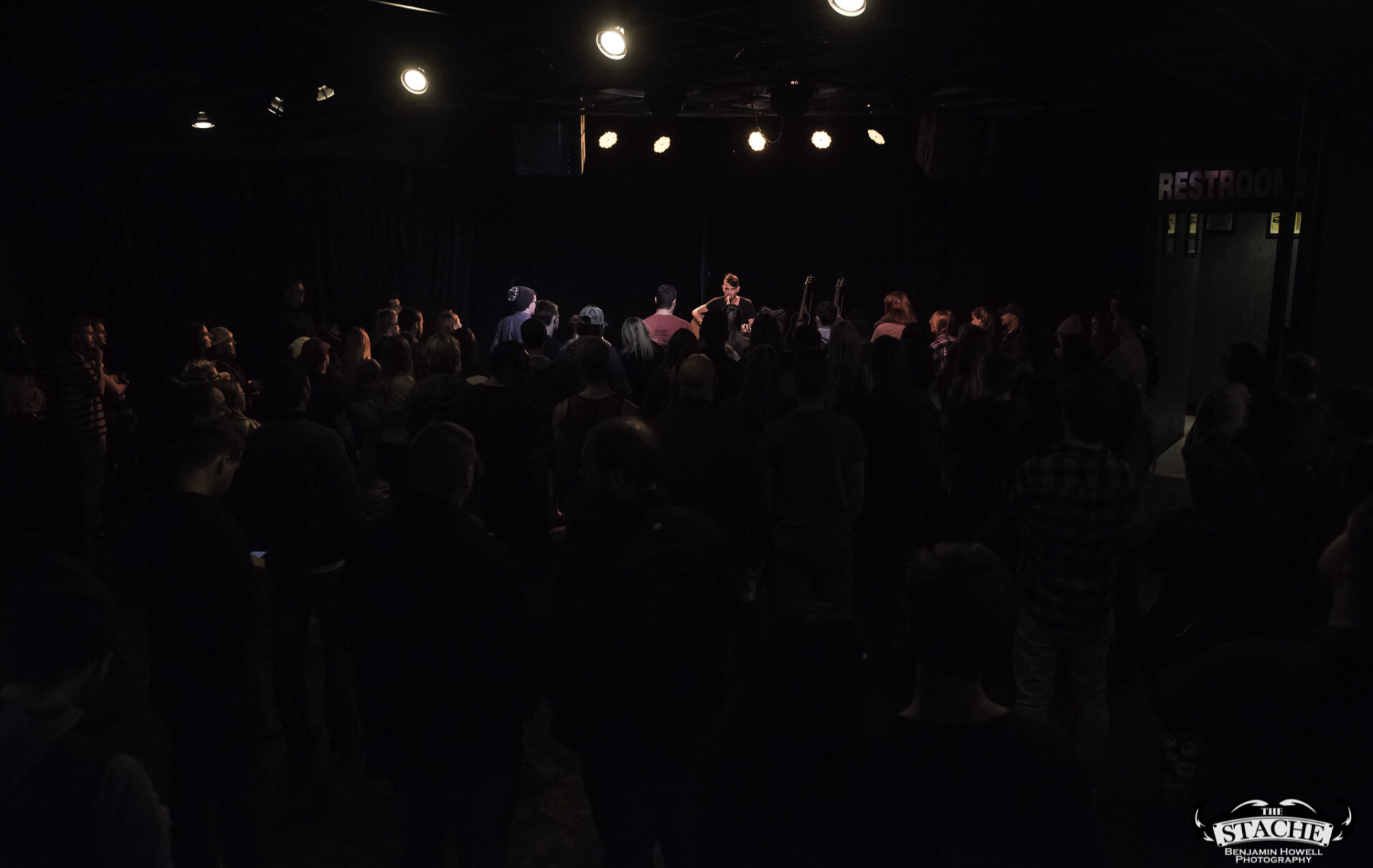 The wait between sets is not long. Most haven’t had time to order a second drink before the man of the hour makes his presence known. Dressed in a black leather jacket, black t-shirt, and black baseball cap (turned backwards), John Vesely enters The Stache seconds before he takes the stage. One eager fan greets him and awkwardly introduces his girlfriend. Vesely, ever the gentleman, stops and chats for a moment before saying something to his wife seated behind the merch table and moved through the crowd. He repeats the cause for celebration and performance before announcing he too will be sharing new material as the evening progresses. The crowd cheers.