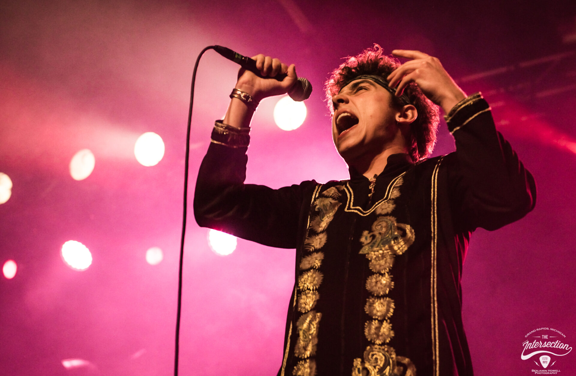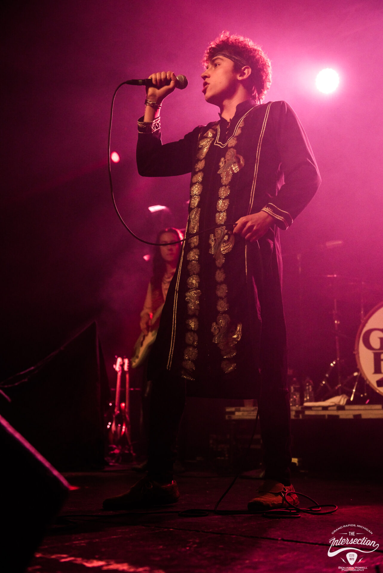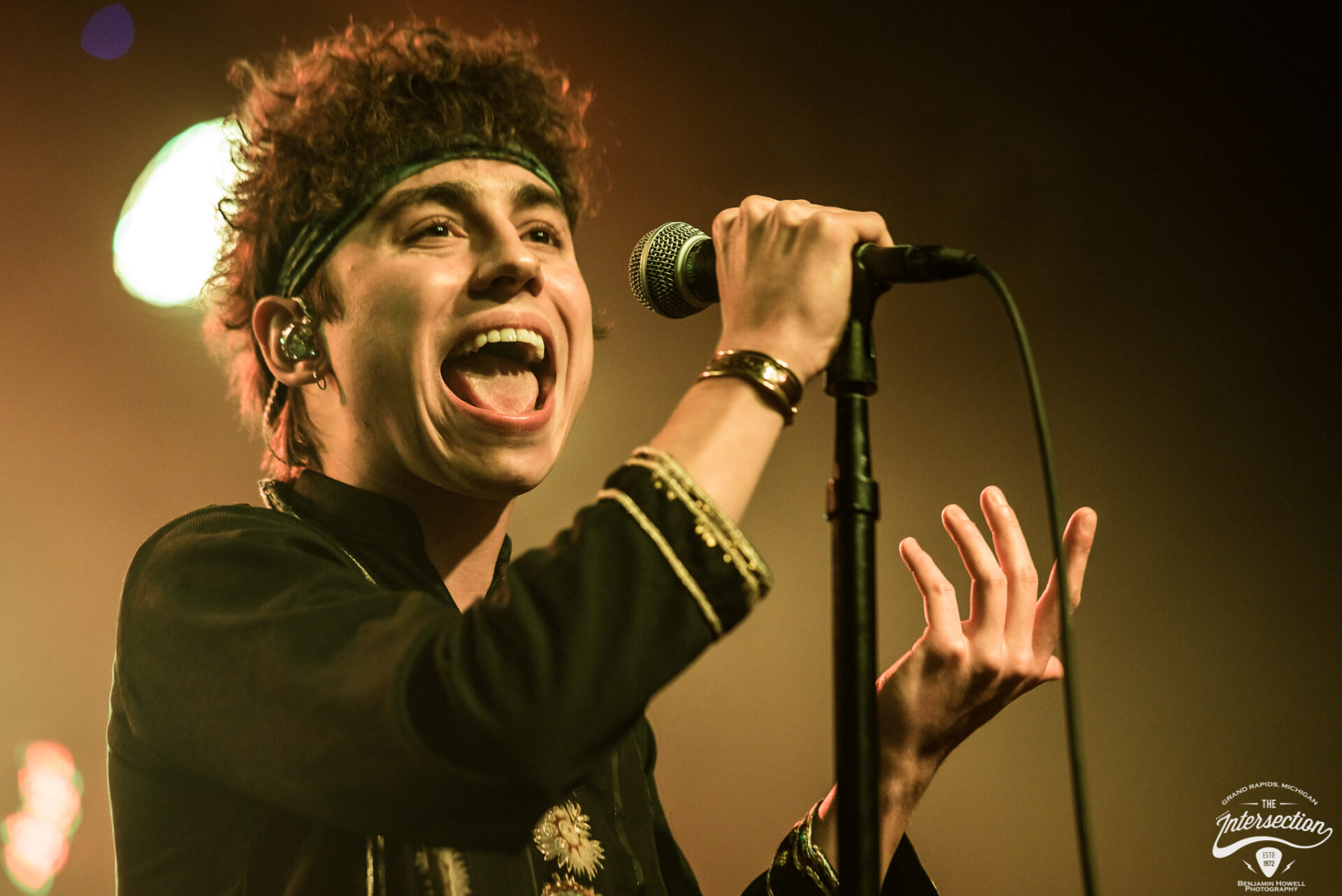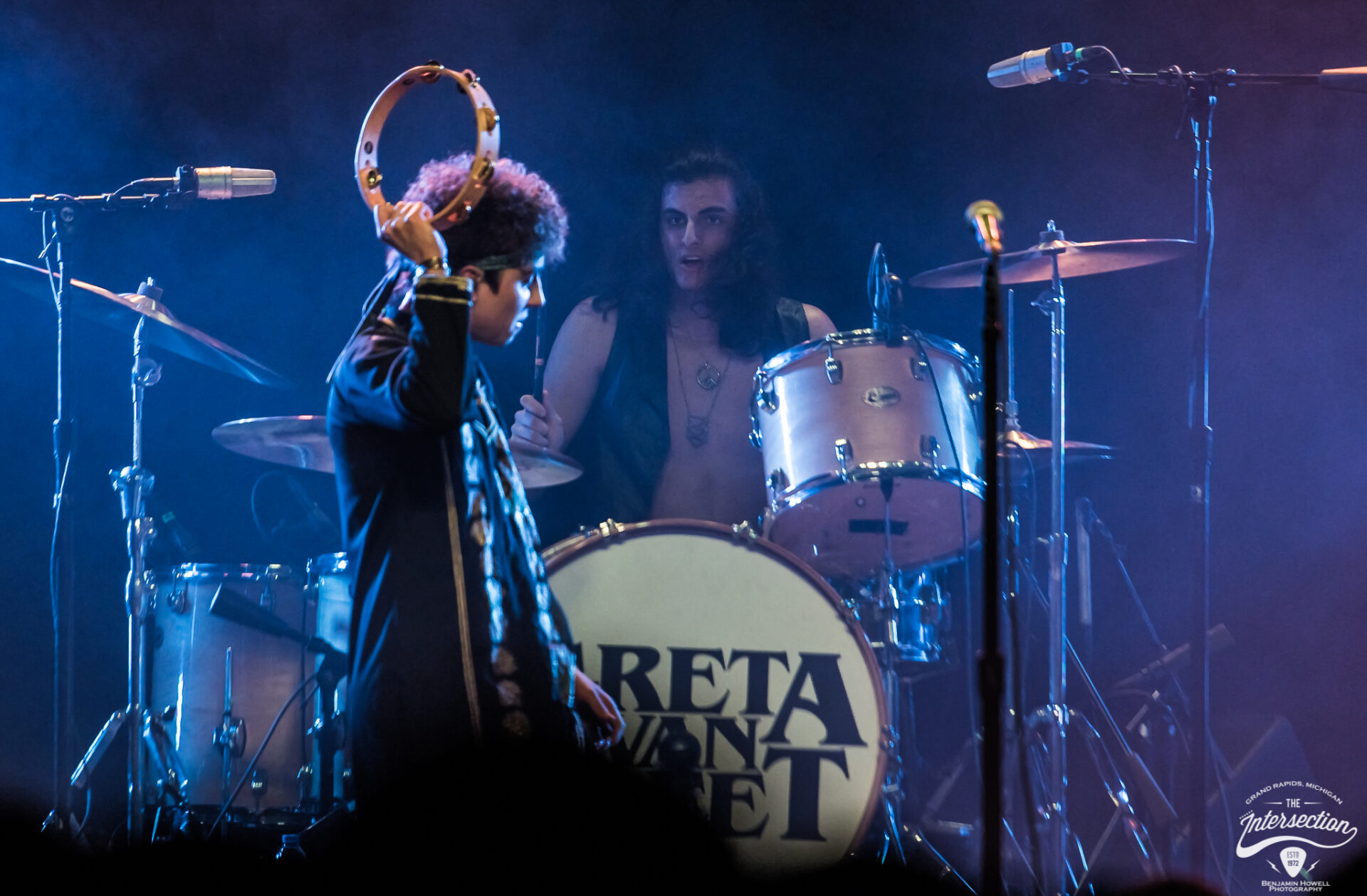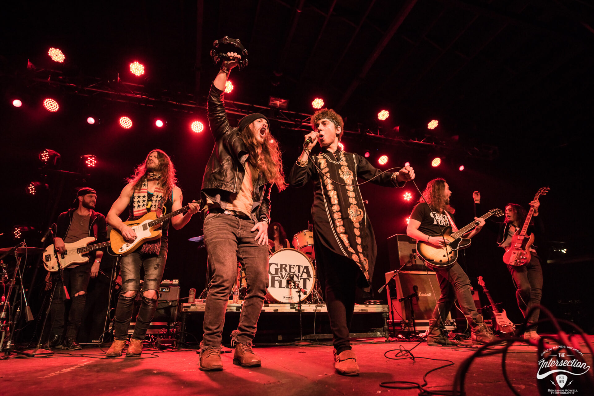 Greta Van Fleet’s sound guy rushed by a small gathering of media and VIP less than one minute prior to the scheduled set time, frantically looking for the fastest way to the front of the house. Photographer Ben Howell directed him around the densely packed crowd by suggesting he walk through the Michigan tundra outside, but the show was nonetheless delayed several minutes while a few final preparations are made. I returned to the bar and order a fresh drink while a carefully curated playlist of classic rock classics that had not yet been played to death by terrestrial radio keep the crowd humming with conversations.