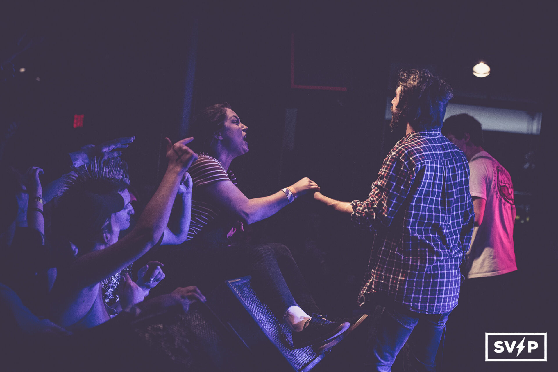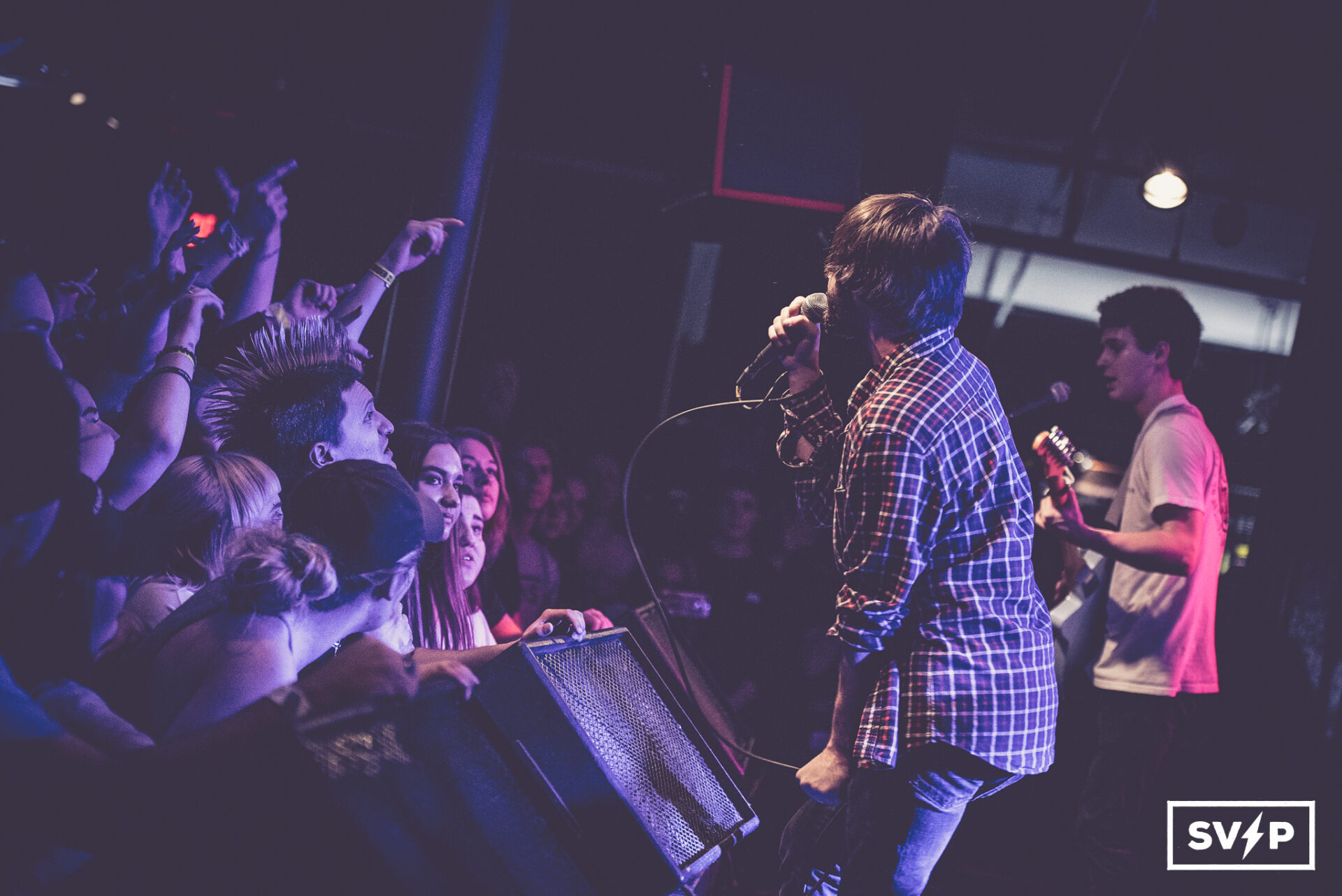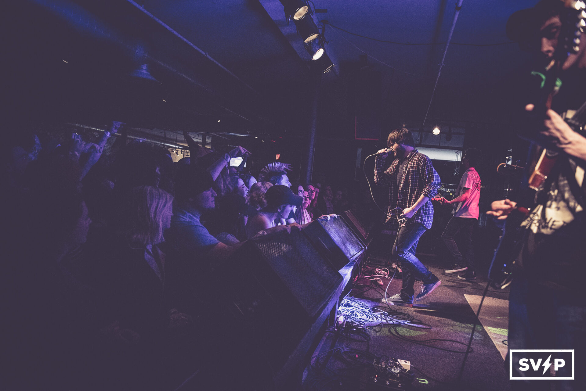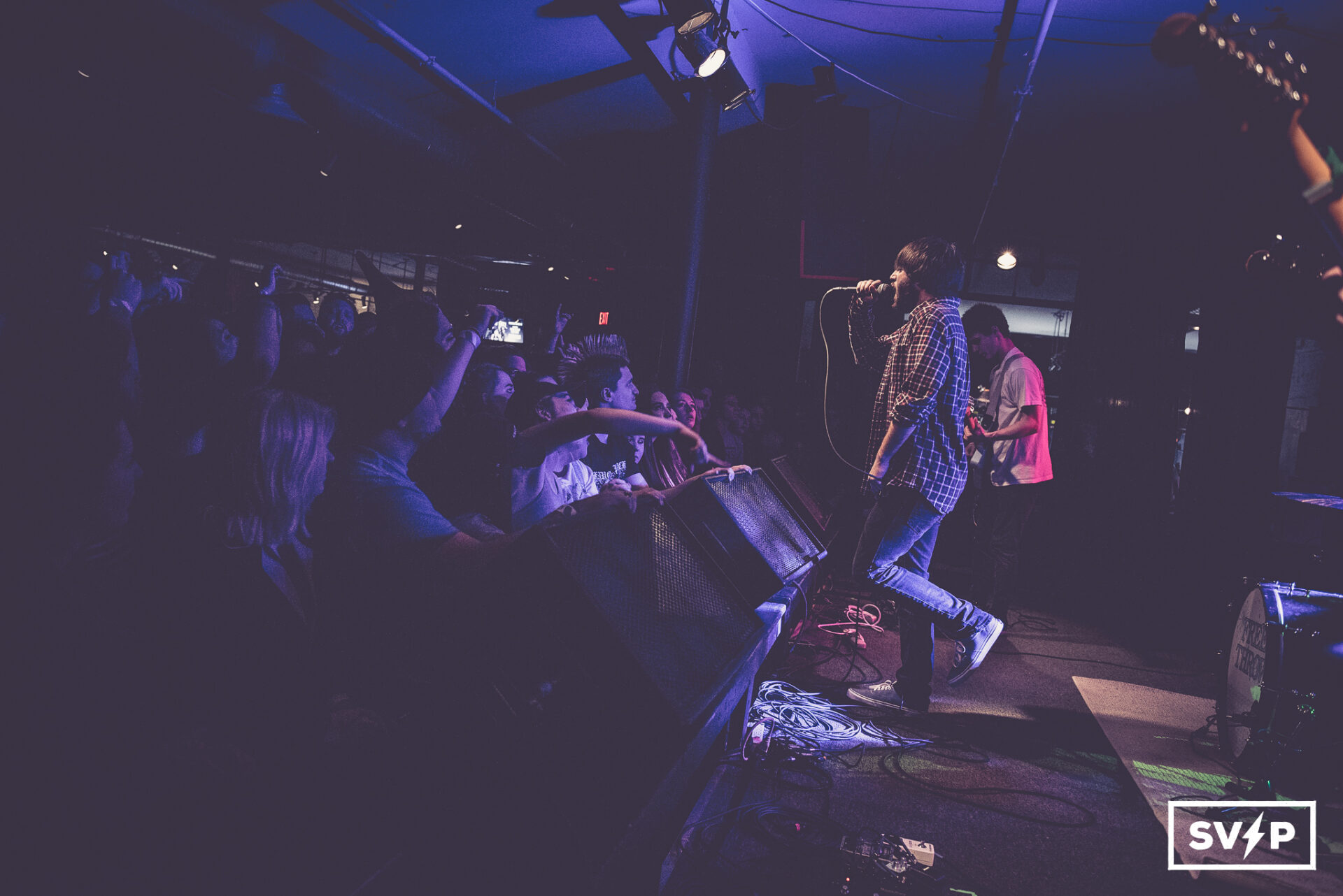 Performing in their hometown for the last time before the release of their No Sleep Records’ debut album, Pilot, Hot Mulligan stormed the stage with excitement and overall sense of joy that quickly filled the room. People cheered as soon as the members began appearing on stage, and their cheers returned no less than two more times before the first song. One time was in reaction to sound checks, but the other was a positive response to the banter between members. If anyone on stage was nervous no one in the crowd could tell, as they all seemed to be high spirits despite a few tired eyes from nursing hangovers in the back of a moving van. As far as anyone in the audience knew the band was as prepared as anyone could be, and their ensuring performance quickly proved that to be true.