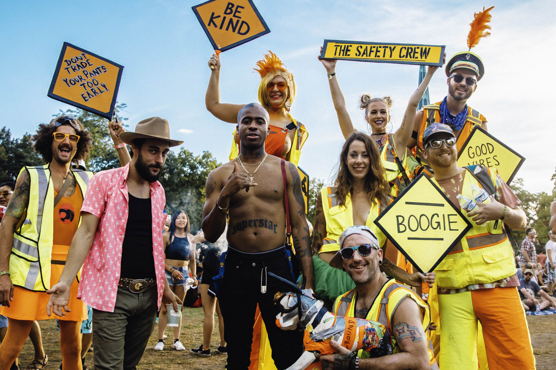 - The Safety Crew pose with fans