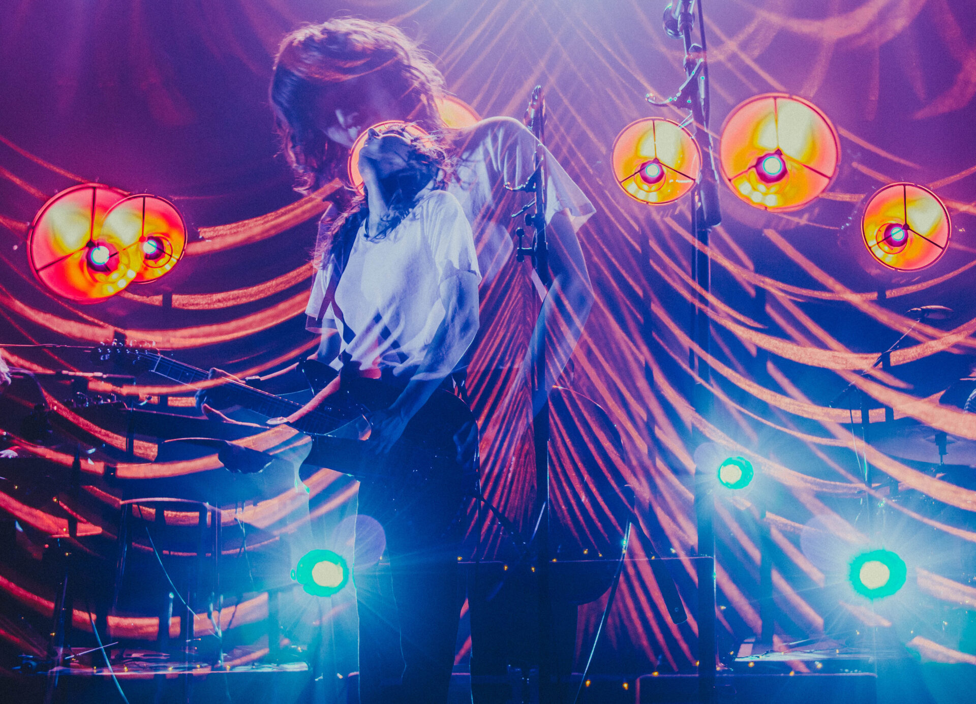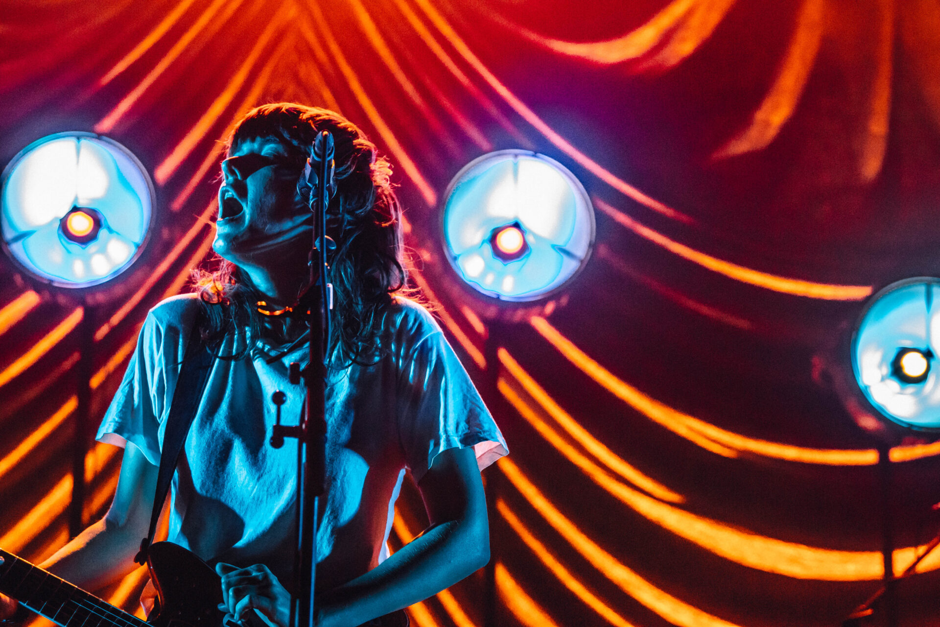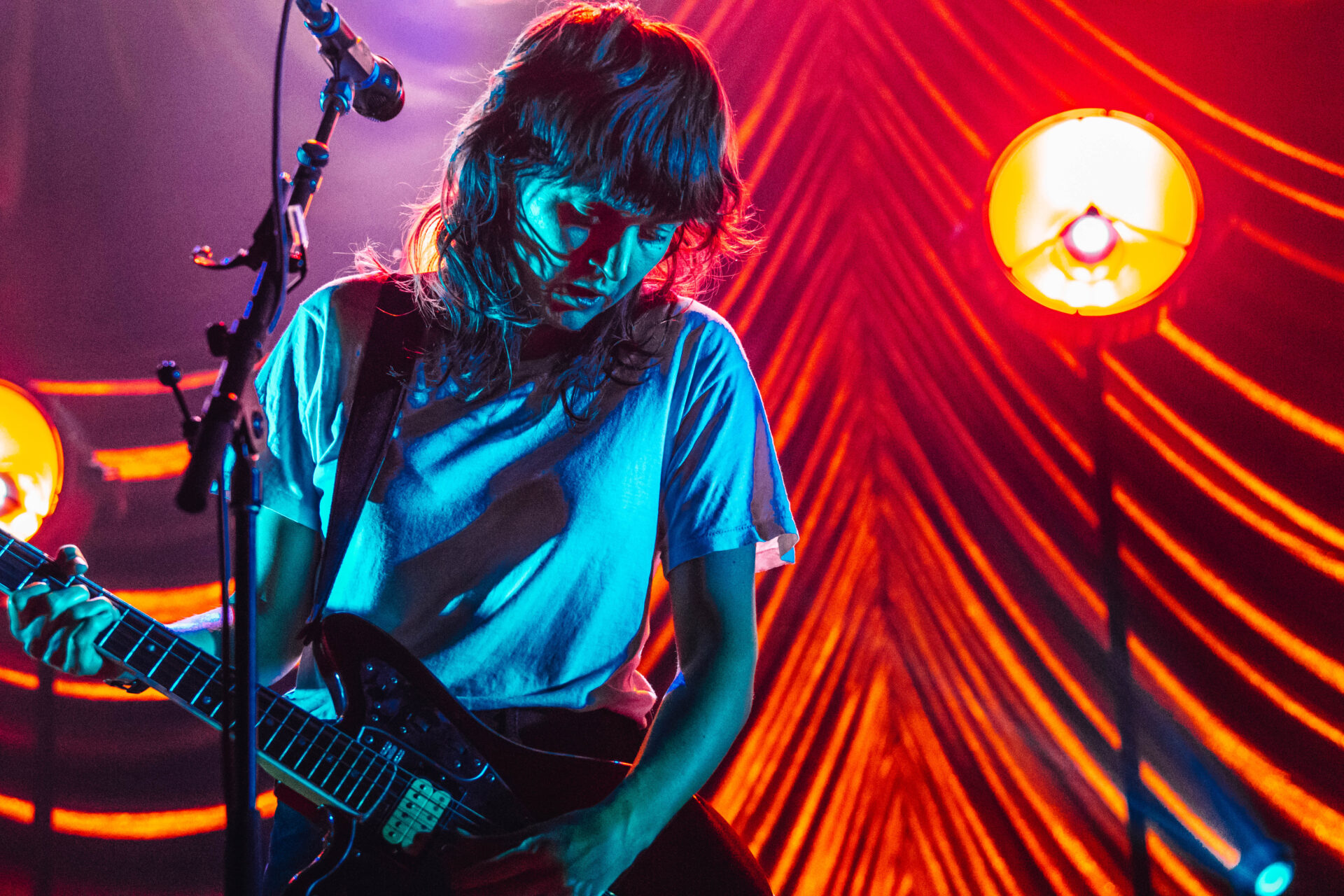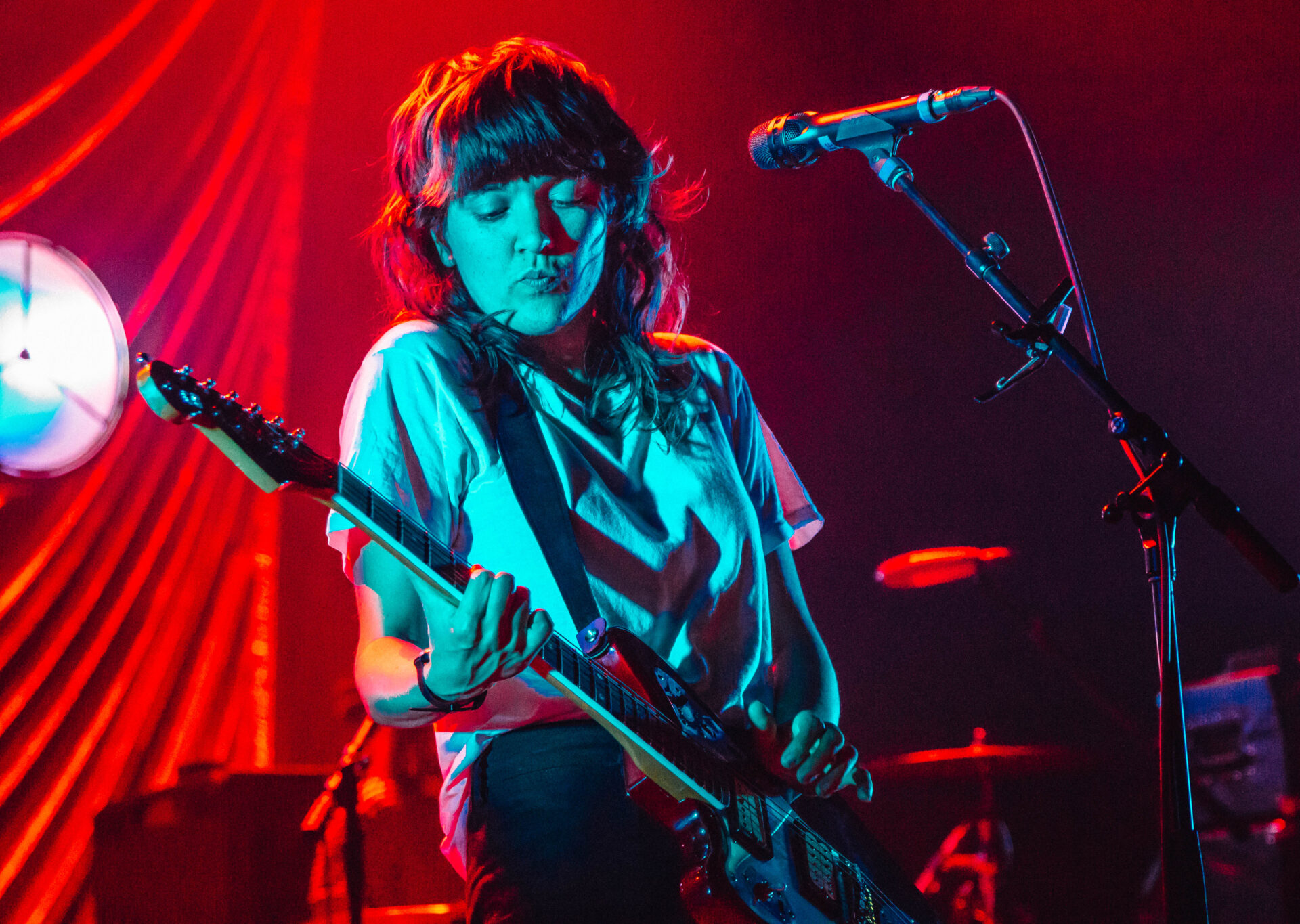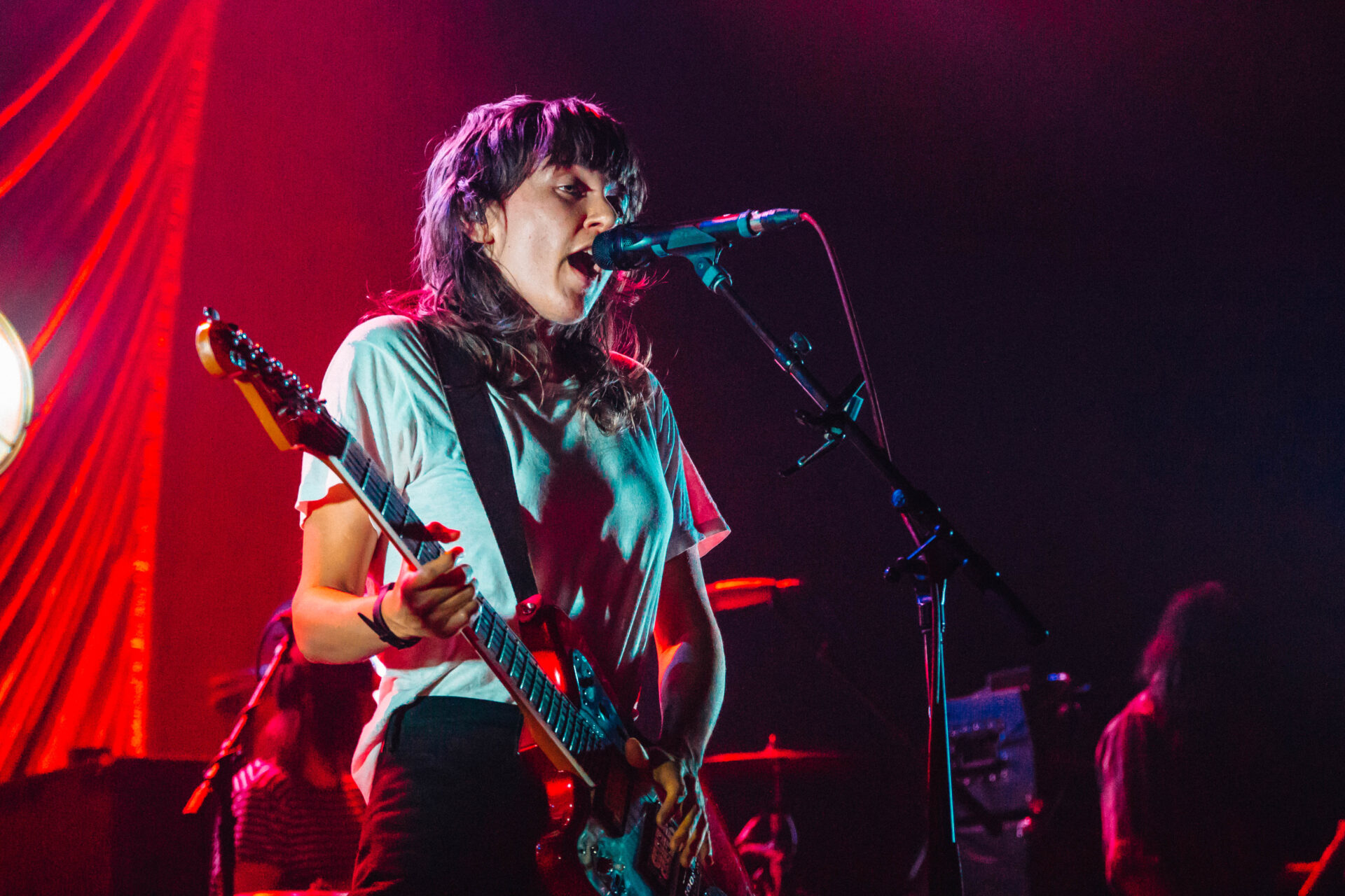 There are a few artists who I will drop everything to see. Courtney Barnett is one of those artists. Her most recent album, Tell Me How You Really Feel, has been on rotation for months on my Spotify playlist, but seeing Barnett play her emotionally-charged tracks live is an experience in itself. The Riv was packed with thousands of fans packed to the top of the balcony, but the crowd was impressively silent during Barnett’s opening track, “Hopefulessness”. As she came onstage, the tiny Christmas lights that dotted the stage illuminated the band, but only enough to make out their silhouettes. “Hopefulessness” has a dark and eerie vibe, but Barnett’s inviting voice and energetic gaze had the audience completely captivated. As the song built to its instrumental climax, the stage filled with blood red lighting: a photographer’s nightmare, but a perfect fit for the moment.