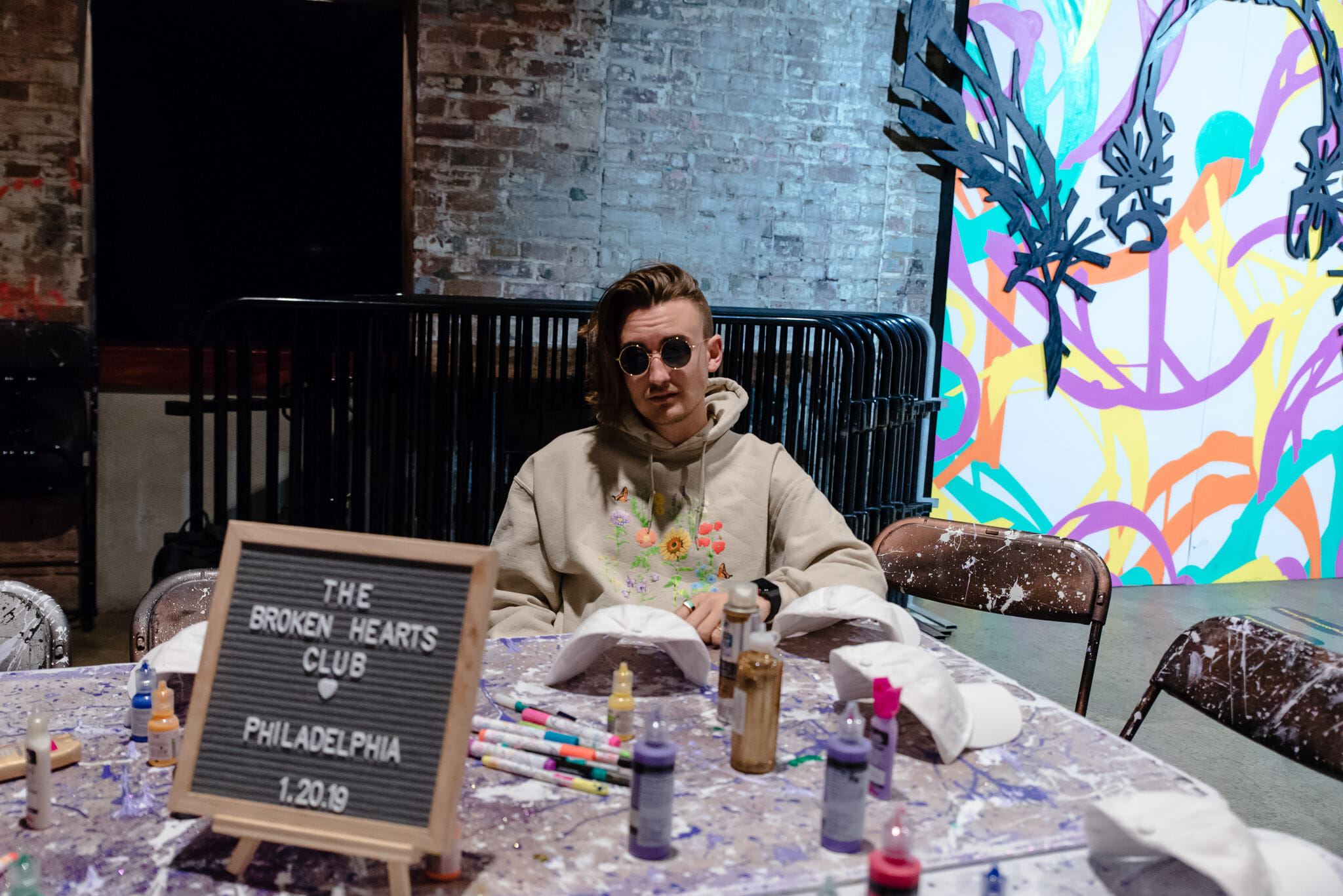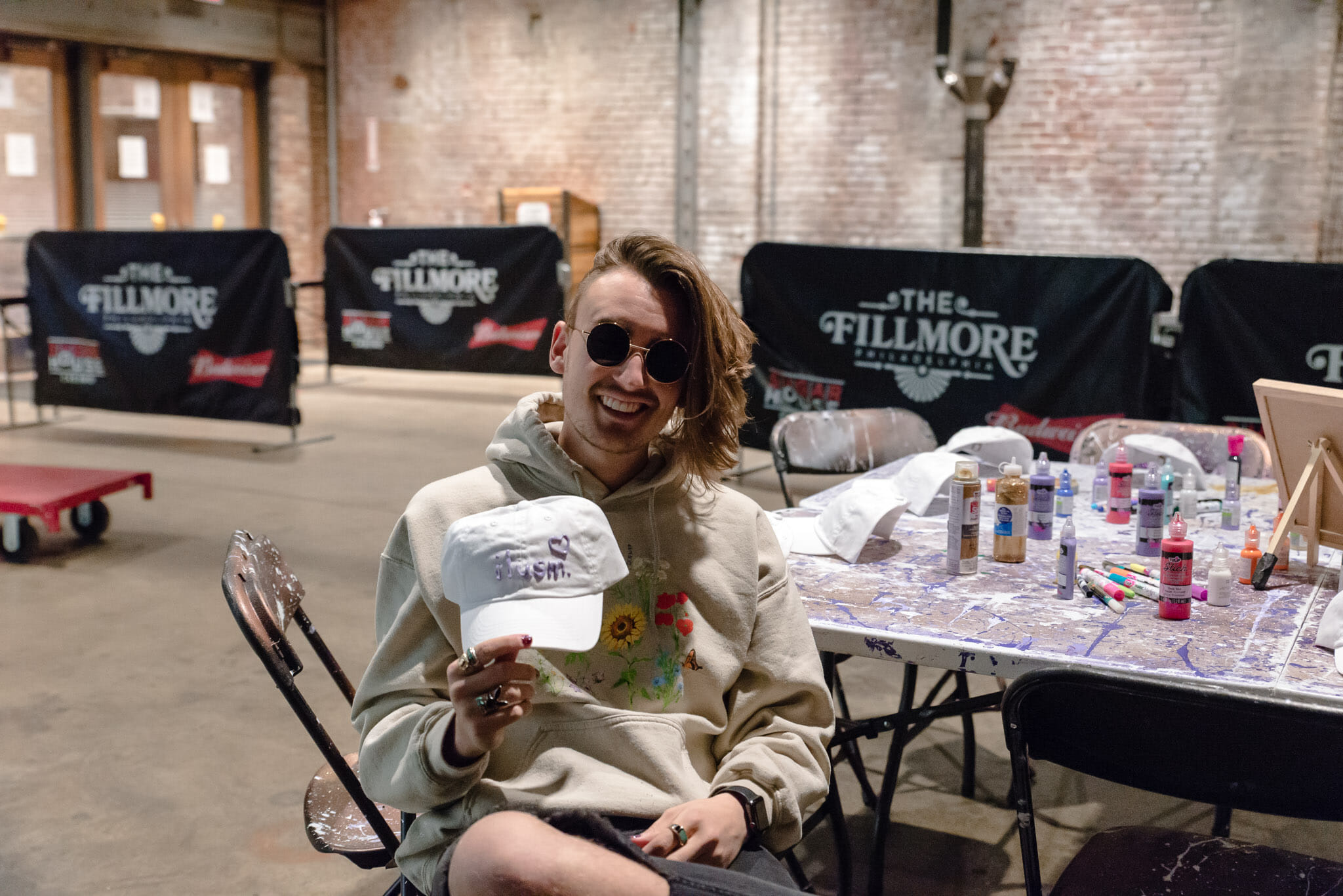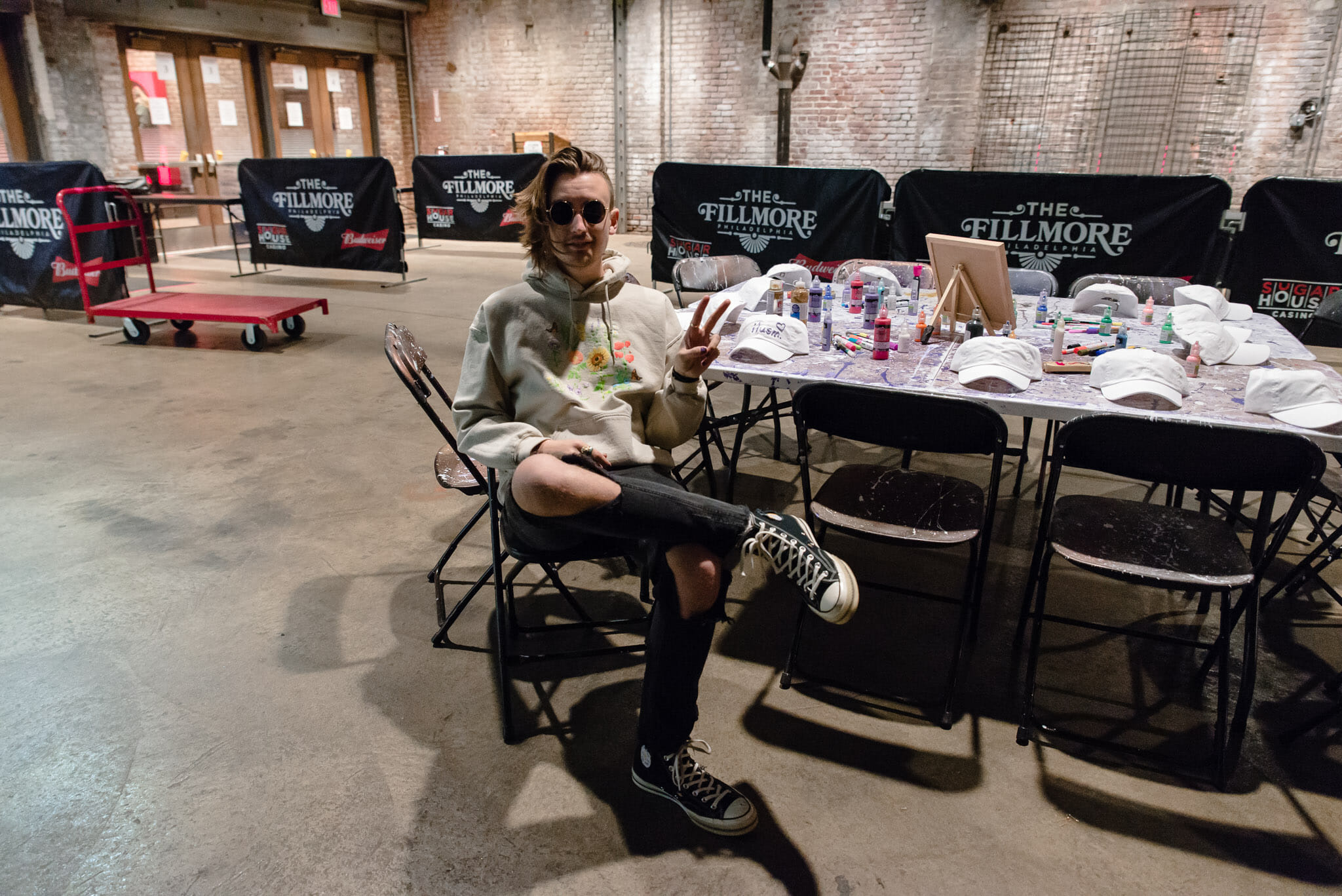 For the meet and greet, on each day of the tour gnash will be doing a different arts and crafts project with fans. In Philadelphia, they’re decorating hats. In the lobby of the venue are two tables, splattered with purple paint and glitter, with a white baseball hat and fabric paint at each chair. Making the hat is “a gift to themselves,” an experience to remember and something physical that they can take home that they made.