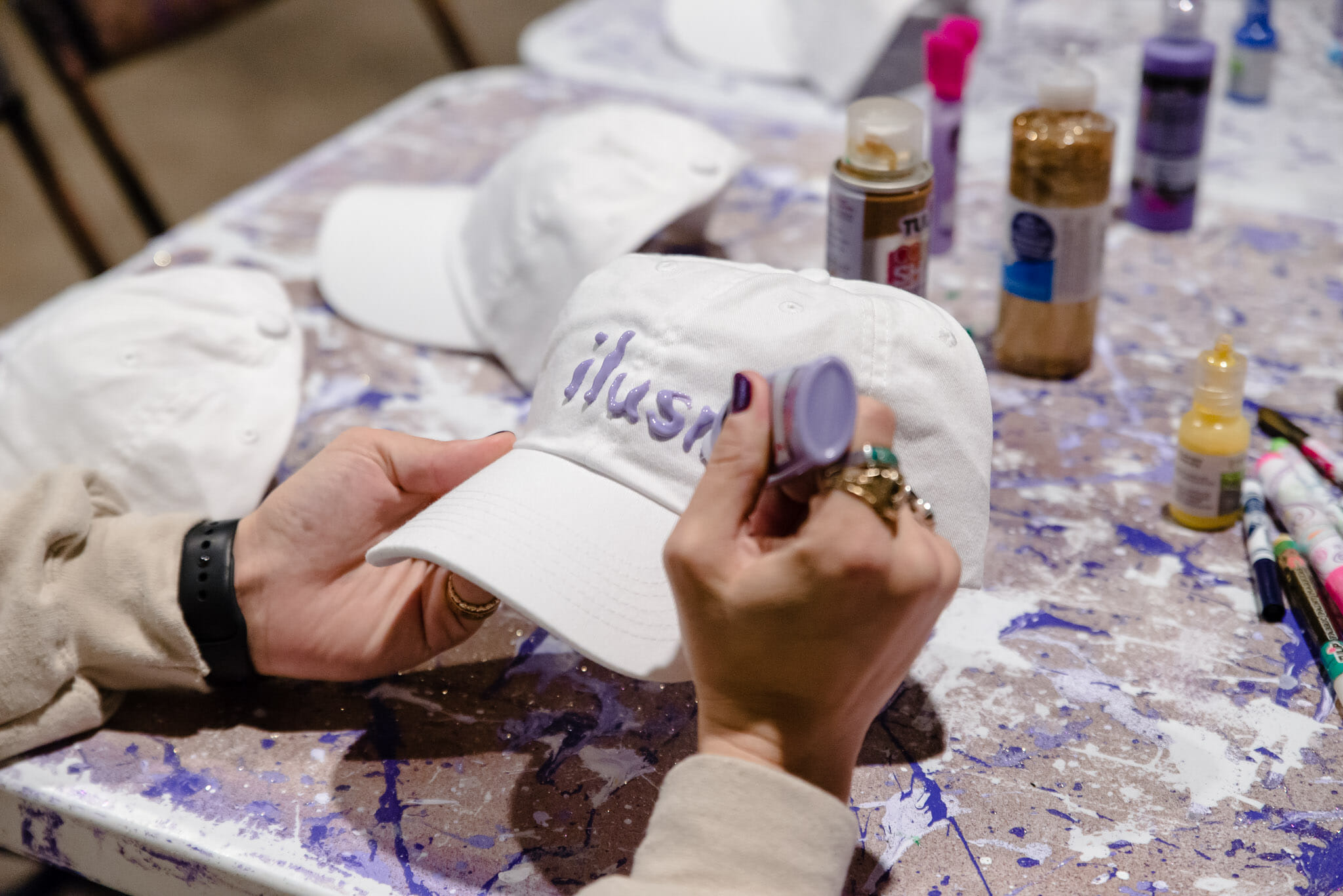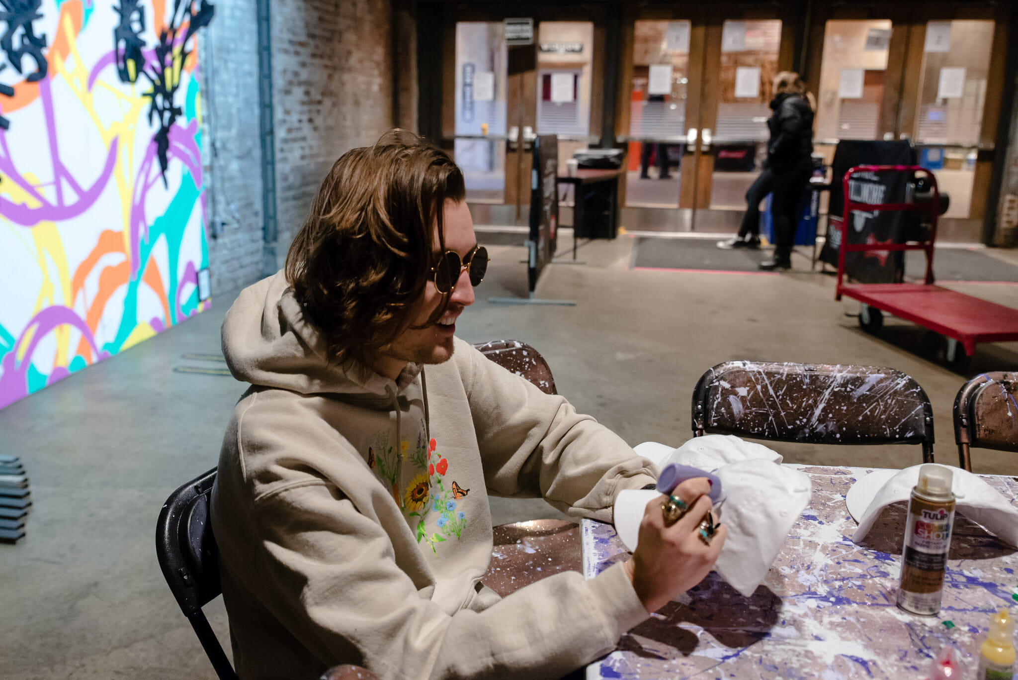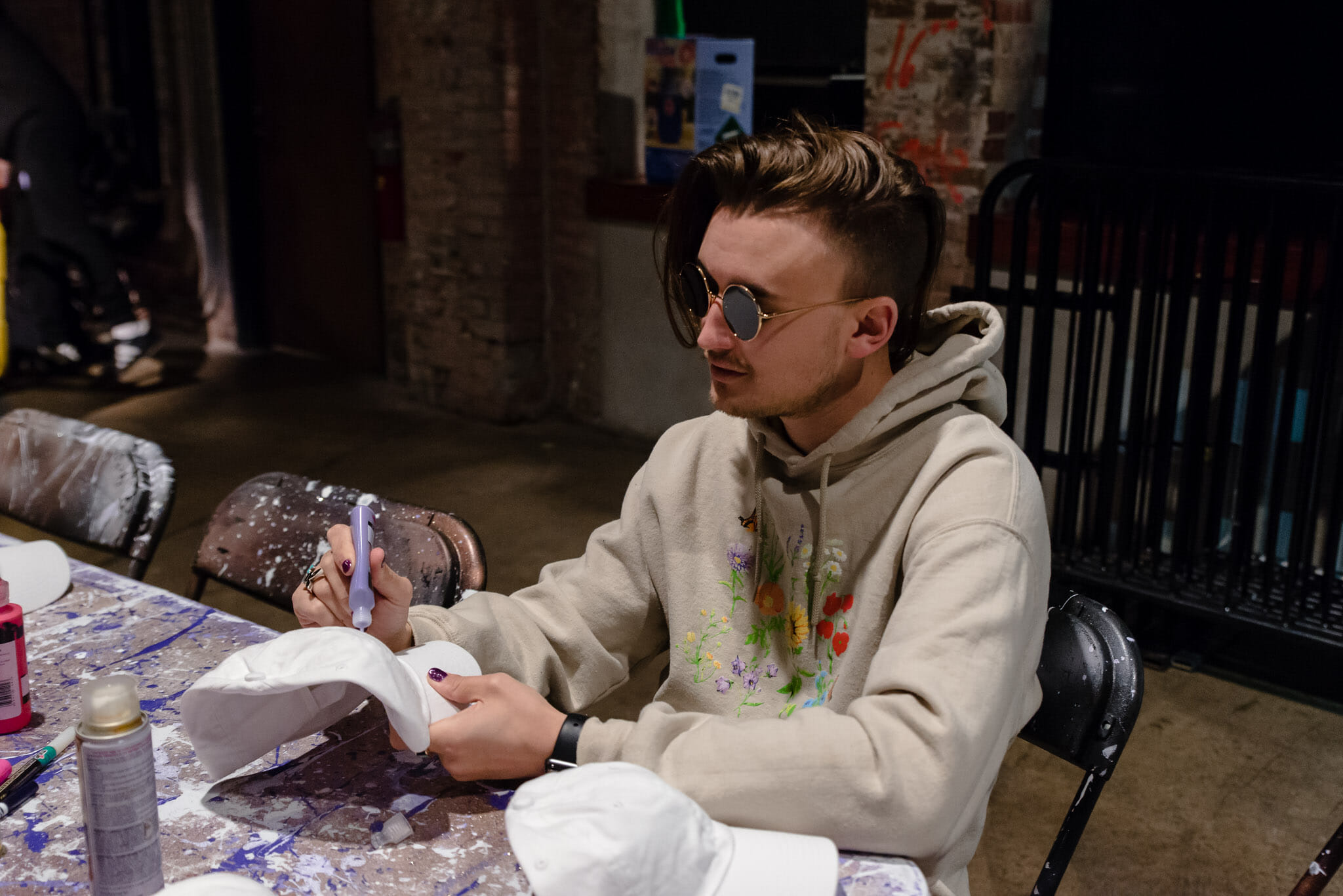 For the meet and greet, on each day of the tour gnash will be doing a different arts and crafts project with fans. In Philadelphia, they’re decorating hats. In the lobby of the venue are two tables, splattered with purple paint and glitter, with a white baseball hat and fabric paint at each chair. Making the hat is “a gift to themselves,” an experience to remember and something physical that they can take home that they made.