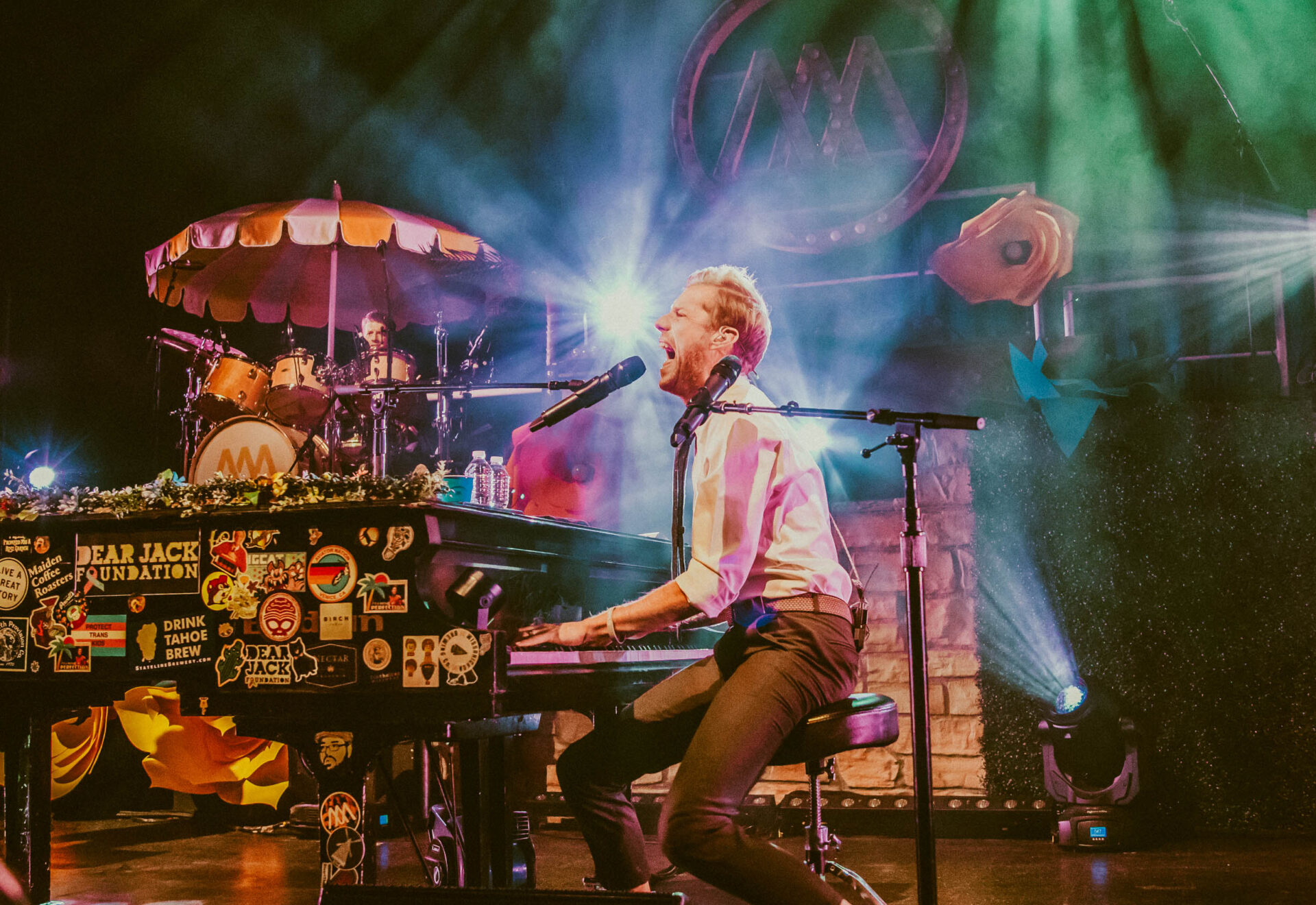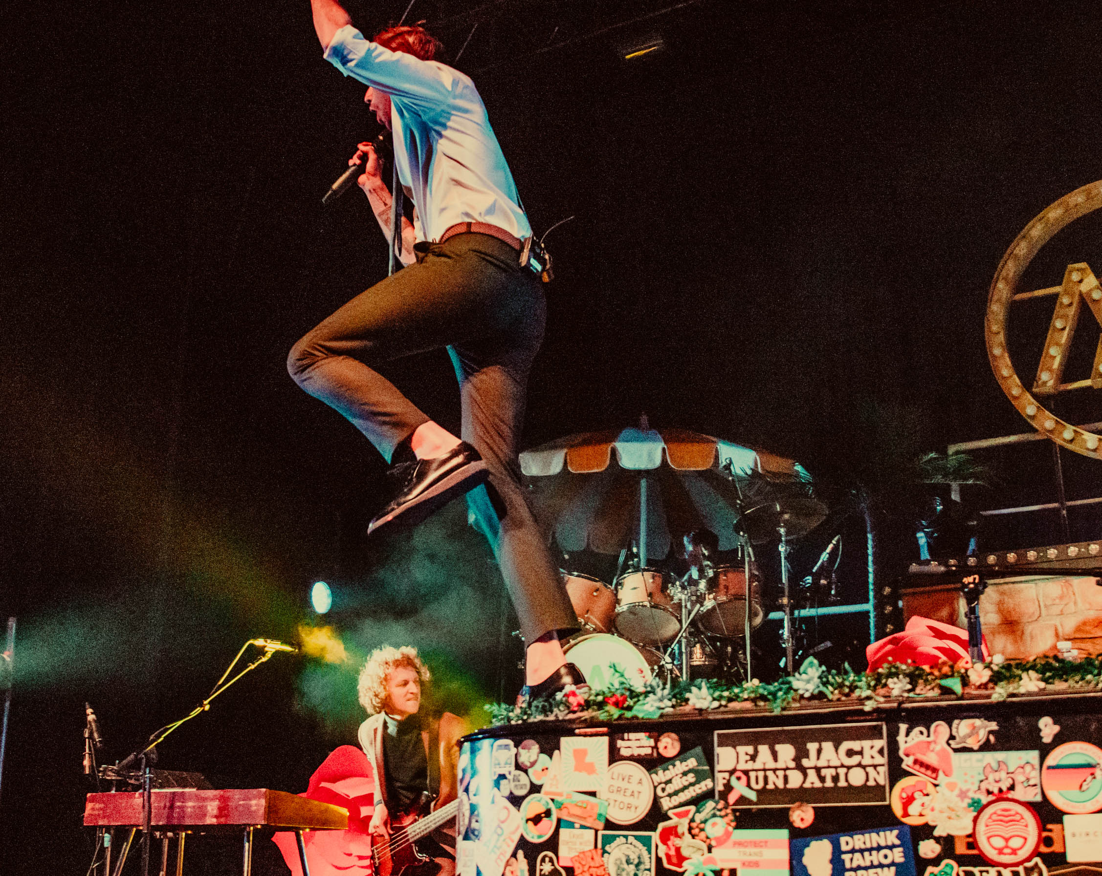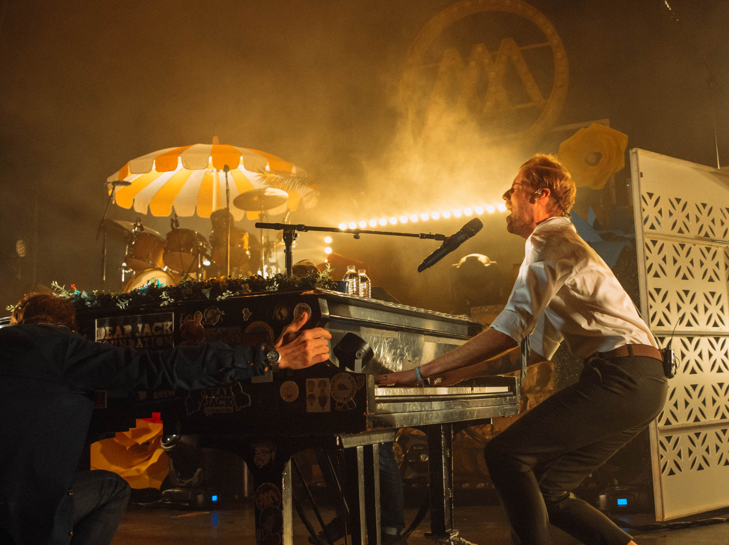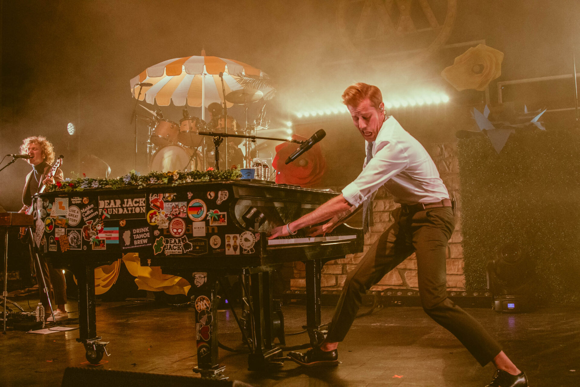 The stage lit up and McMahon began singing “Everything Must Go”, but he was nowhere to be found. Fans sang along, but a few looked confused as neither McMahon nor his signature, sticker-covered piano were onstage. Suddenly, a lattice-covered spot at the back of the stage lit up, and McMahon wheeled his piano to the front of the stage, still playing while pushing the massive instrument. He flashed a massive smile and kept playing while standing up. It takes a lot for a musician to be so dynamic by playing the piano, but Andrew McMahon definitely pulls it off.