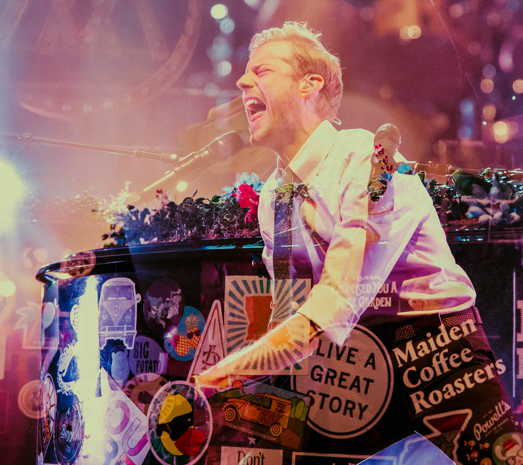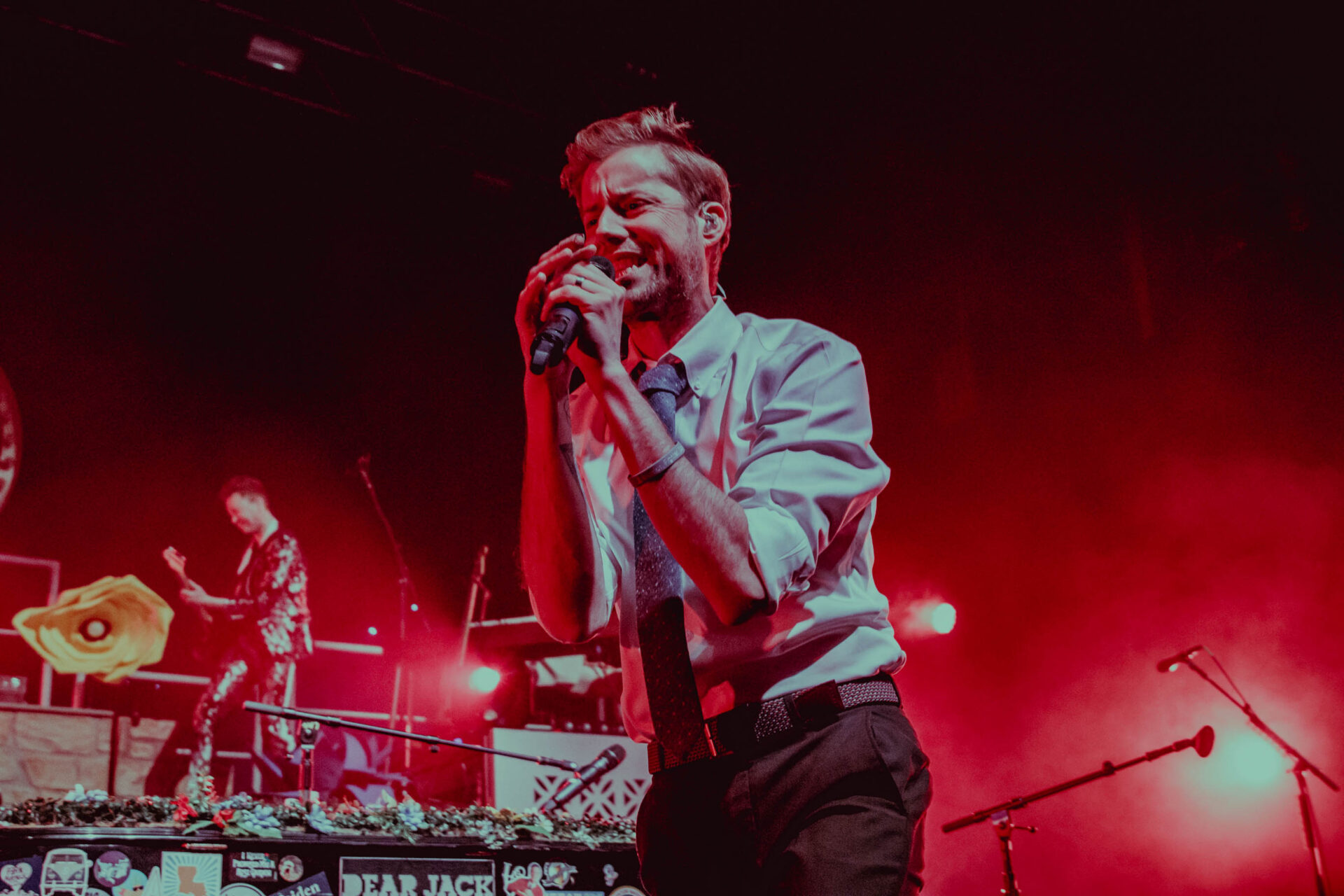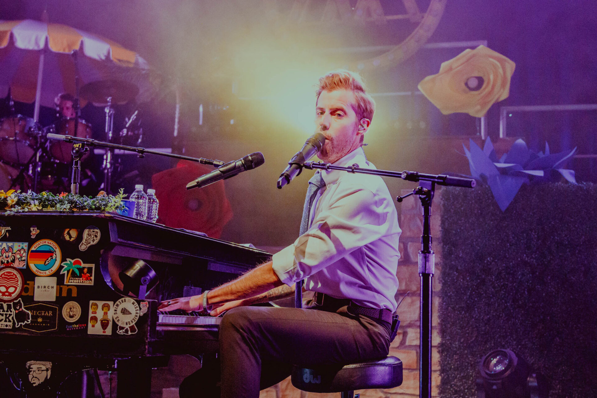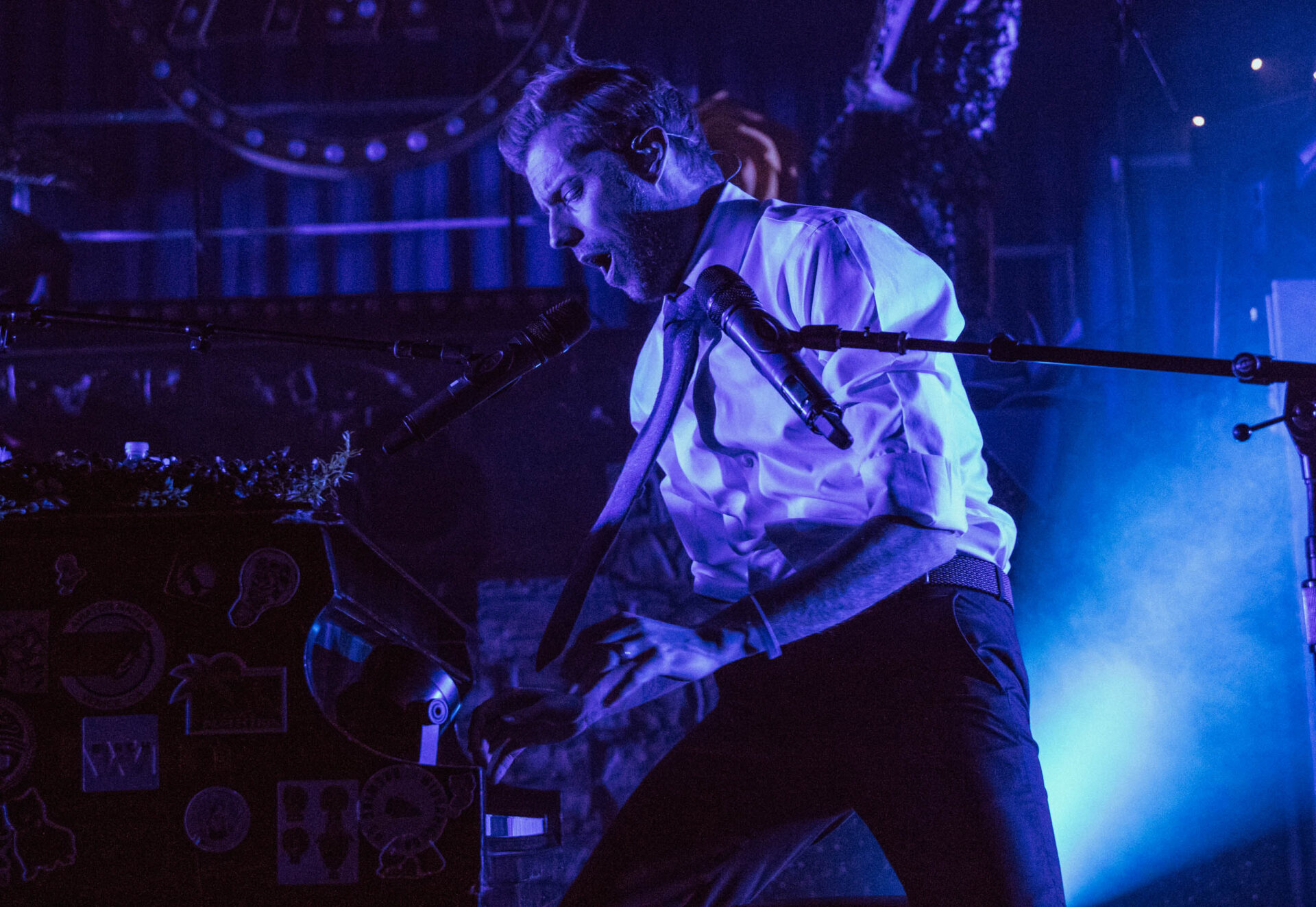 The stage lit up and McMahon began singing “Everything Must Go”, but he was nowhere to be found. Fans sang along, but a few looked confused as neither McMahon nor his signature, sticker-covered piano were onstage. Suddenly, a lattice-covered spot at the back of the stage lit up, and McMahon wheeled his piano to the front of the stage, still playing while pushing the massive instrument. He flashed a massive smile and kept playing while standing up. It takes a lot for a musician to be so dynamic by playing the piano, but Andrew McMahon definitely pulls it off.