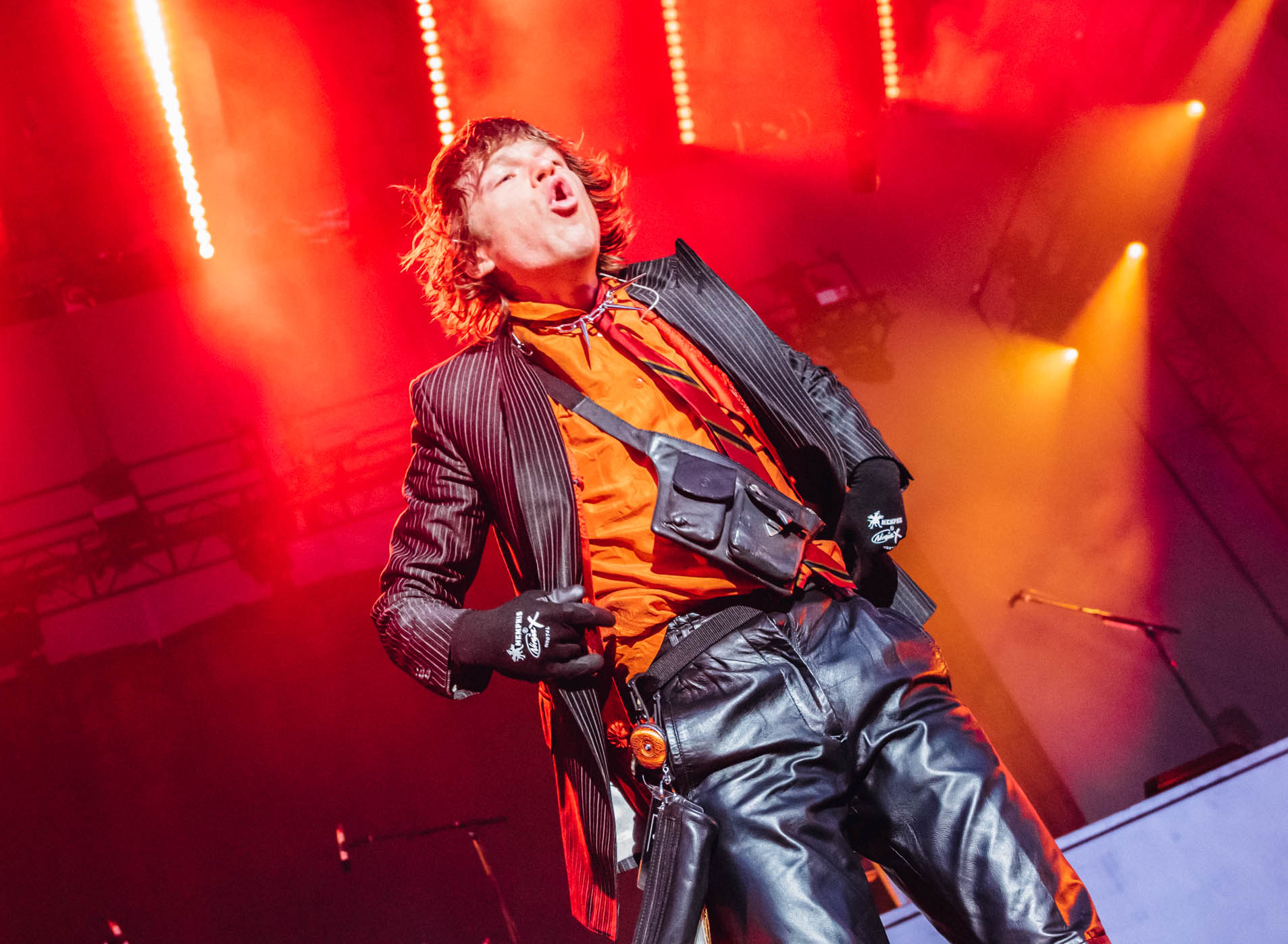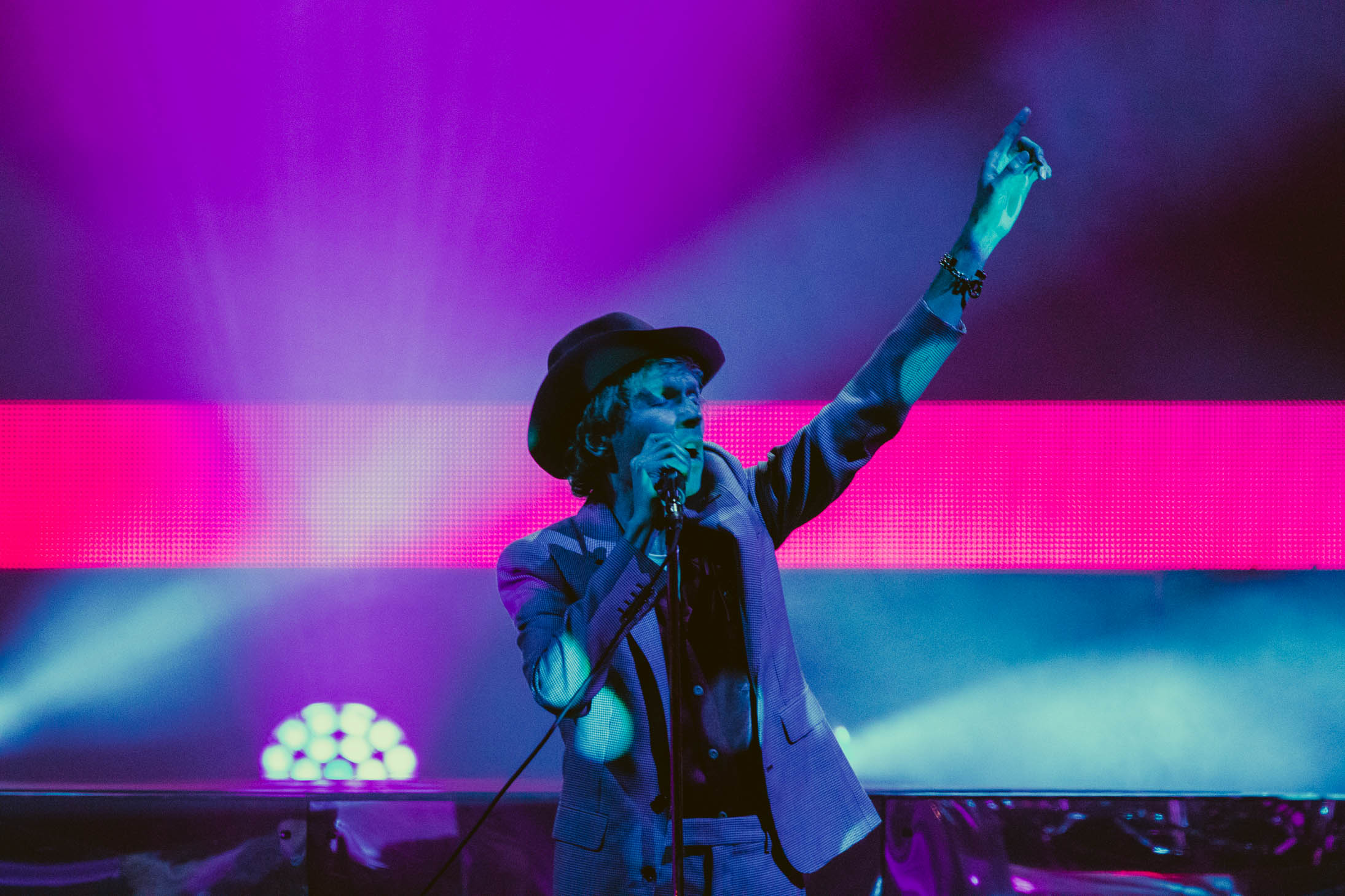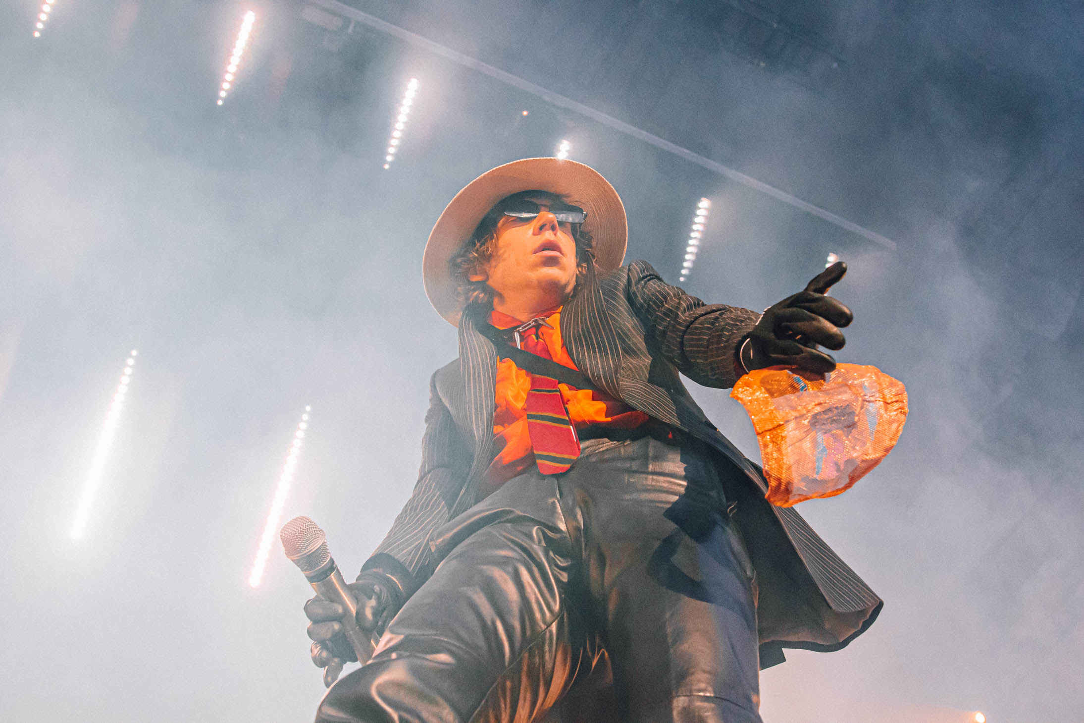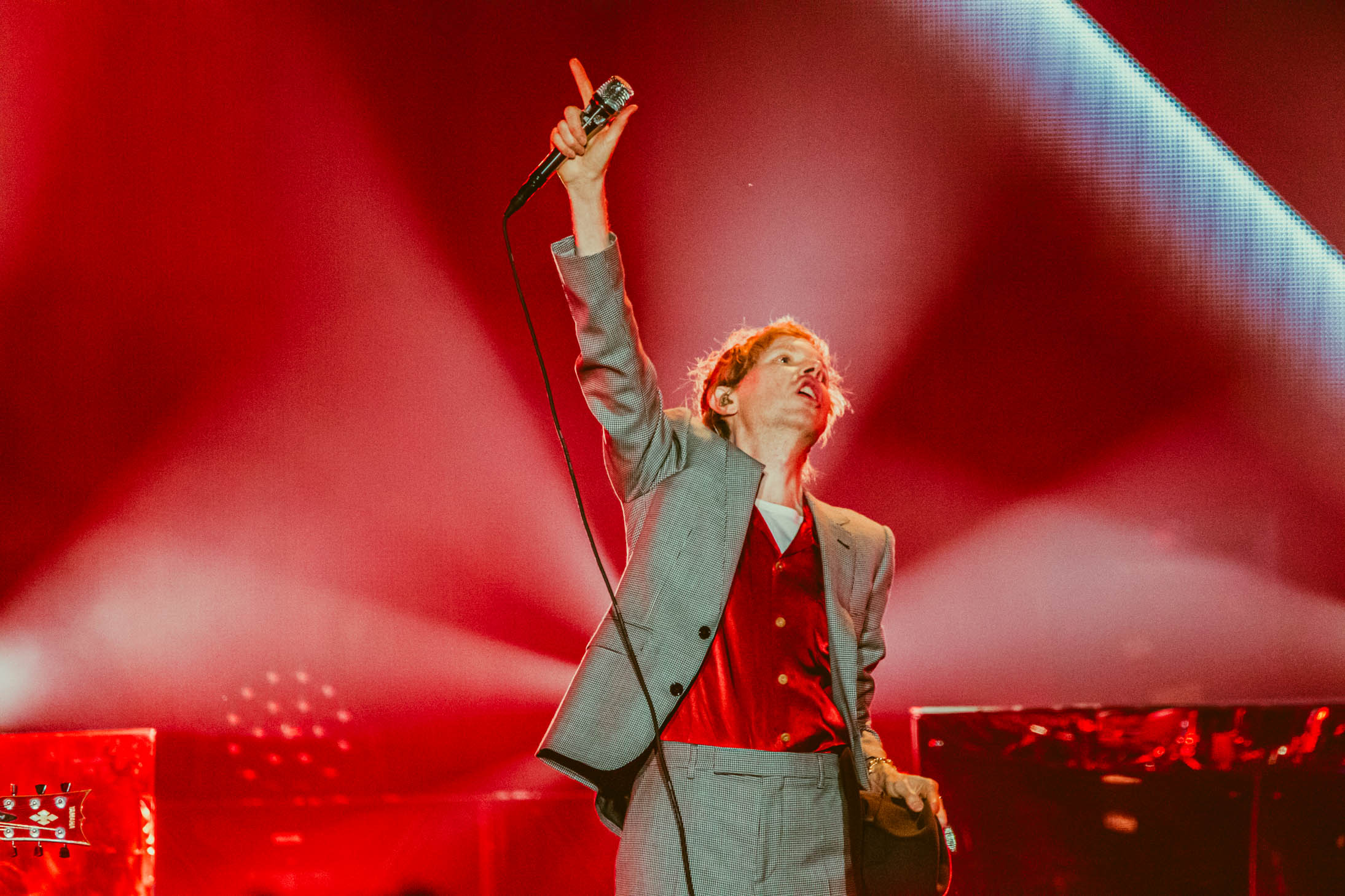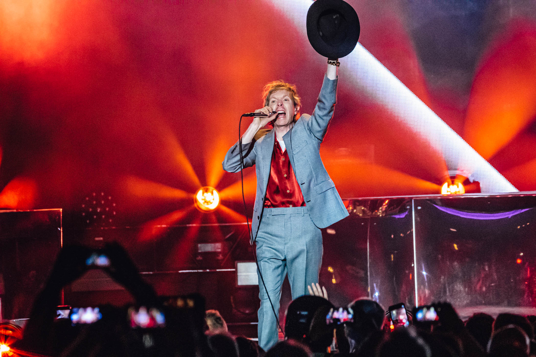 Spoon put on a great set, but I unfortunately got there just after the photo pit closed. I found my seat near the stage and caught the last half of their performance. They played some of my favorite songs, including “I Turn My Camera On” and “The Underdog”. As fans made their way back to their seats for Cage the Elephant, I noticed a sign on the side of the stage that said “PYRO”. During their first song, “Broken Boy”, the stage erupted in fire. Vocalist Matt Schultz stumbled onstage in a baggy, mismatched suit jacket and leather pants, holding a mesh mask over his face. Schultz has always had incredible stage presence, but he really outdid himself at this show.