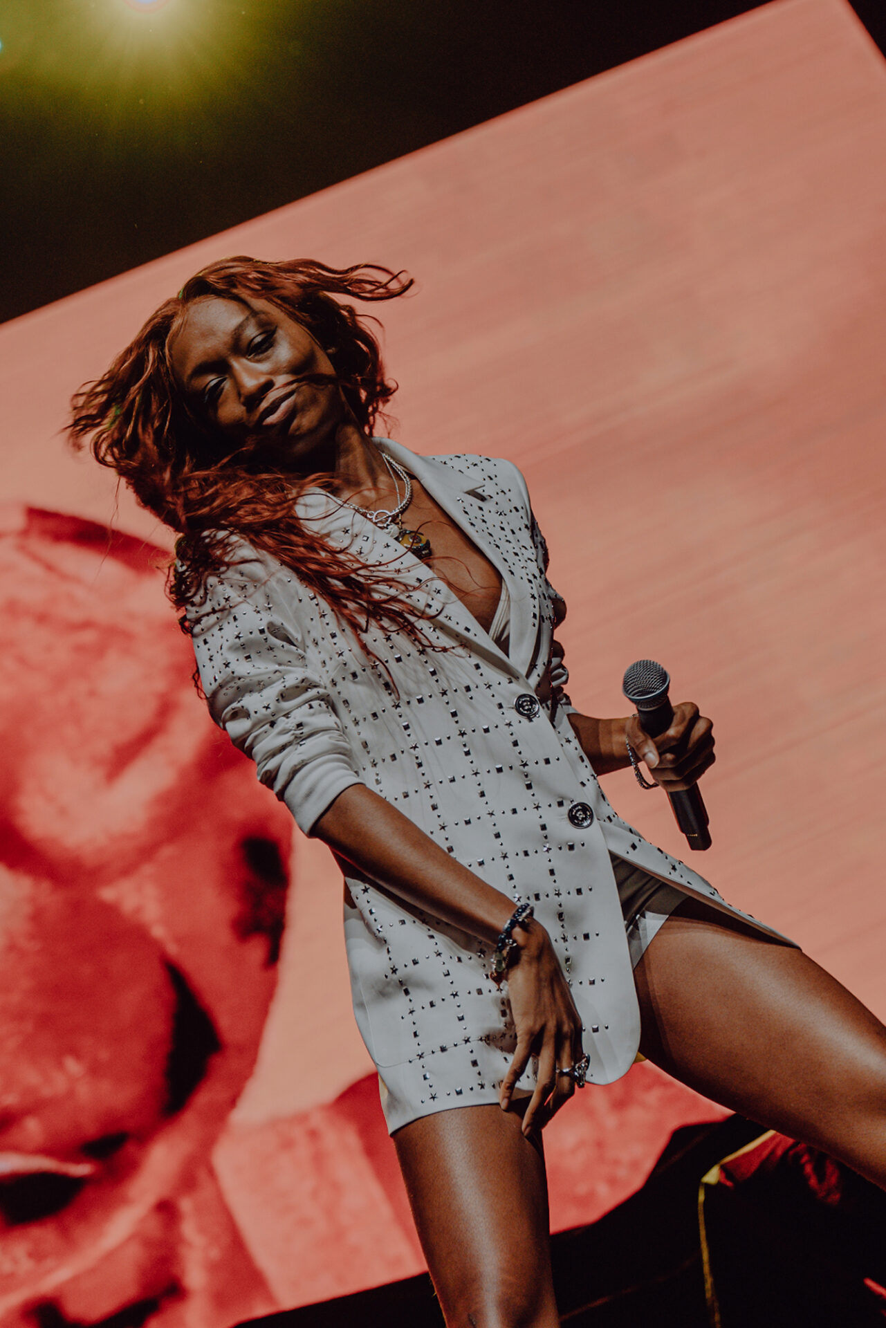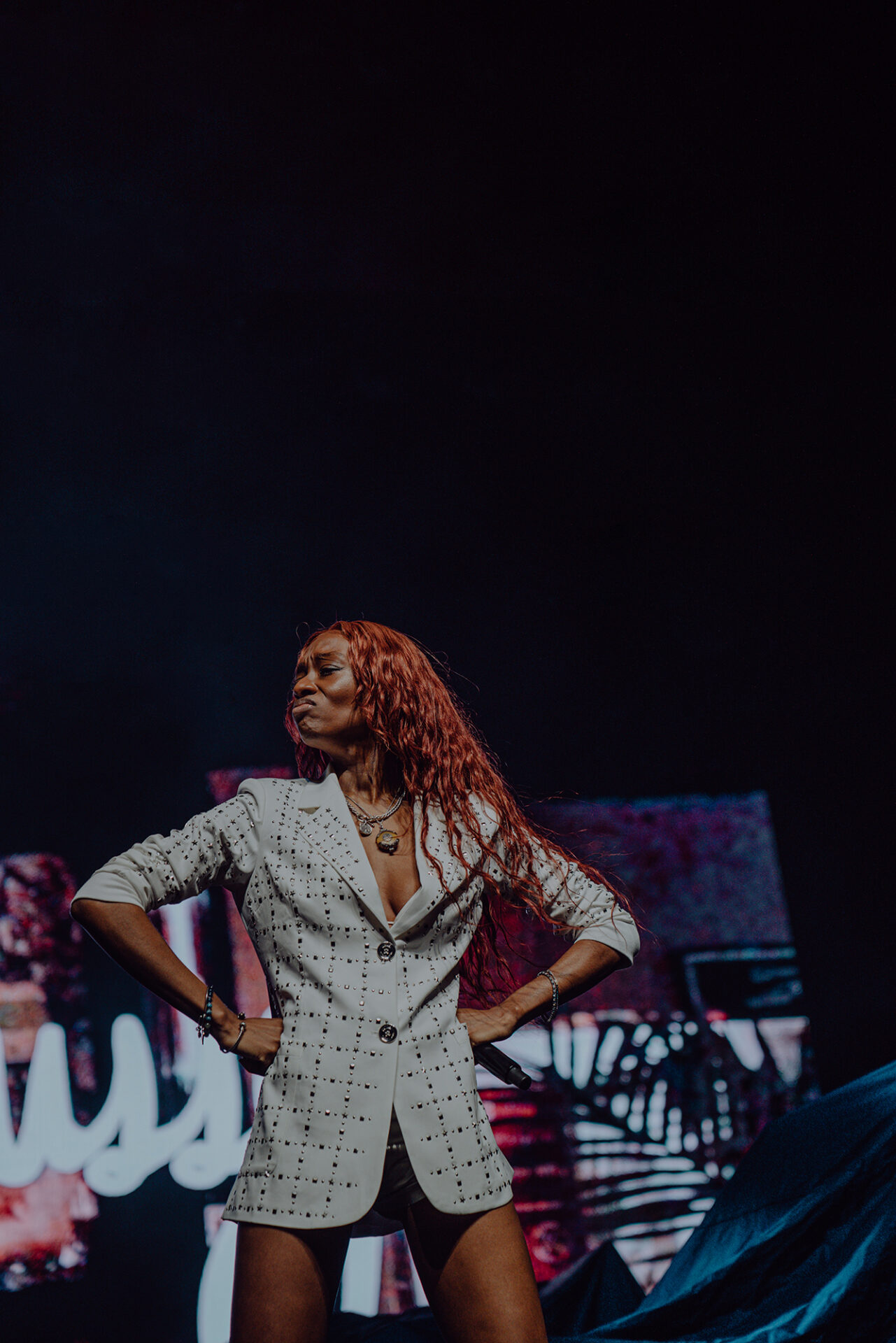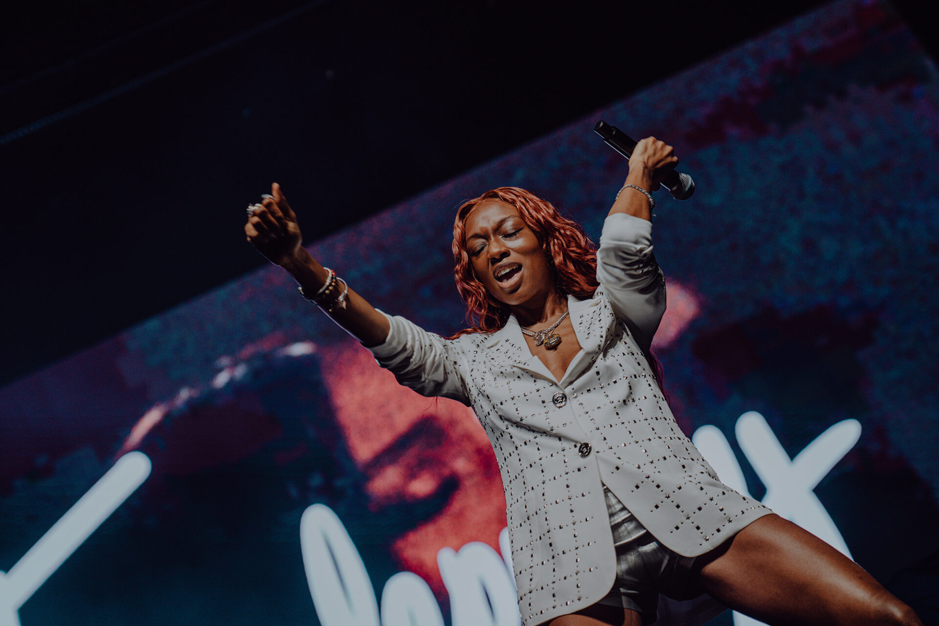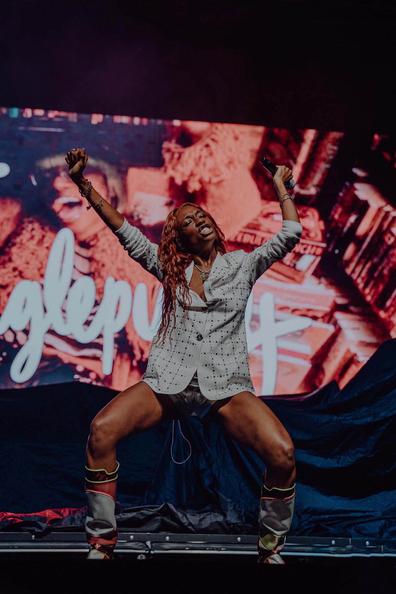 Inside the arena, fans poured into their seats with eager anticipation for the show to begin. At 8 pm promptly, the lights went down, and the arena erupted into roars and cheers. The opening seconds of “Main Attraction” played and Junglepussy entered from stage right. Donning a luxurious bedazzled suit coat and fashion-forward neon cowboy-ensue boots, Junglepussy erupted into a highly emotive performance. It was clear to see that Junglepussy had garnered some support of her own, as fans along the barricade hooted and hollered words of encouragement in between songs.