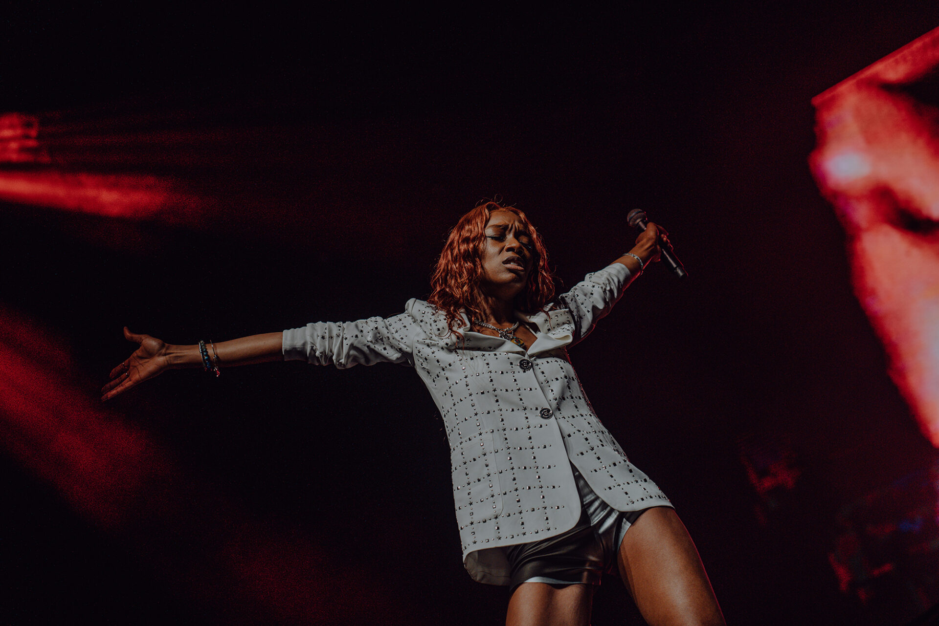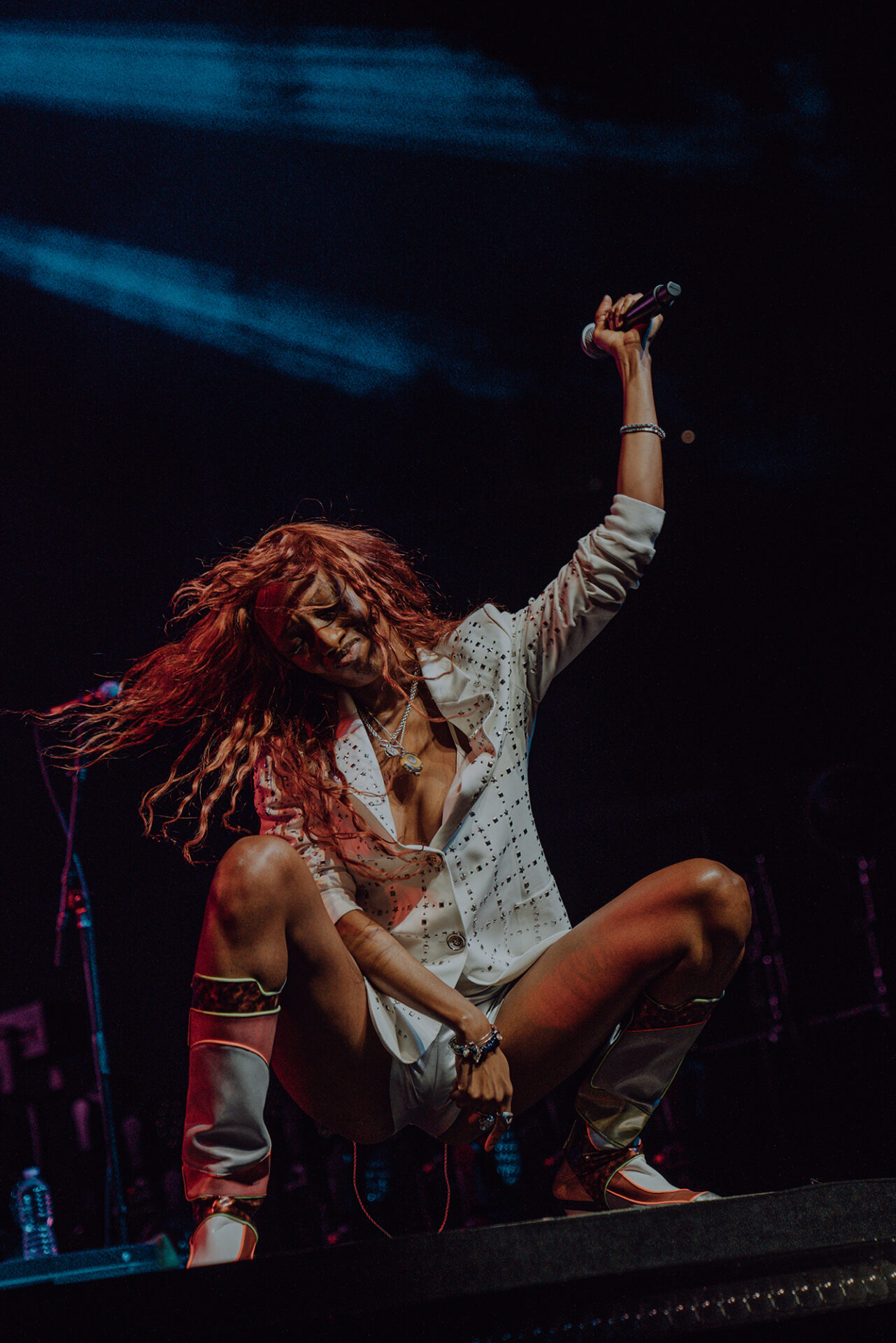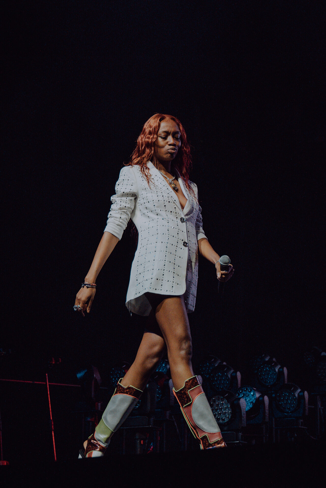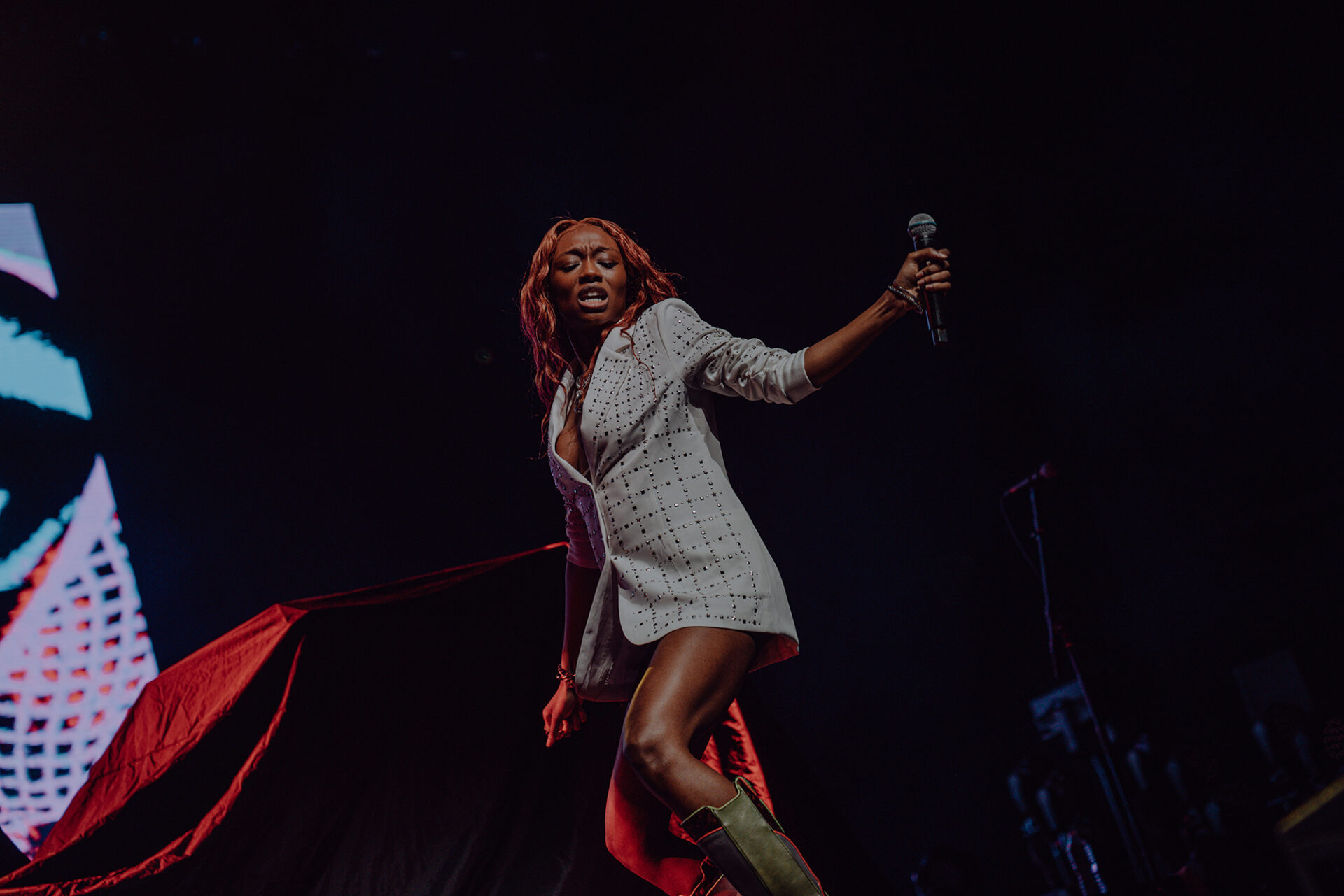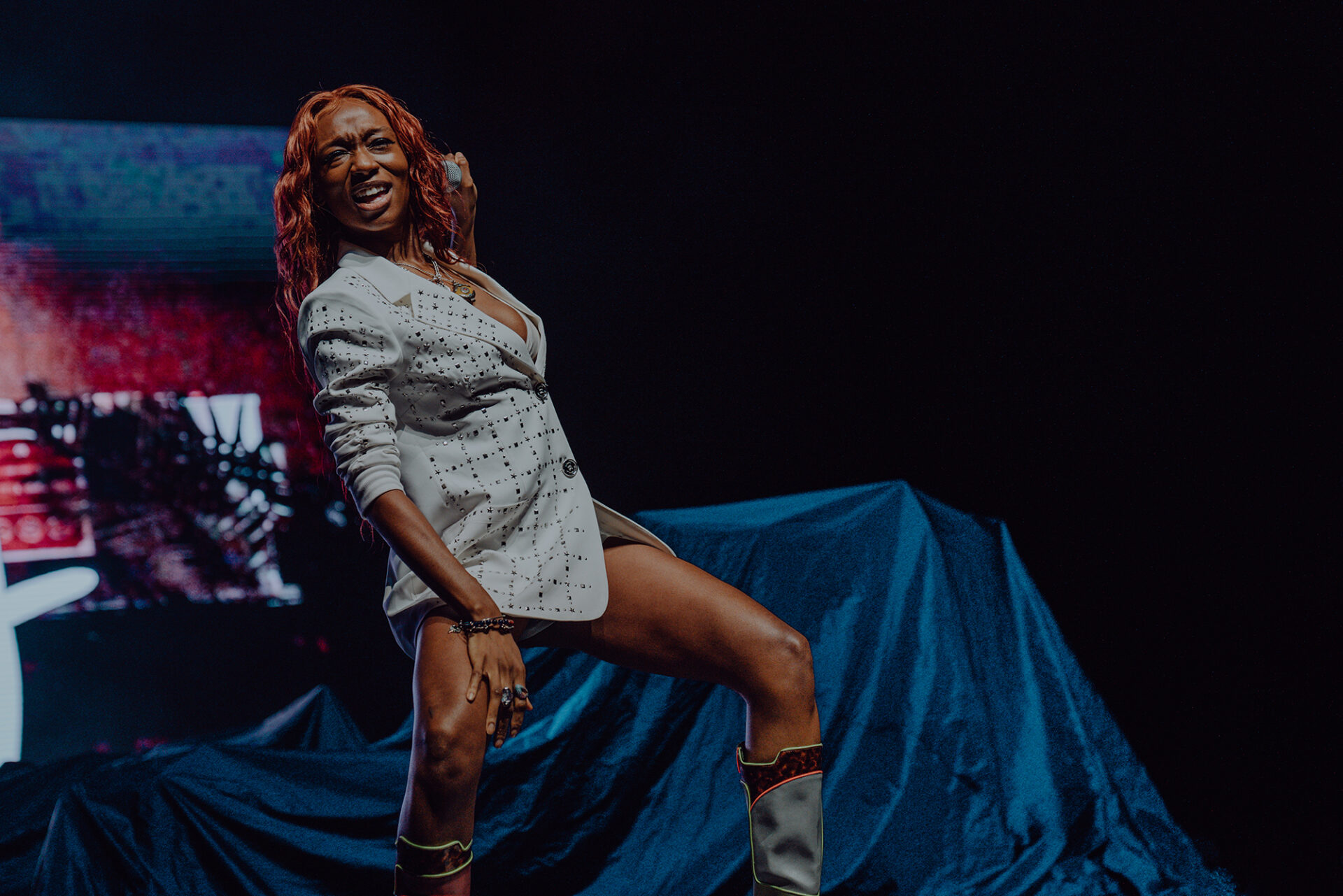 Inside the arena, fans poured into their seats with eager anticipation for the show to begin. At 8 pm promptly, the lights went down, and the arena erupted into roars and cheers. The opening seconds of “Main Attraction” played and Junglepussy entered from stage right. Donning a luxurious bedazzled suit coat and fashion-forward neon cowboy-ensue boots, Junglepussy erupted into a highly emotive performance. It was clear to see that Junglepussy had garnered some support of her own, as fans along the barricade hooted and hollered words of encouragement in between songs.