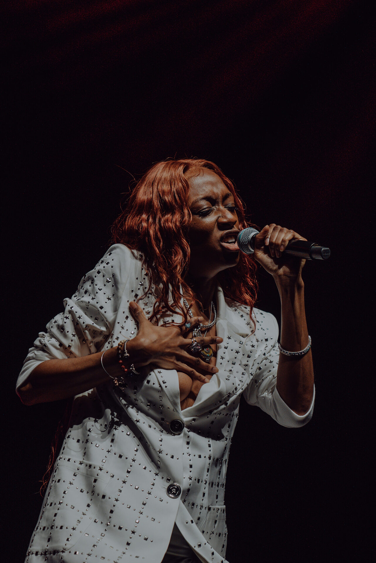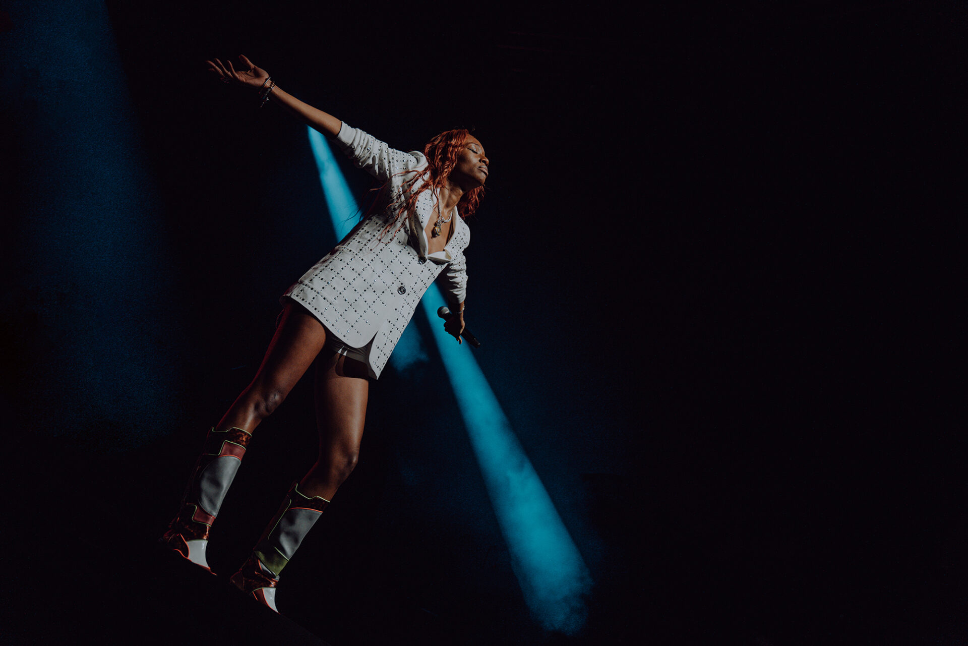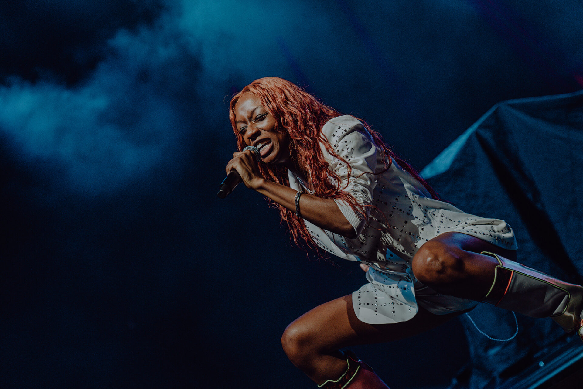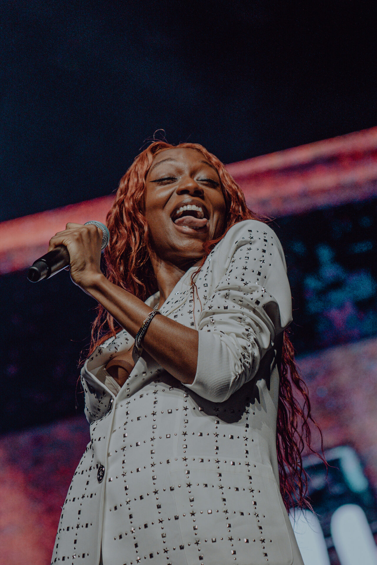 Inside the arena, fans poured into their seats with eager anticipation for the show to begin. At 8 pm promptly, the lights went down, and the arena erupted into roars and cheers. The opening seconds of “Main Attraction” played and Junglepussy entered from stage right. Donning a luxurious bedazzled suit coat and fashion-forward neon cowboy-ensue boots, Junglepussy erupted into a highly emotive performance. It was clear to see that Junglepussy had garnered some support of her own, as fans along the barricade hooted and hollered words of encouragement in between songs.