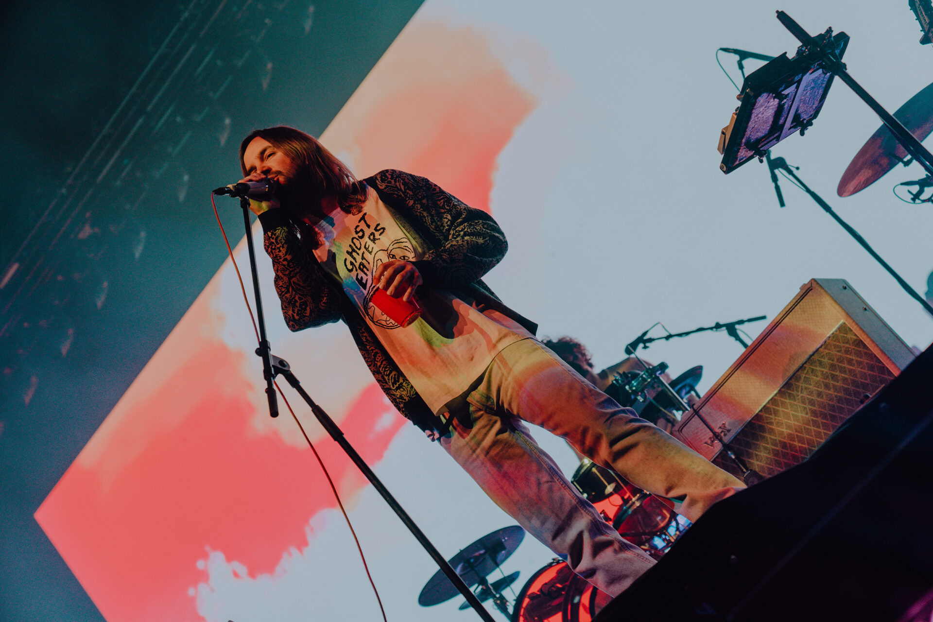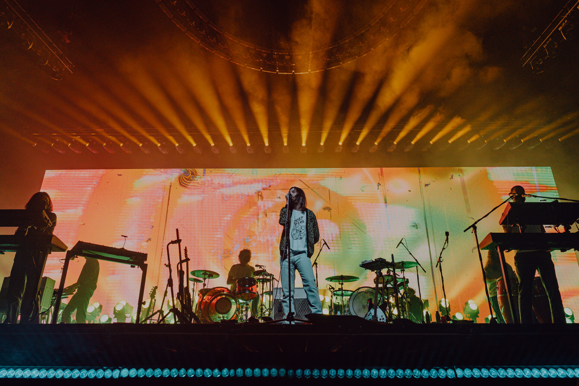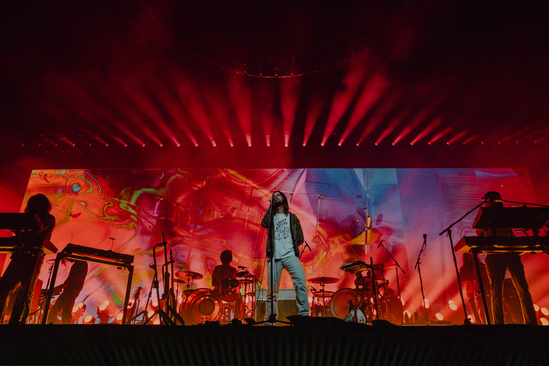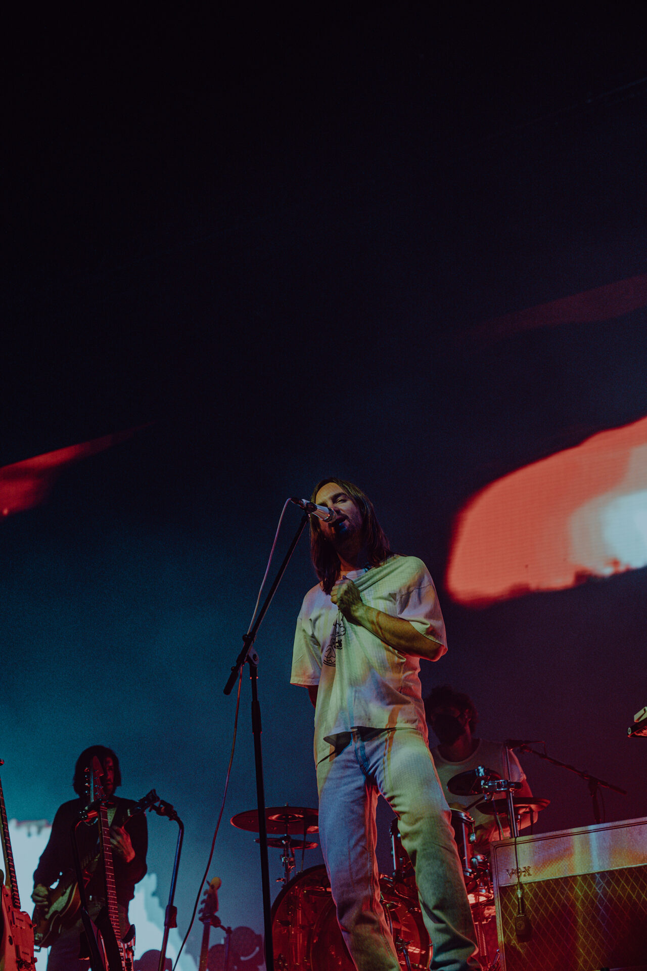 After a 30-minute break, the stage had been cleared and set up for Tame Impala’s set of epic proportions. I watched from the pit at stage left as a bright white screen came on at 9 pm sharp. A clinician appeared on the screen, discussing the benefits of Rushium and encouraging fans to take their Rushium now — so it would kick in at the height of the Tame Impala set. The video distorted and faded to black as Tame Impala took the stage.