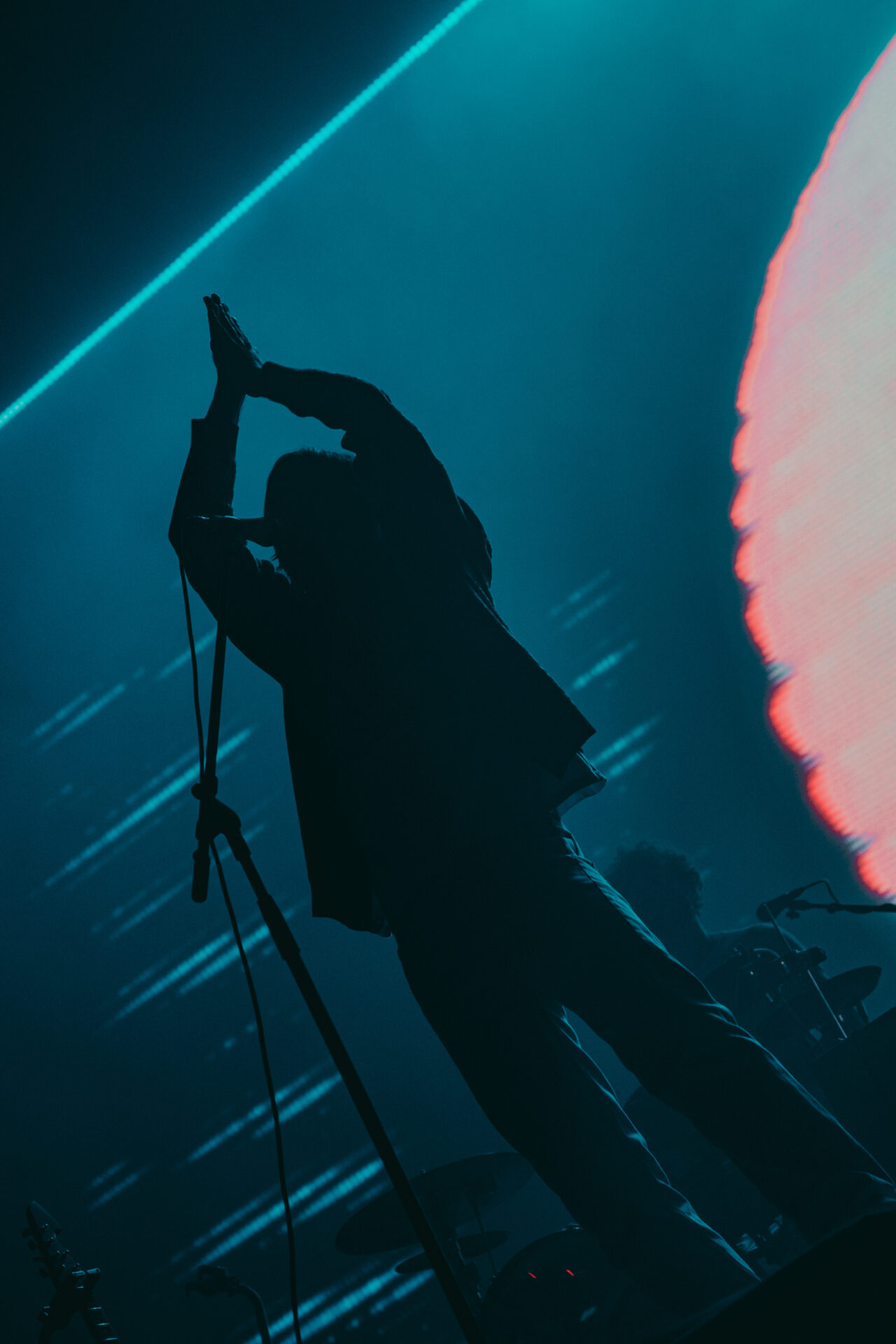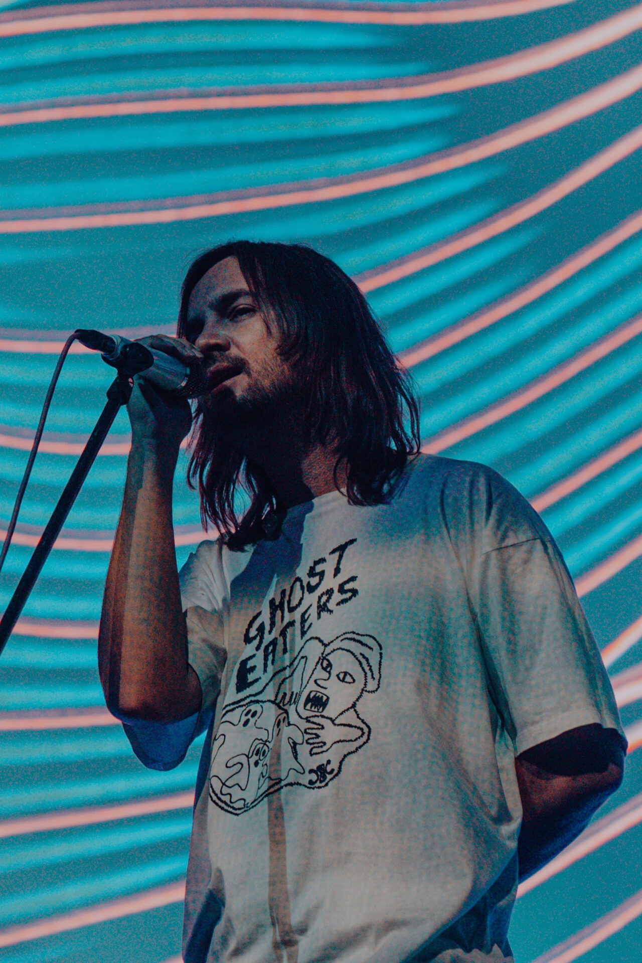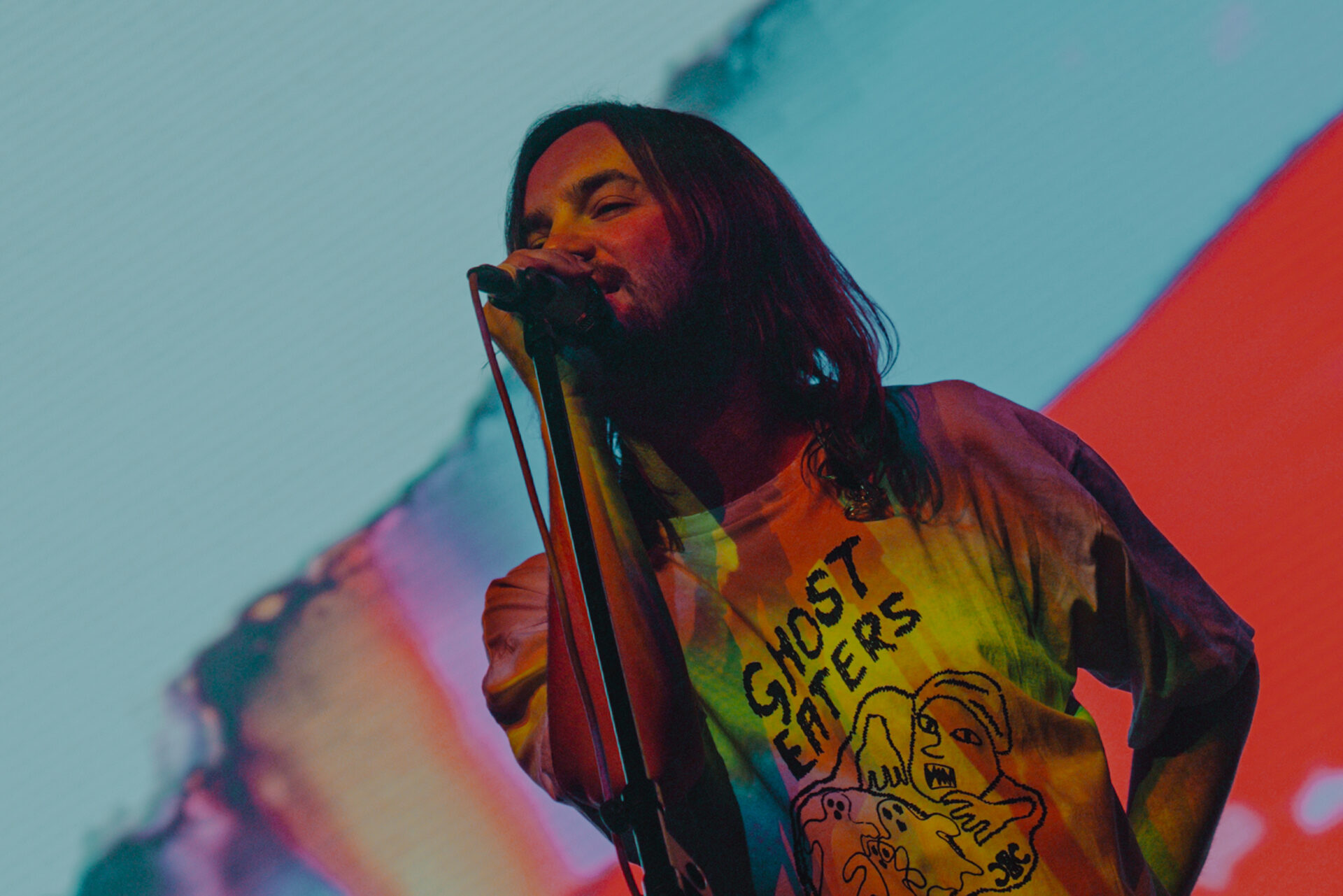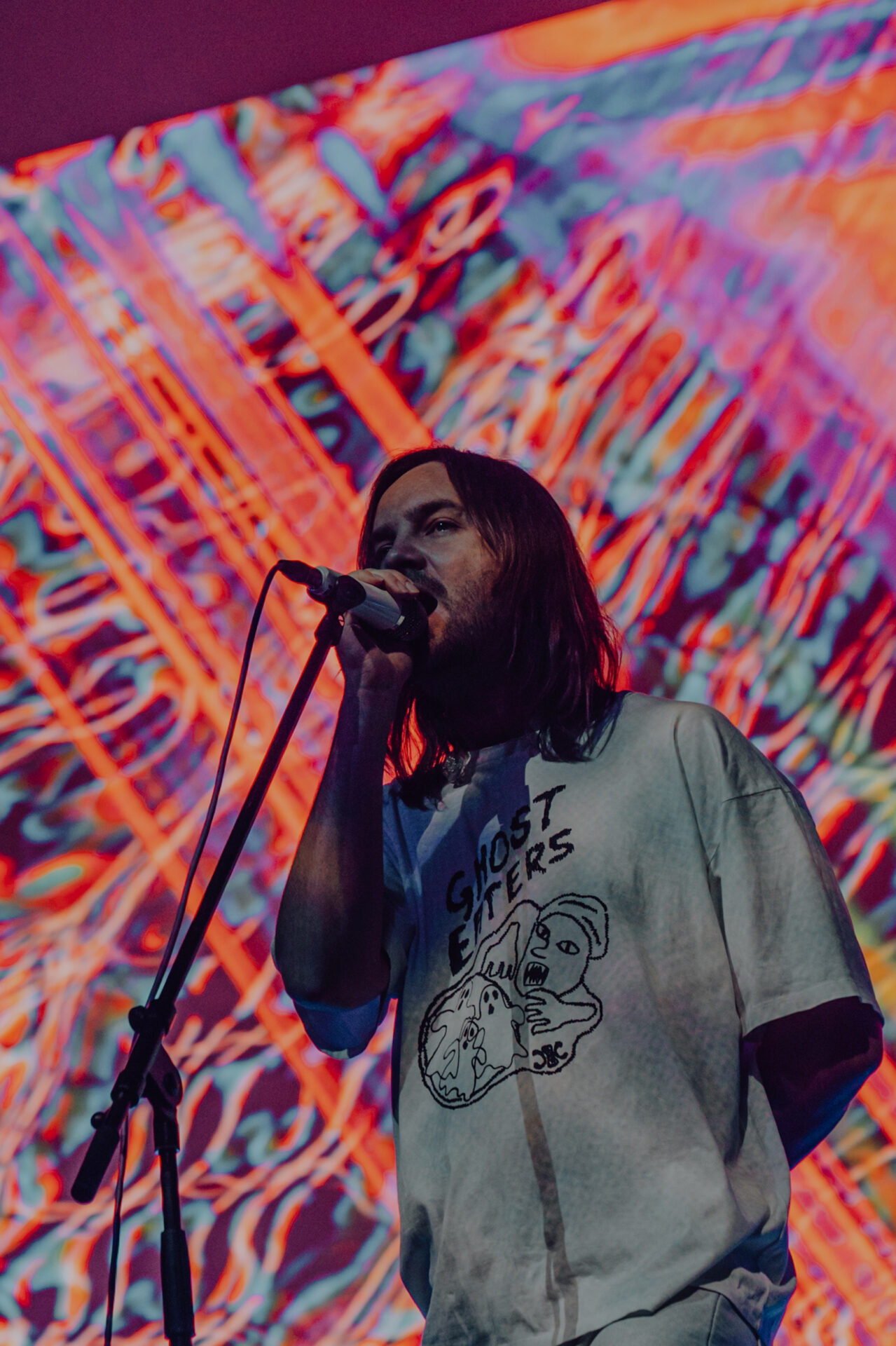 After a 30-minute break, the stage had been cleared and set up for Tame Impala’s set of epic proportions. I watched from the pit at stage left as a bright white screen came on at 9 pm sharp. A clinician appeared on the screen, discussing the benefits of Rushium and encouraging fans to take their Rushium now — so it would kick in at the height of the Tame Impala set. The video distorted and faded to black as Tame Impala took the stage.