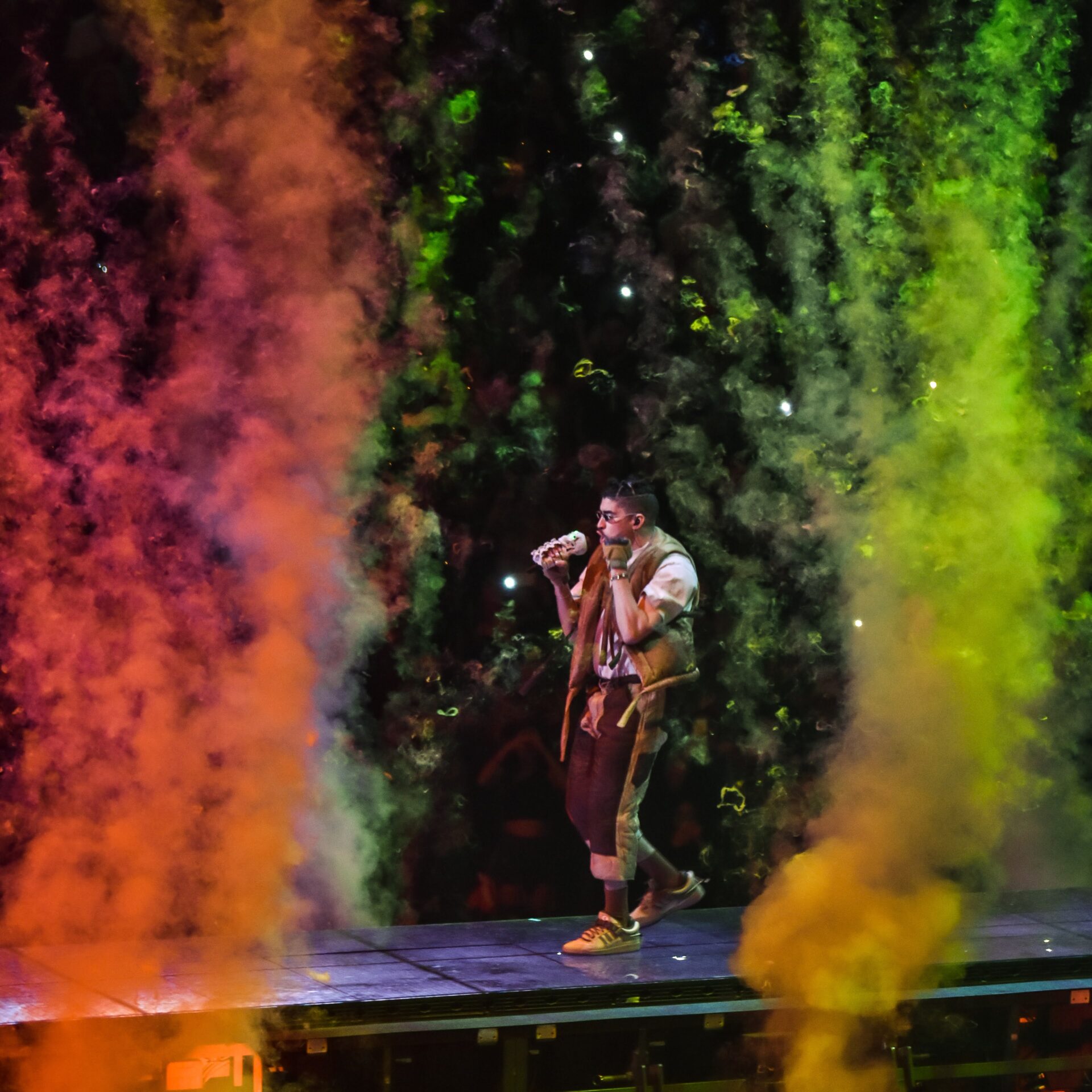 The lights dimmed, the semi turned on and started rumbling, shaking up the entire arena, and ‘El Mundo Es Mío’ played as an 18 wheeler style stage setup moved closer to the audience. Bad Bunny appeared from the top of the truck’s trailer to greet the crowd, screaming so loud they drowned out the music. Pyro shot out of the truck as Bad Bunny ran back and forth along the stage. Having been lucky to see Bad Bunny the last time he performed at the Prudential Center, I knew the energy and production value would be high—yet I never imagined this. I could tell there were no expenses spared by CMN Events and Bad Bunny’s team for putting on this show and giving fans the show that they paid for.