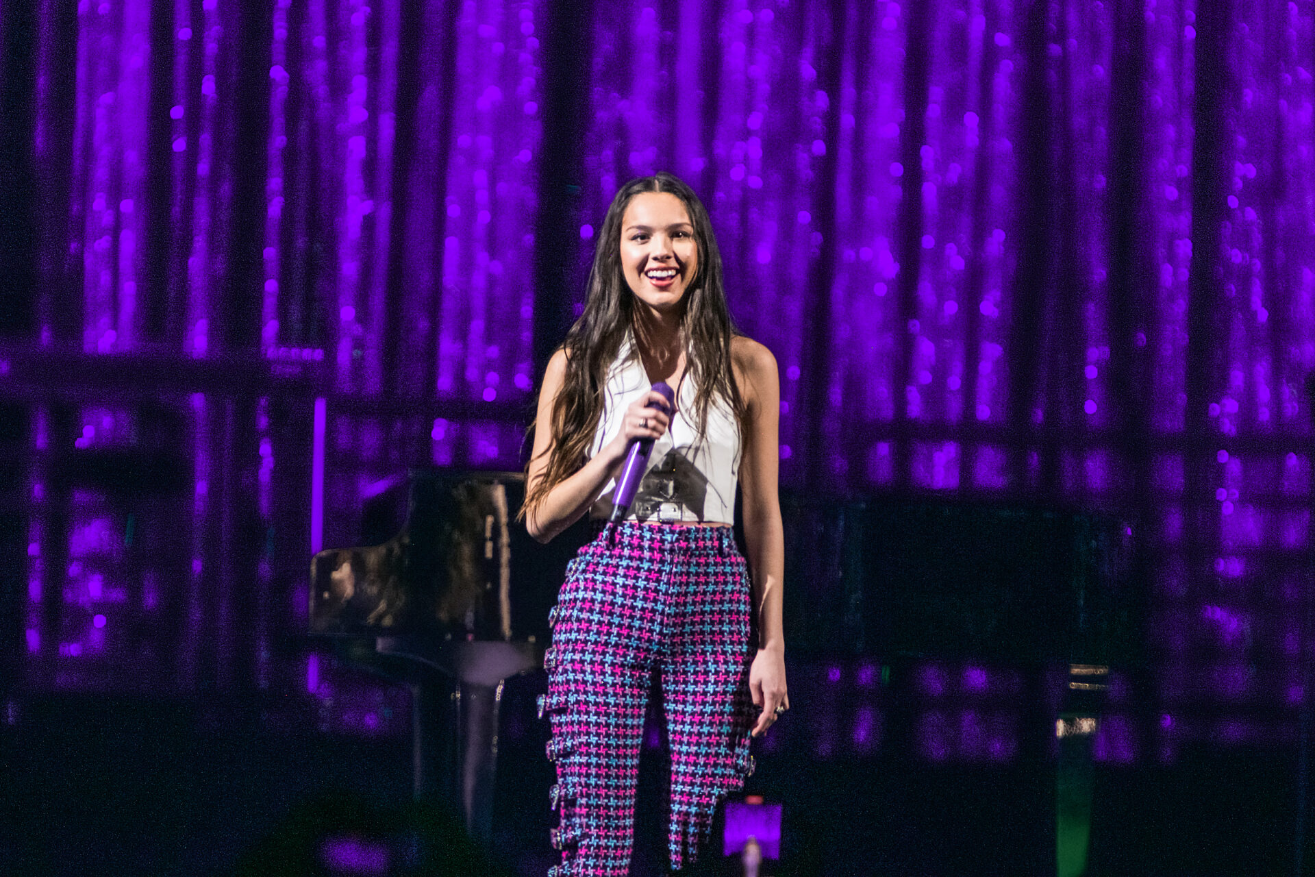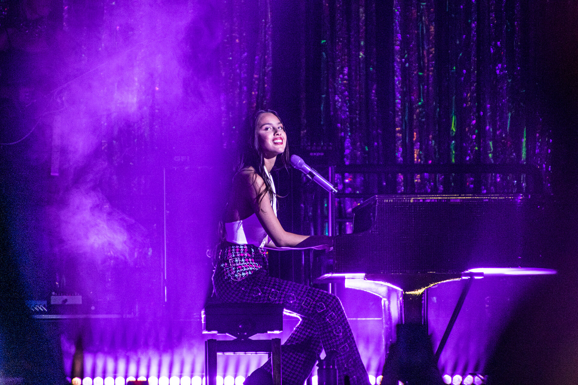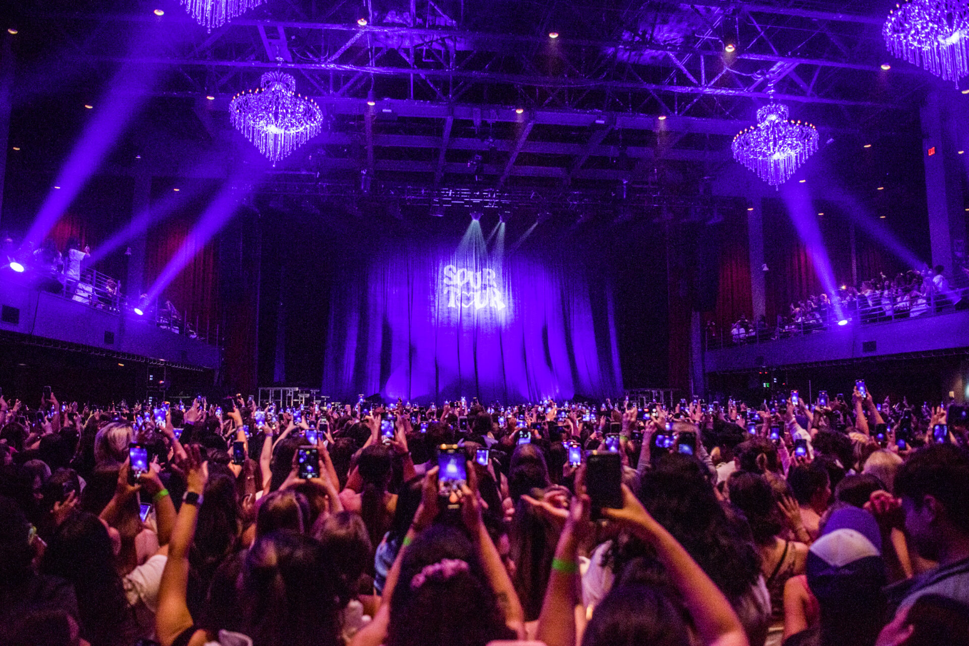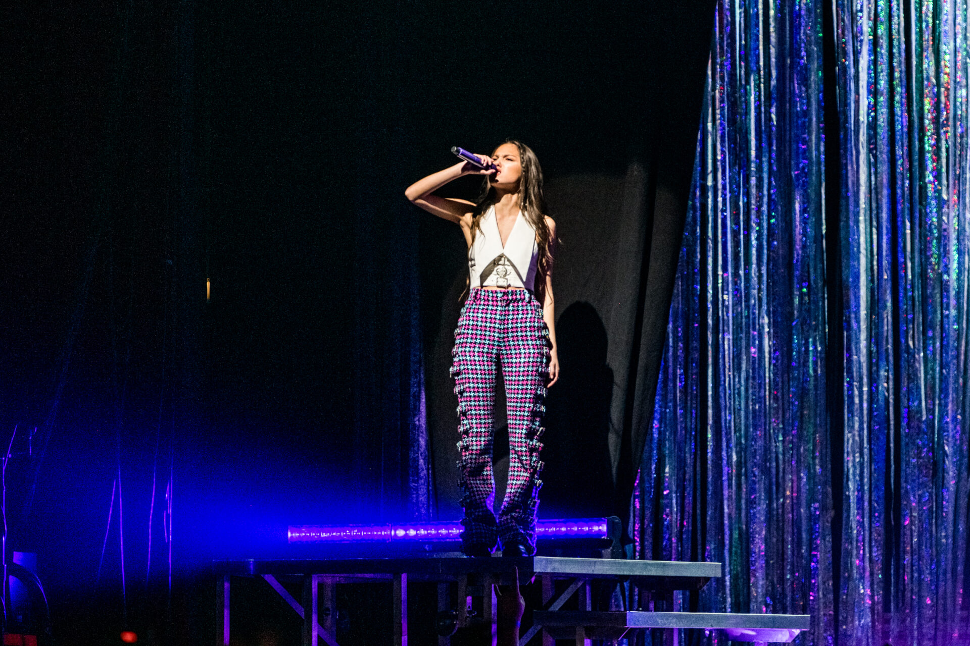 The general admission floor was packed shoulder to shoulder, and the once plain purple backdrop curtain now had a bright Sour logo beaming on it. The excitement was palpable. At 9:15 PM, the lights dimmed, and the crowd started screaming with excitement. We then heard a tease of the opening guitar riff of the song “Brutal” behind the curtain, and the screams increased several decibels higher. A few more guitar teases, and the curtain finally opened to reveal a dazzling prom stage setup complete with silver streamers, a disco ball, and bleachers that flanked each side of the stage.