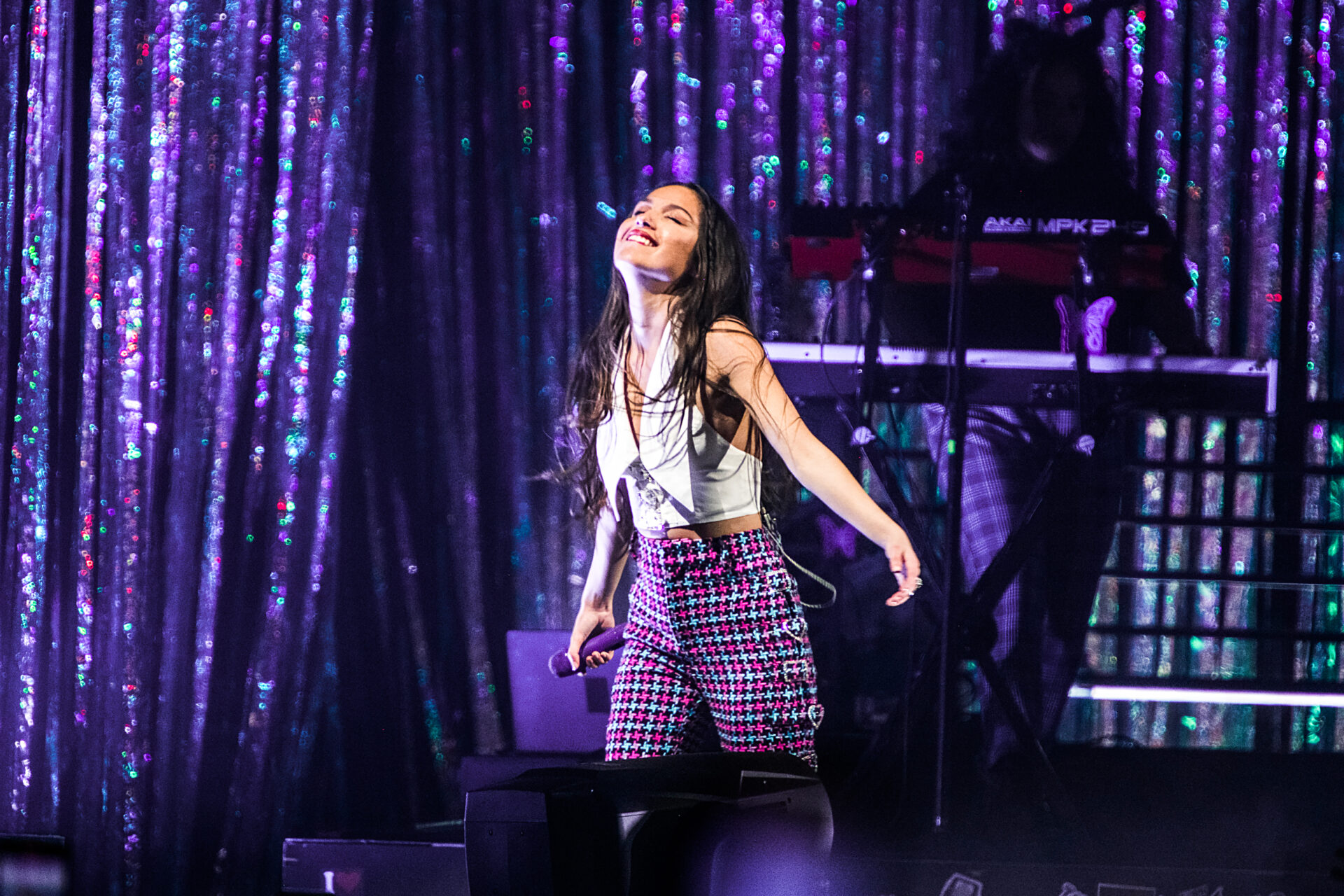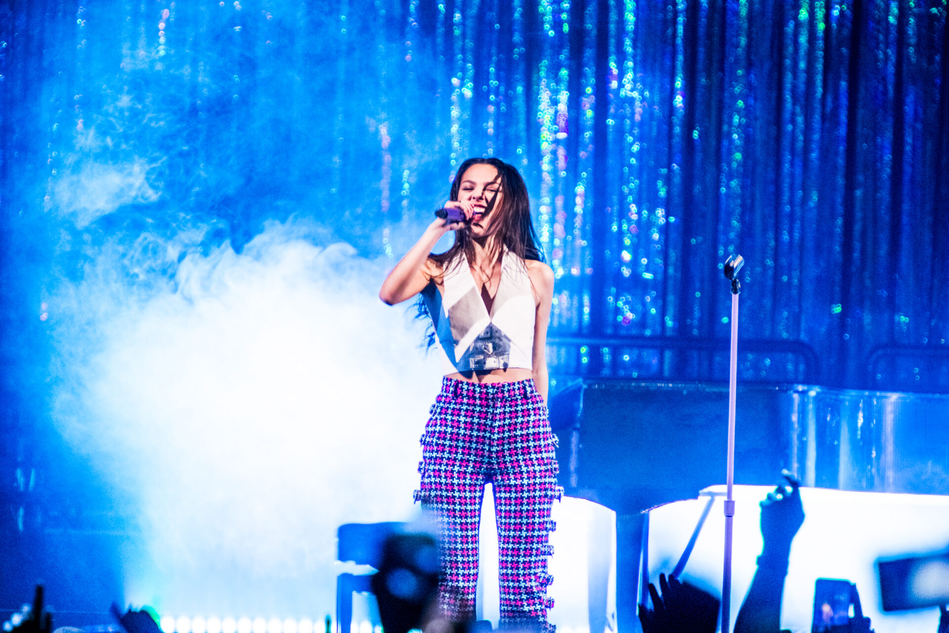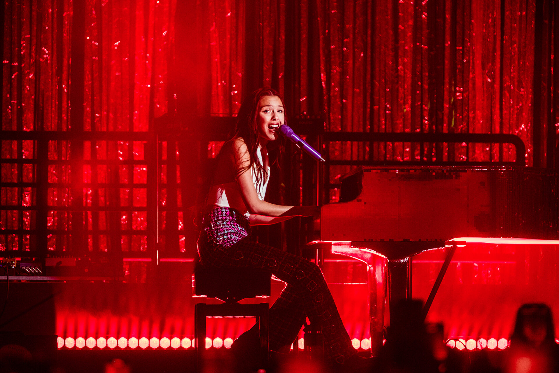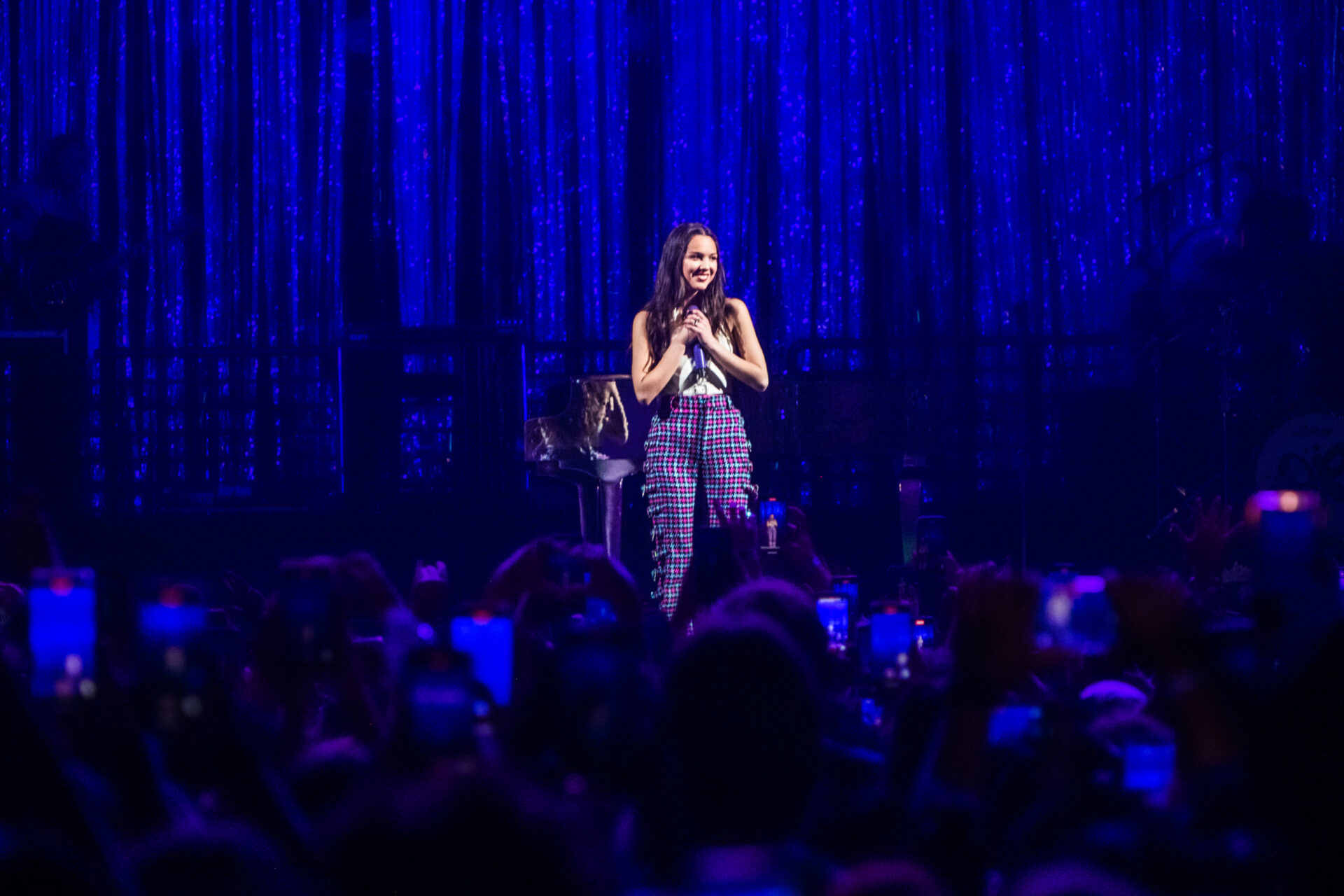 The general admission floor was packed shoulder to shoulder, and the once plain purple backdrop curtain now had a bright Sour logo beaming on it. The excitement was palpable. At 9:15 PM, the lights dimmed, and the crowd started screaming with excitement. We then heard a tease of the opening guitar riff of the song “Brutal” behind the curtain, and the screams increased several decibels higher. A few more guitar teases, and the curtain finally opened to reveal a dazzling prom stage setup complete with silver streamers, a disco ball, and bleachers that flanked each side of the stage.