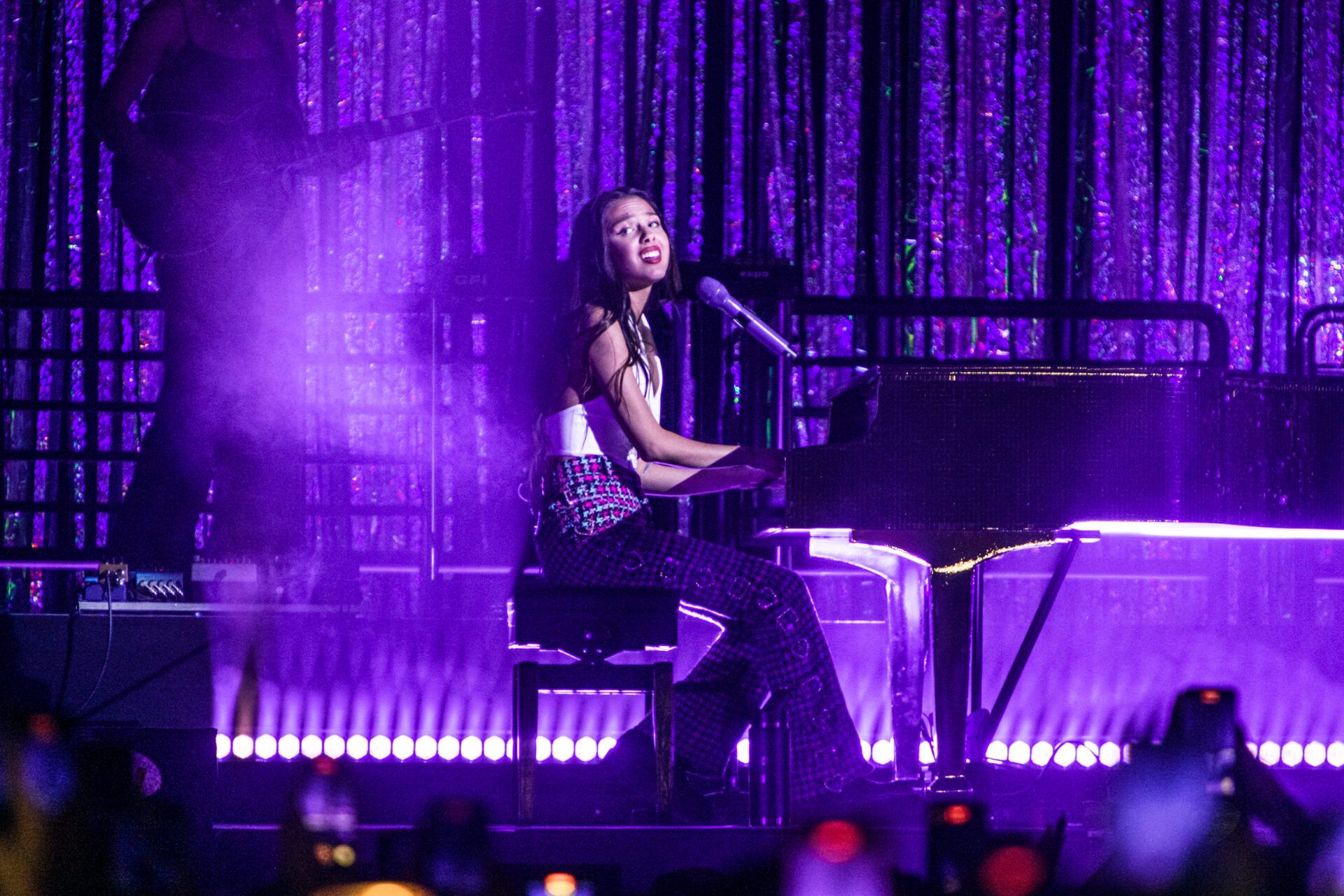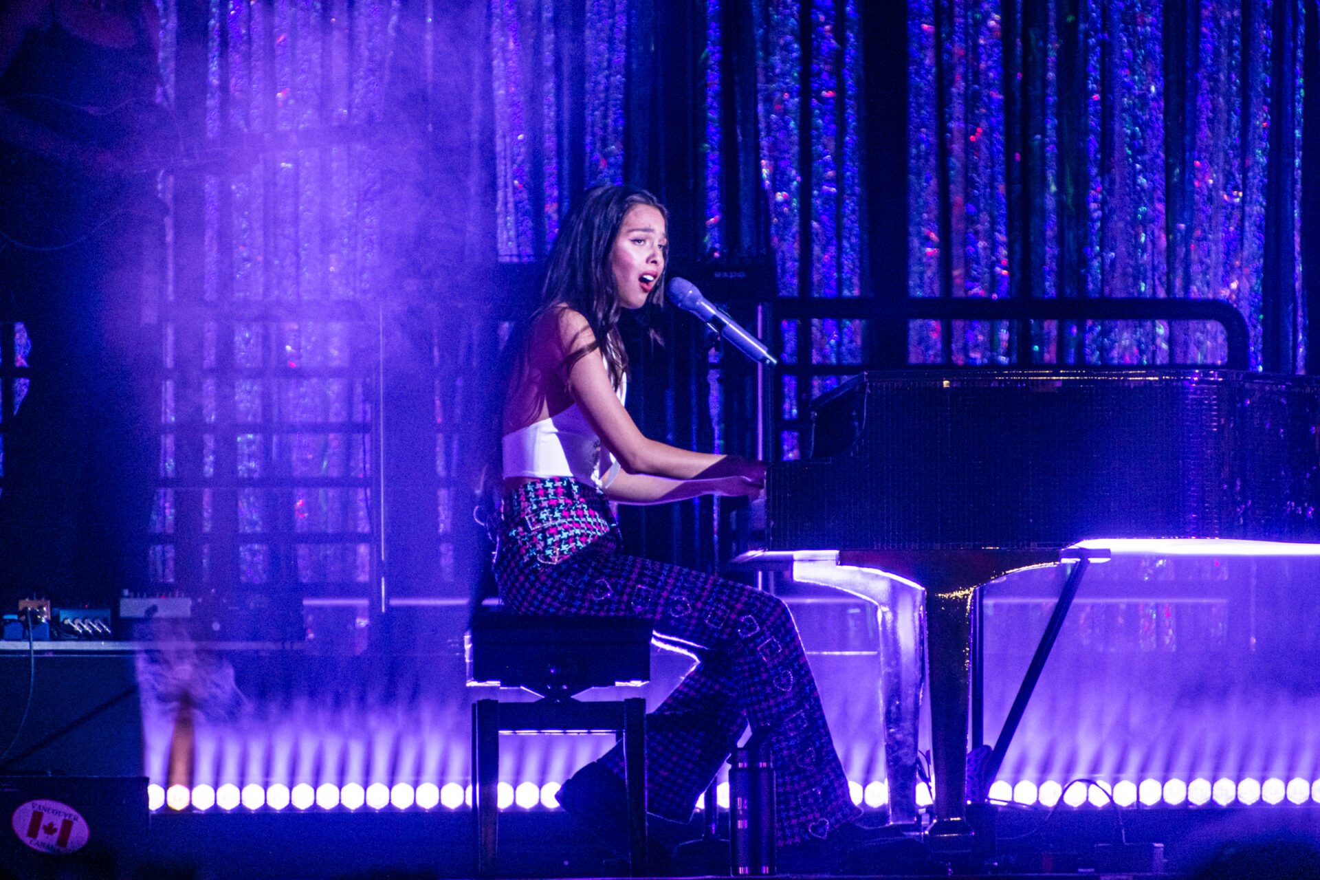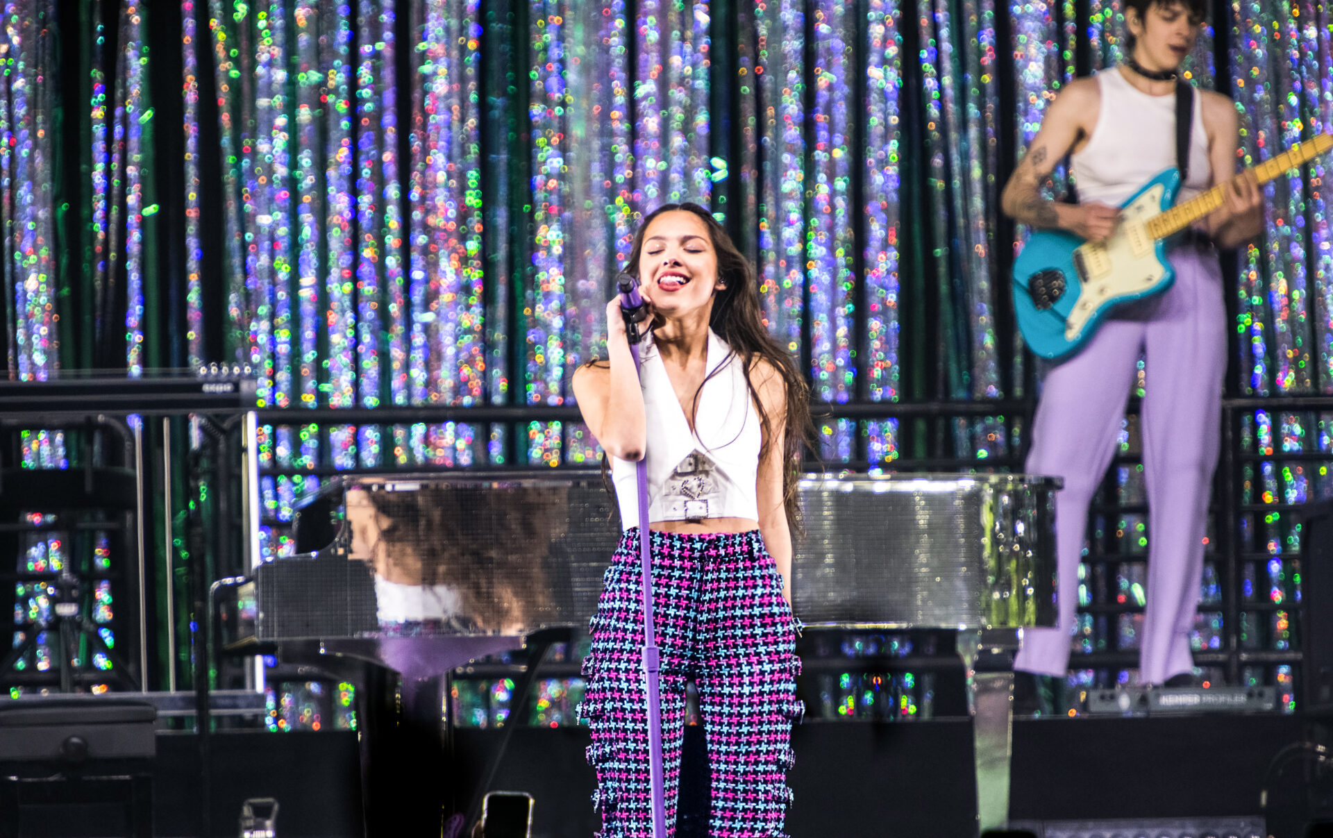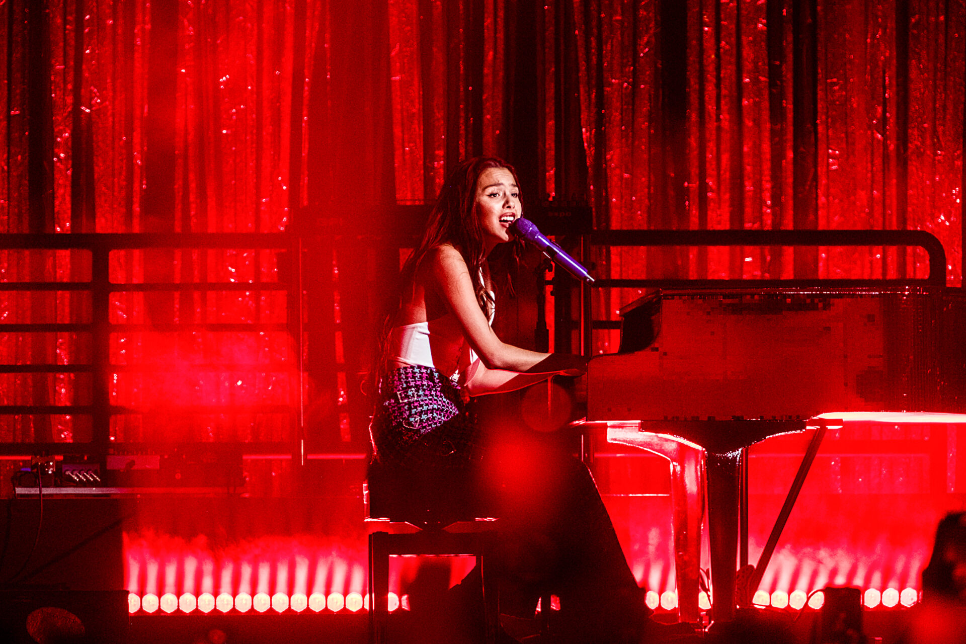 The general admission floor was packed shoulder to shoulder, and the once plain purple backdrop curtain now had a bright Sour logo beaming on it. The excitement was palpable. At 9:15 PM, the lights dimmed, and the crowd started screaming with excitement. We then heard a tease of the opening guitar riff of the song “Brutal” behind the curtain, and the screams increased several decibels higher. A few more guitar teases, and the curtain finally opened to reveal a dazzling prom stage setup complete with silver streamers, a disco ball, and bleachers that flanked each side of the stage.