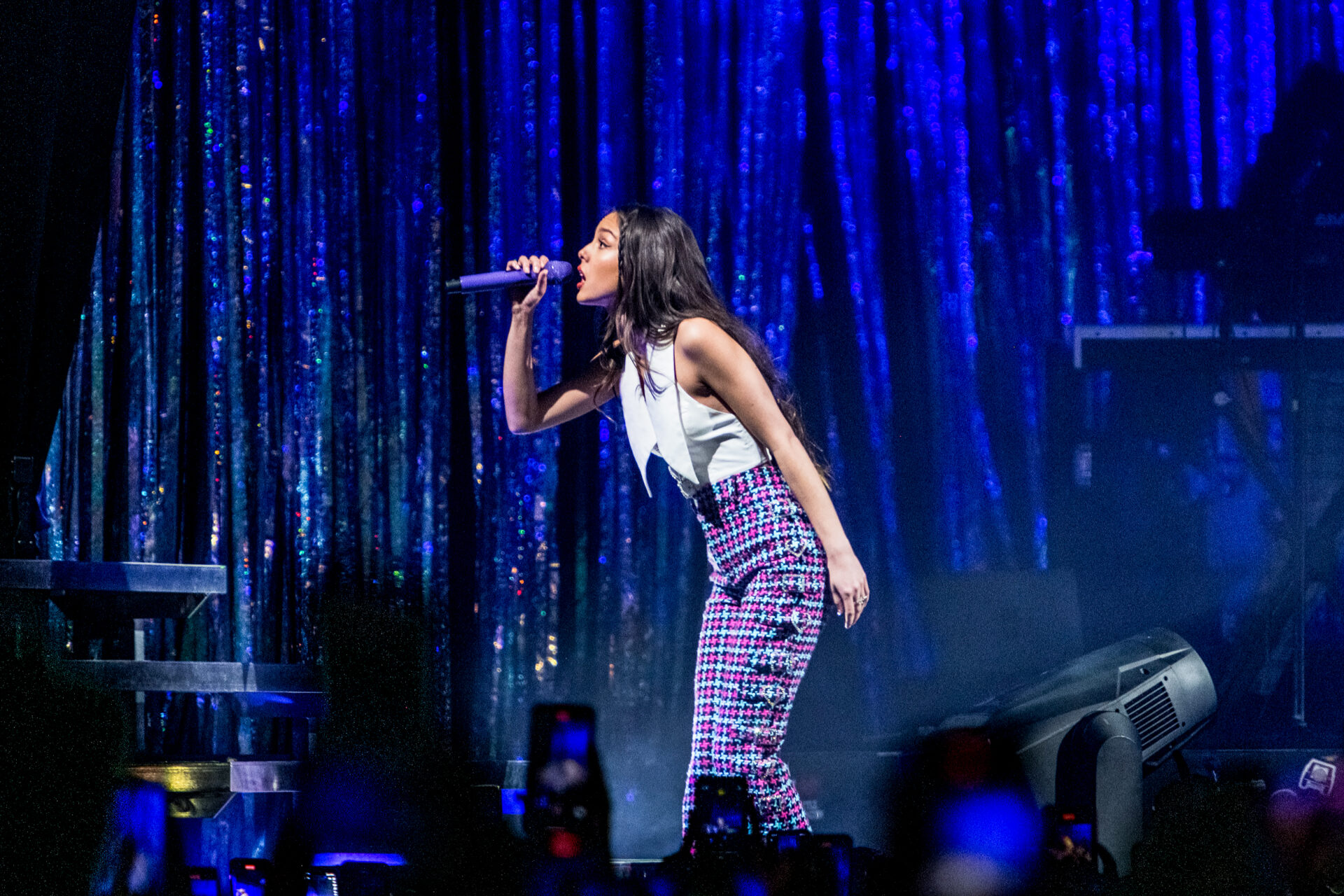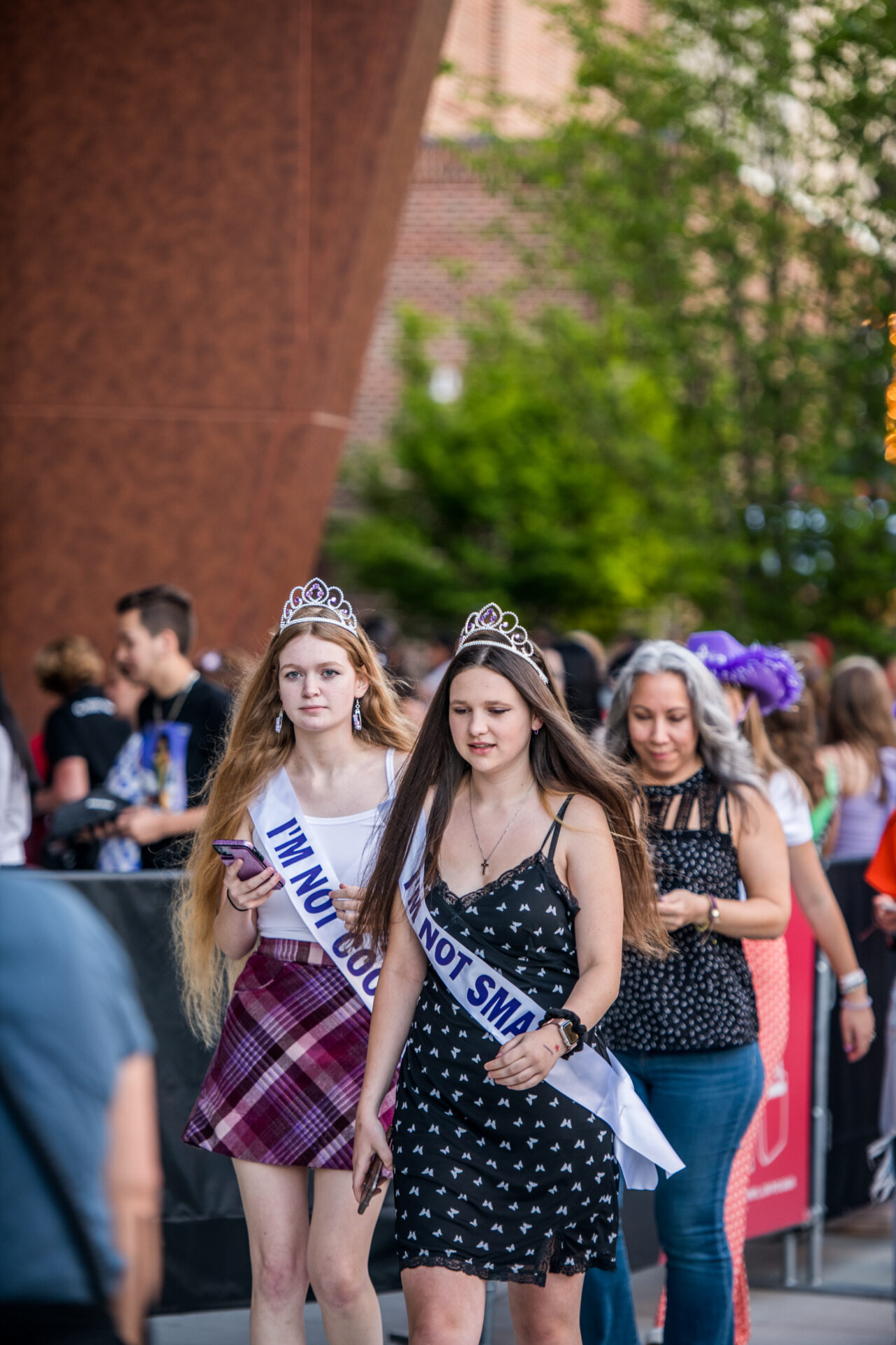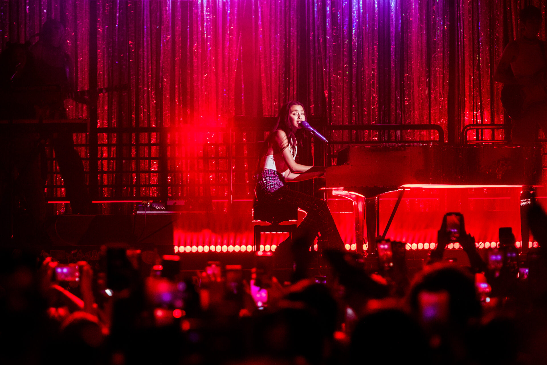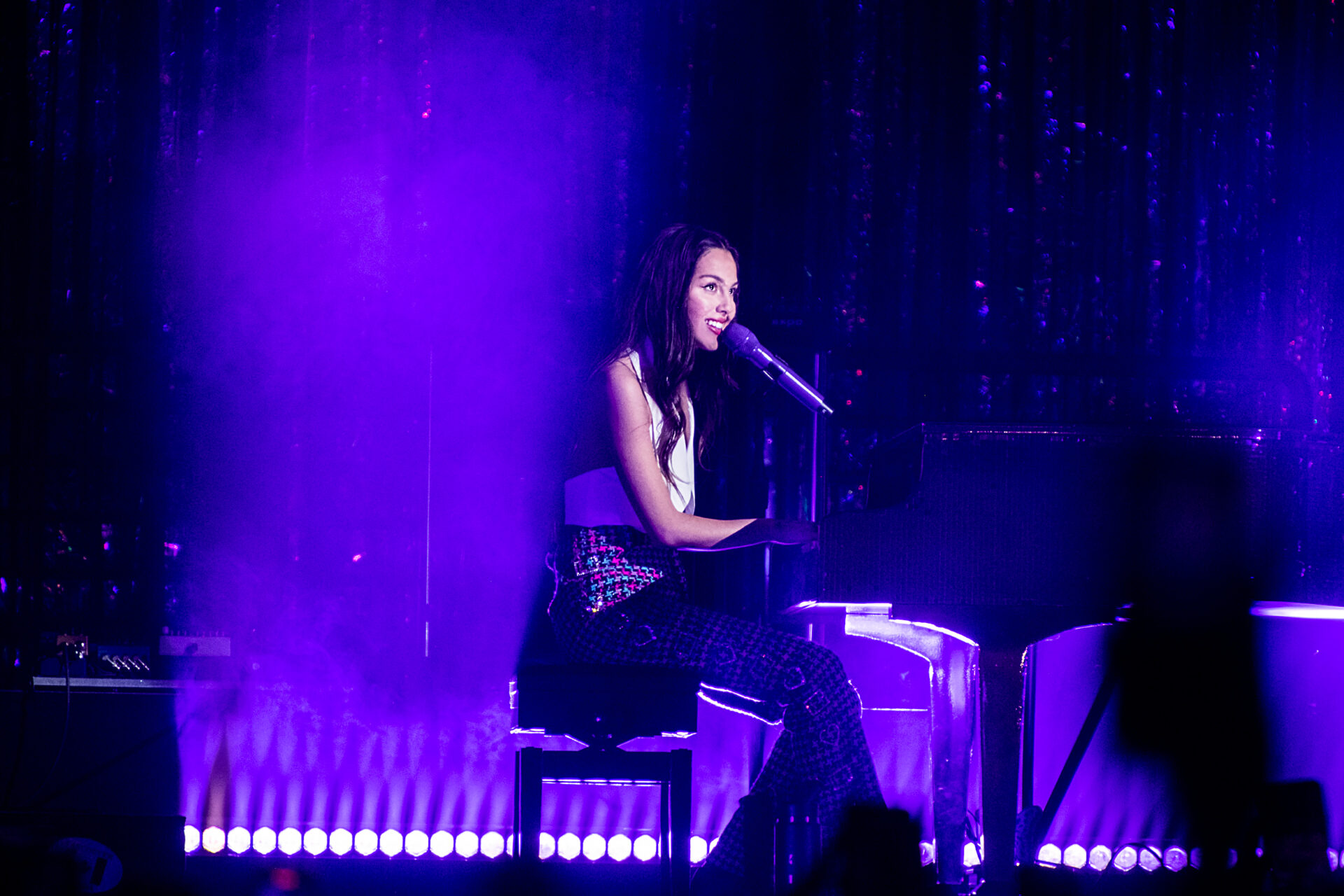 The general admission floor was packed shoulder to shoulder, and the once plain purple backdrop curtain now had a bright Sour logo beaming on it. The excitement was palpable. At 9:15 PM, the lights dimmed, and the crowd started screaming with excitement. We then heard a tease of the opening guitar riff of the song “Brutal” behind the curtain, and the screams increased several decibels higher. A few more guitar teases, and the curtain finally opened to reveal a dazzling prom stage setup complete with silver streamers, a disco ball, and bleachers that flanked each side of the stage.