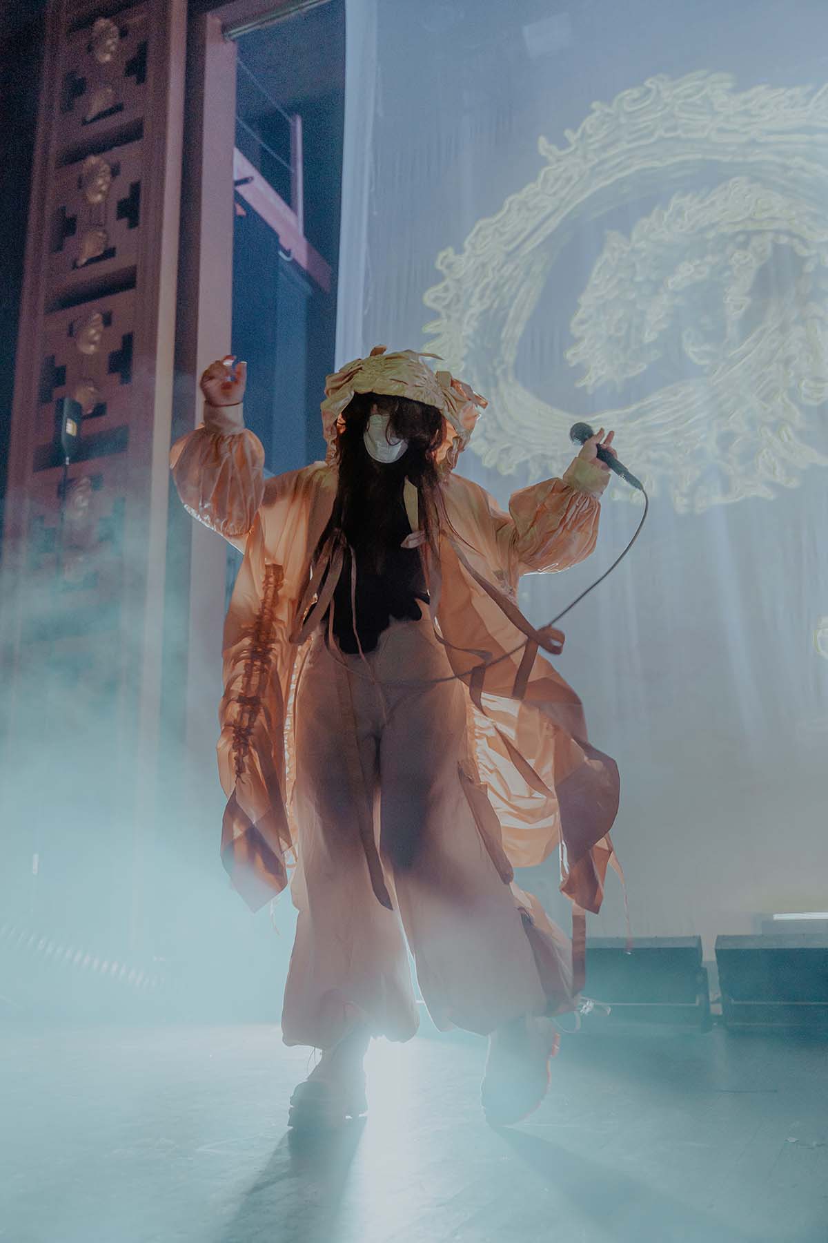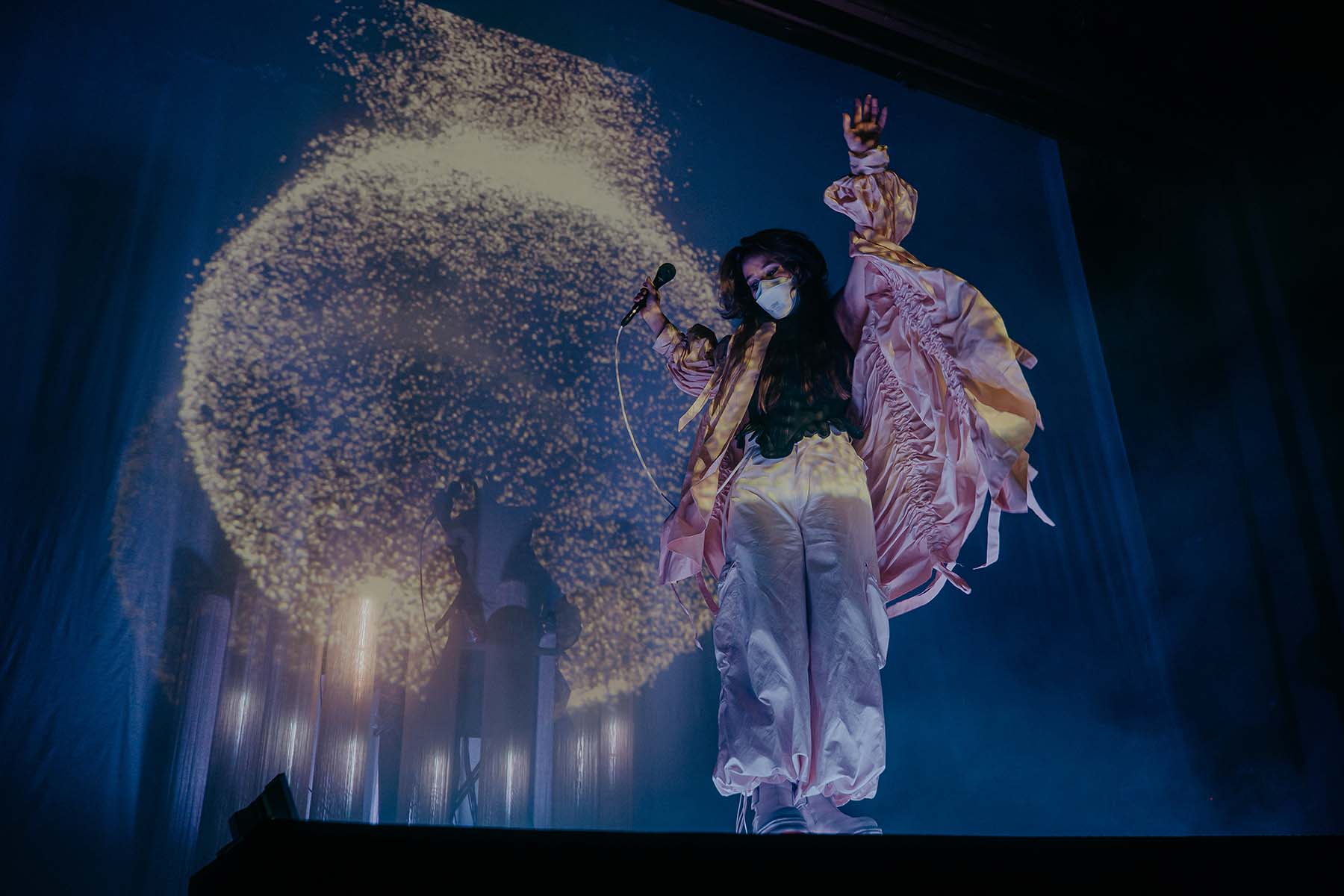 The stage was empty, aside from a pedestal with two lights on each side, which stood in front of a white curtain that hung from the ceiling. Ethereal, eerie music echoed throughout the venue, and two cloth signs were draped from both sides of the balcony. On the left read “Trans Rights” and on the right read “Abortion Now”, echoing the SCOTUS decision to strike down the monumental Roe v. Wade case, as well as hinting at what the SCOTUS plans to attack in the near future.