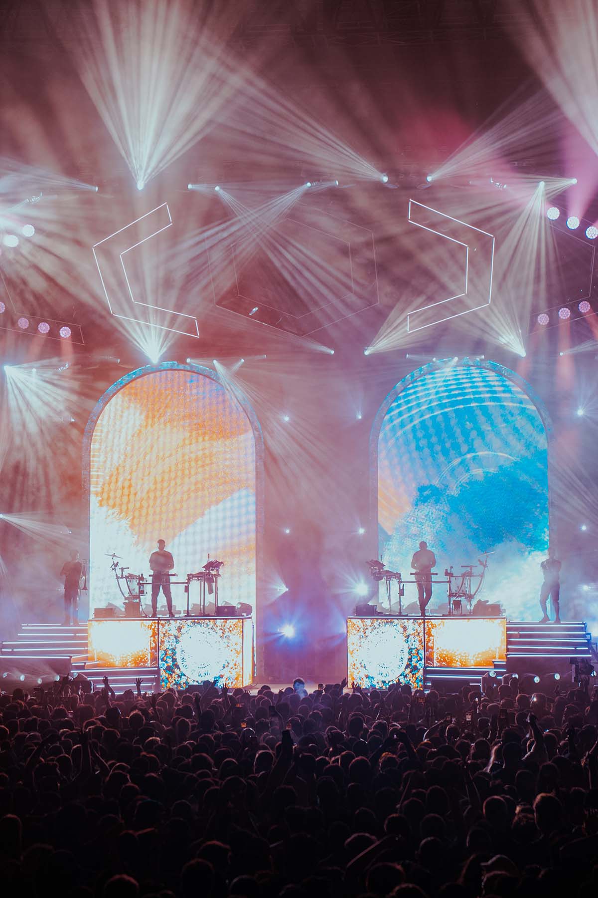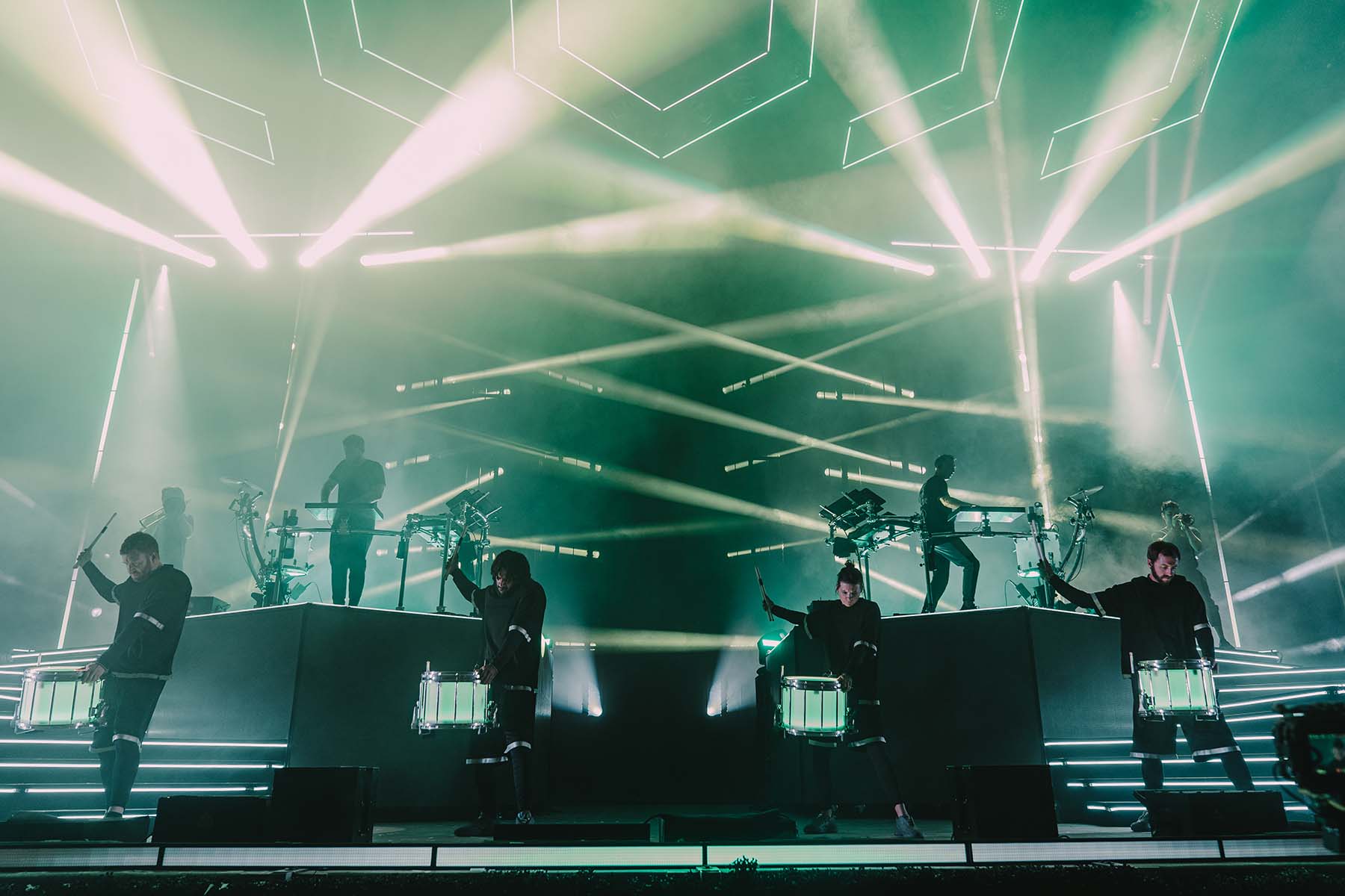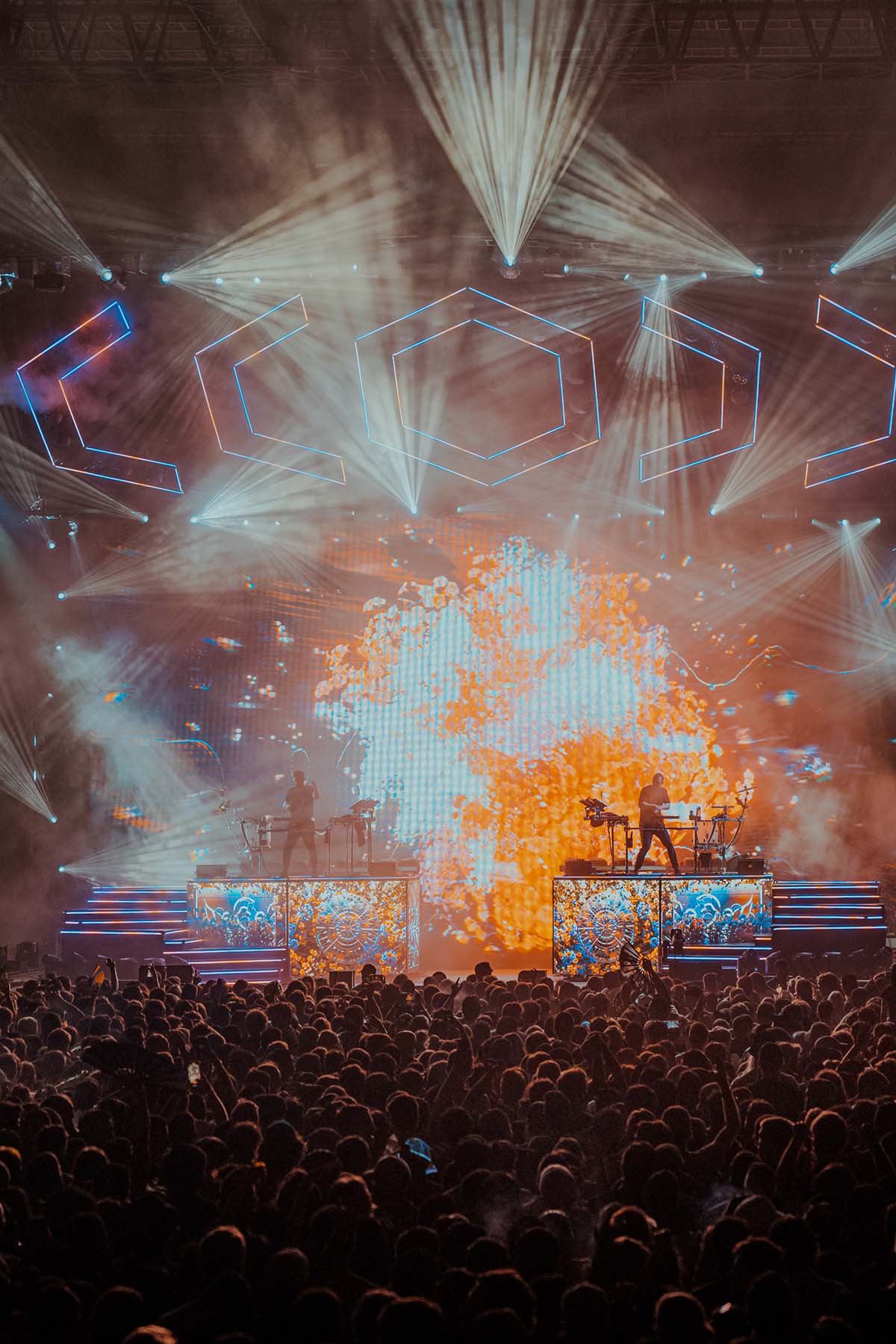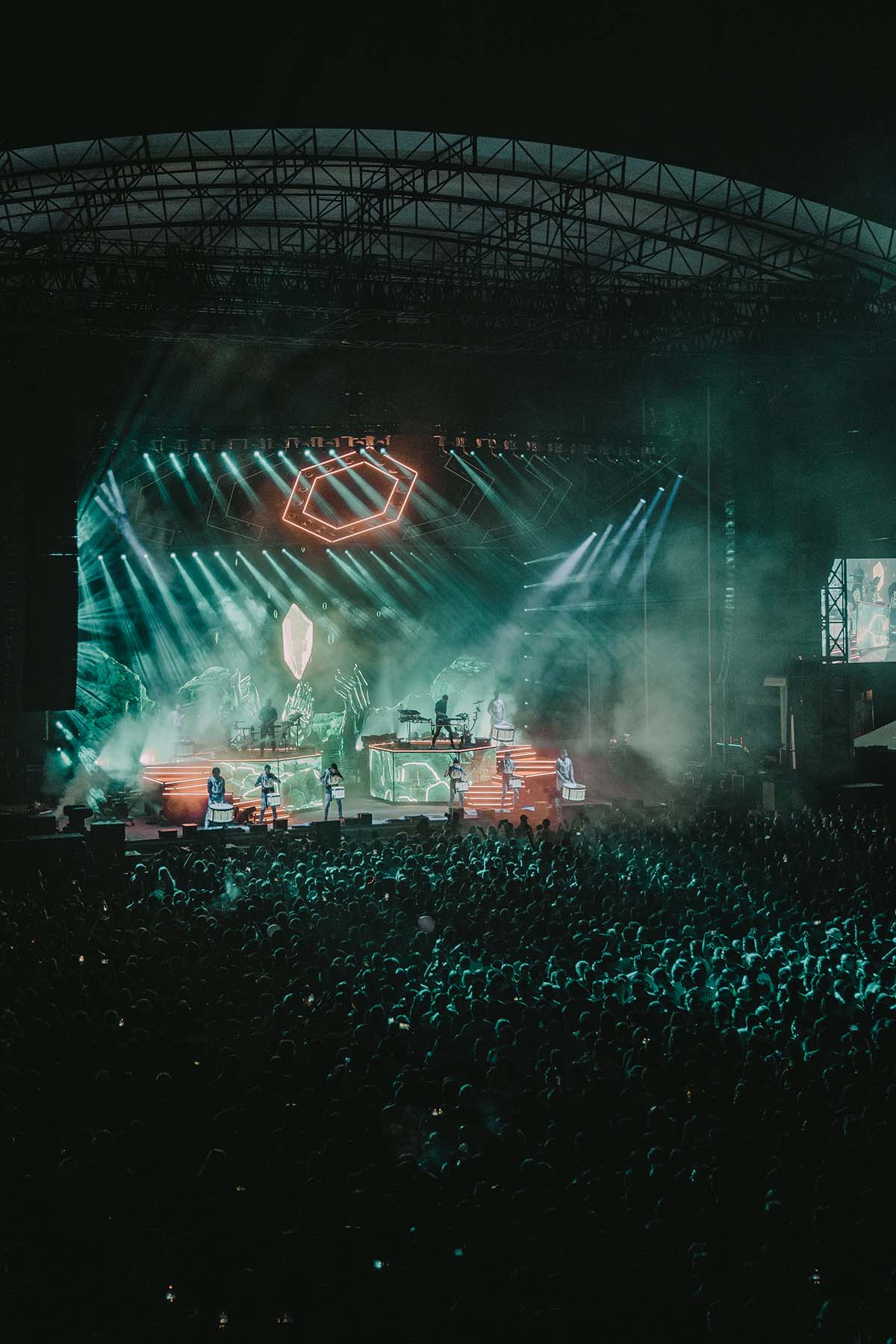 Odesza was the headliner, and they did not disappoint. The stadium was packed to the brim by this point, lit up by the stage lights and giant imagery of what appeared to be a trippy type of video game at the back of the stage. Harrison Mills and Clayton Knight, known also as Catacombkid and BeachesBeaches, appeared on stage with their fists up to the air in a stoic manner, took a moment to embrace the crowd, then dove right into their 25 song set list performance, which included hits like “Love Letter,” “Better Now,” and “The Last Goodbye.” The two played a breathtaking show, filled with a lineup of drummers (which they actually joined in on – see the below photos for a peak at that moment), fire all across the stage, trumpet players, and fireworks to end the night. The truly pulled out all the stops to deliver an unforgettable performance for their New York fans. I had never seen this type of festival-level performance from an artist.