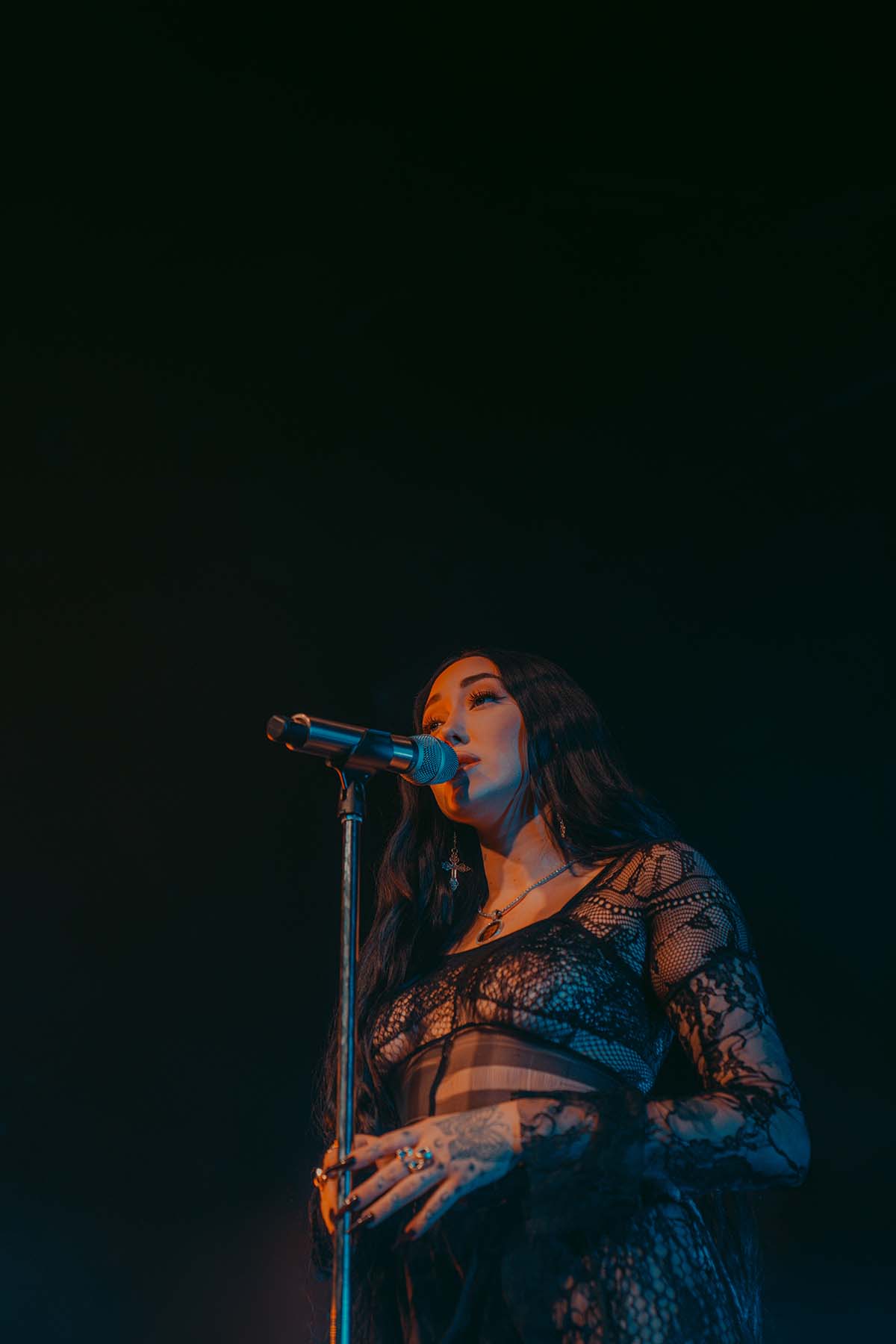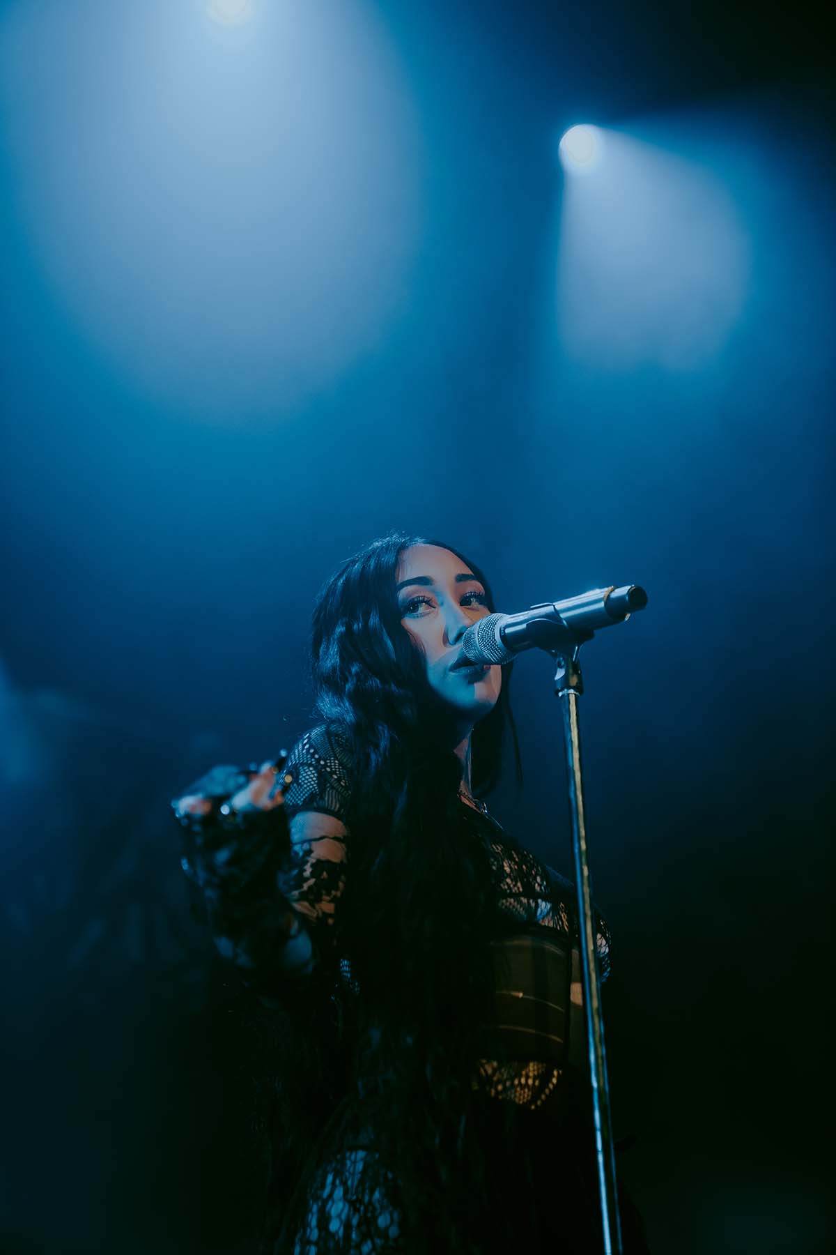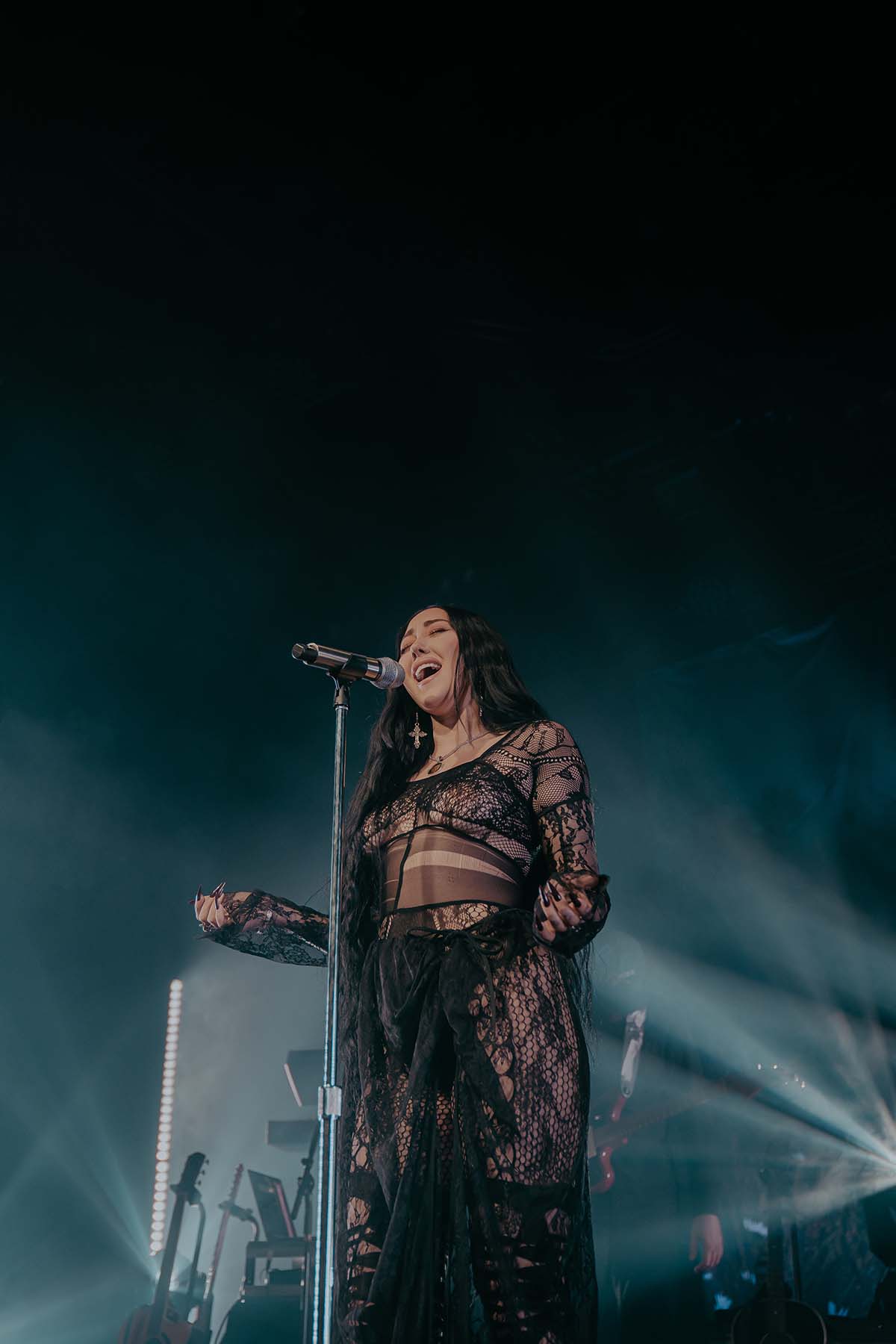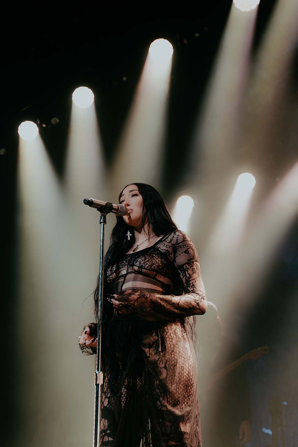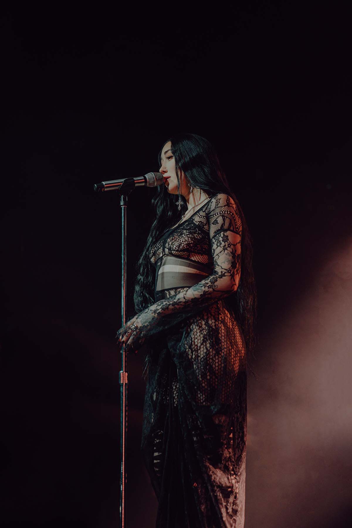 Around 9 pm, the band took to the stage amidst hoots and hollers of excitement. After a brief instrumental introduction, Noah Cyrus appeared from stage right. Out of the darkness, the 22-year-old singer emerged, donning a witch-like black lace dress and dagger-esque eggplant purple fingernails. I was in awe — truly not knowing what to expect before the performance, and even more so after seeing Noah perform live.