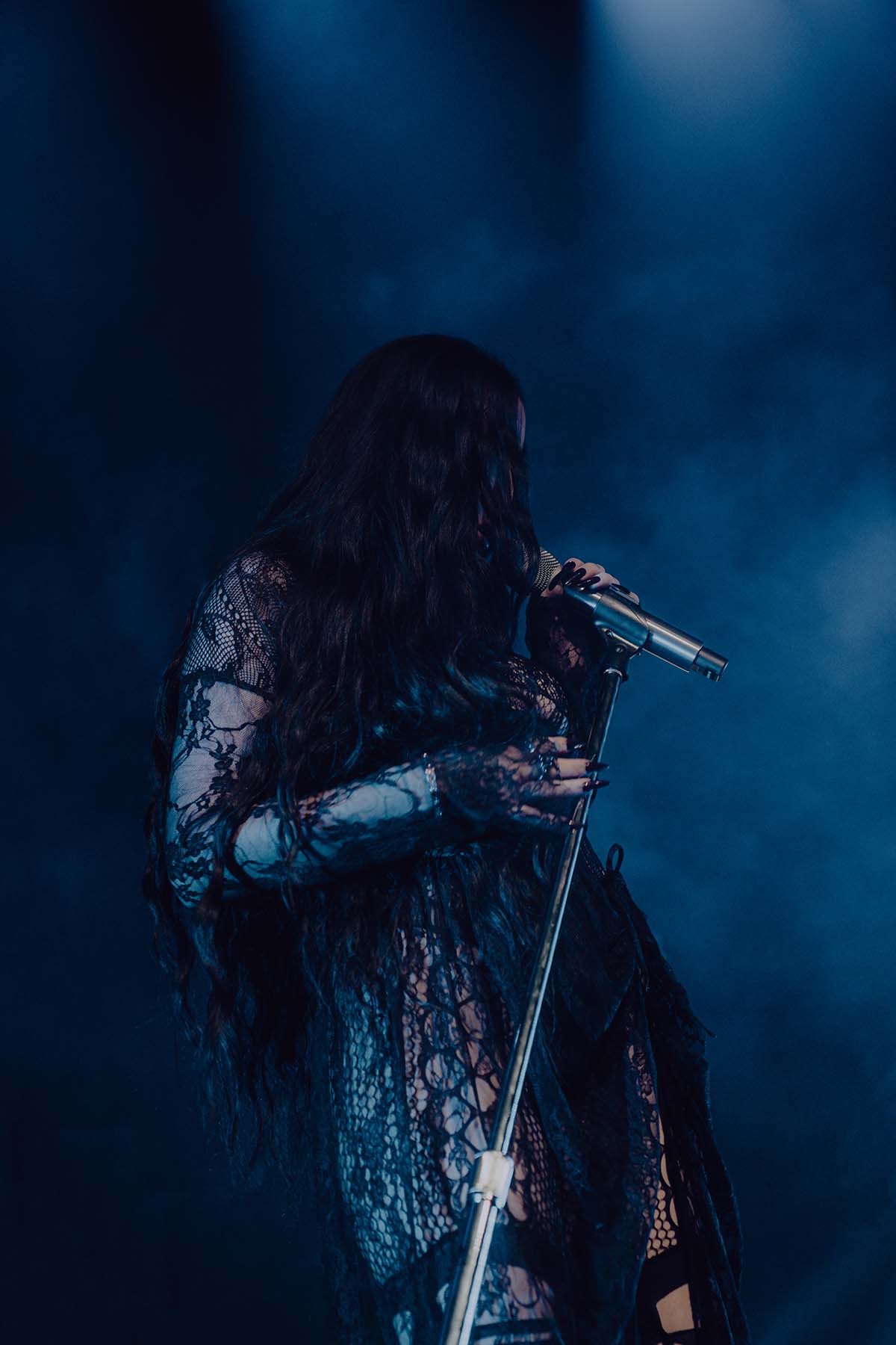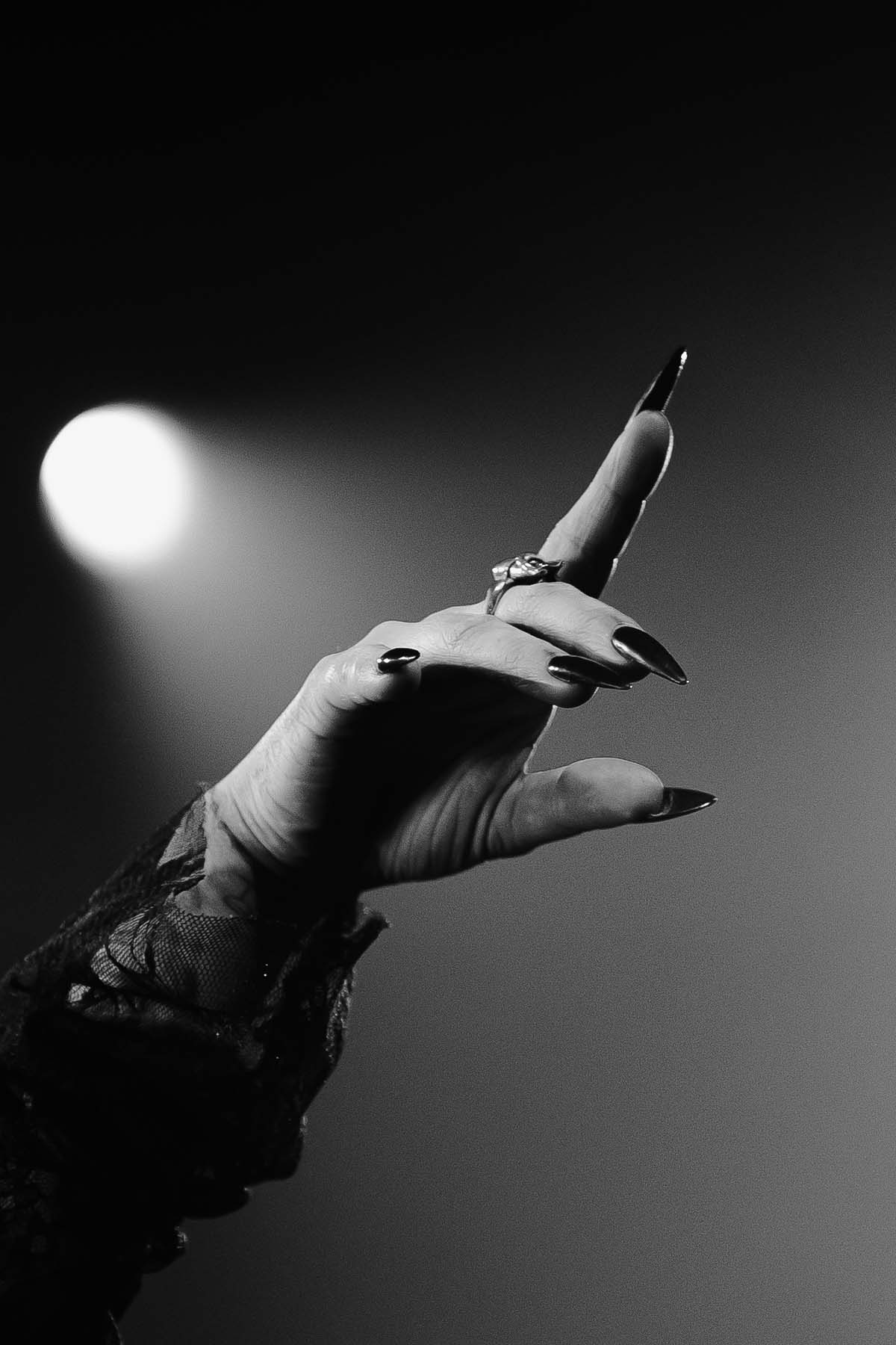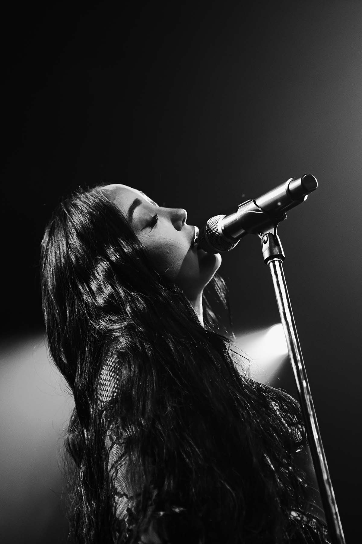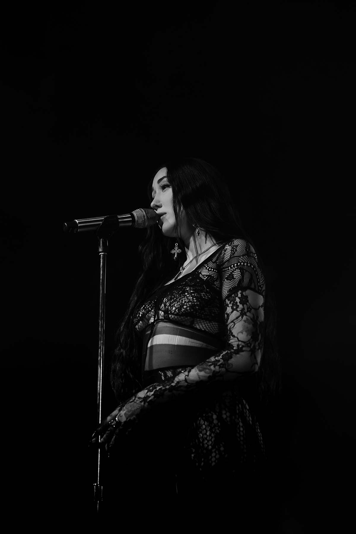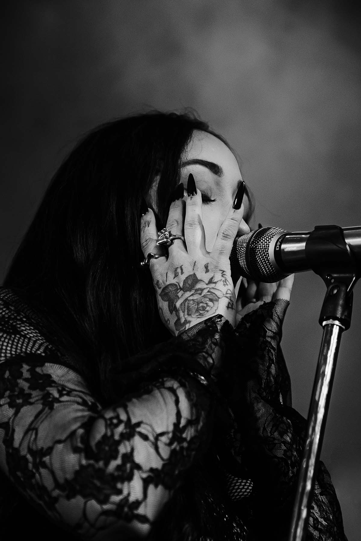 Around 9 pm, the band took to the stage amidst hoots and hollers of excitement. After a brief instrumental introduction, Noah Cyrus appeared from stage right. Out of the darkness, the 22-year-old singer emerged, donning a witch-like black lace dress and dagger-esque eggplant purple fingernails. I was in awe — truly not knowing what to expect before the performance, and even more so after seeing Noah perform live.