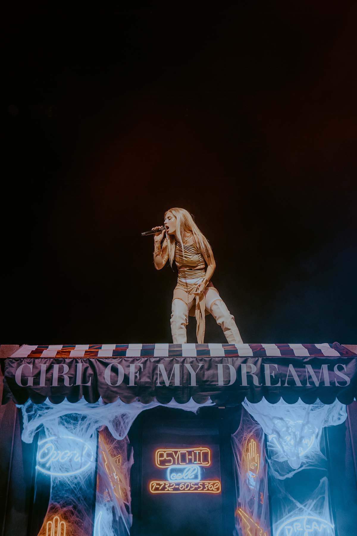 After a lengthy 35 minute break between sets, fans began growing anxious for Fletcher’s arrival. Girls along the barricade kicked off a “Fletcher” chant that did its rounds around the venue before a person dressed as Donkey, from Shrek, graced the stage to remove the black curtains from the set. Beneath the curtain was a set that resembled a New York facade, with a storefront reading “Girl of My Dreams”, the title of Fletcher’s debut album.