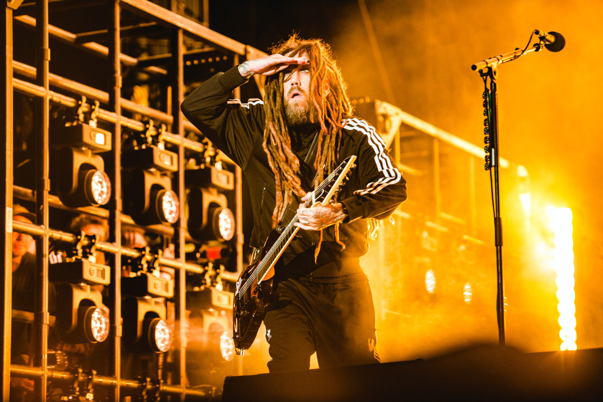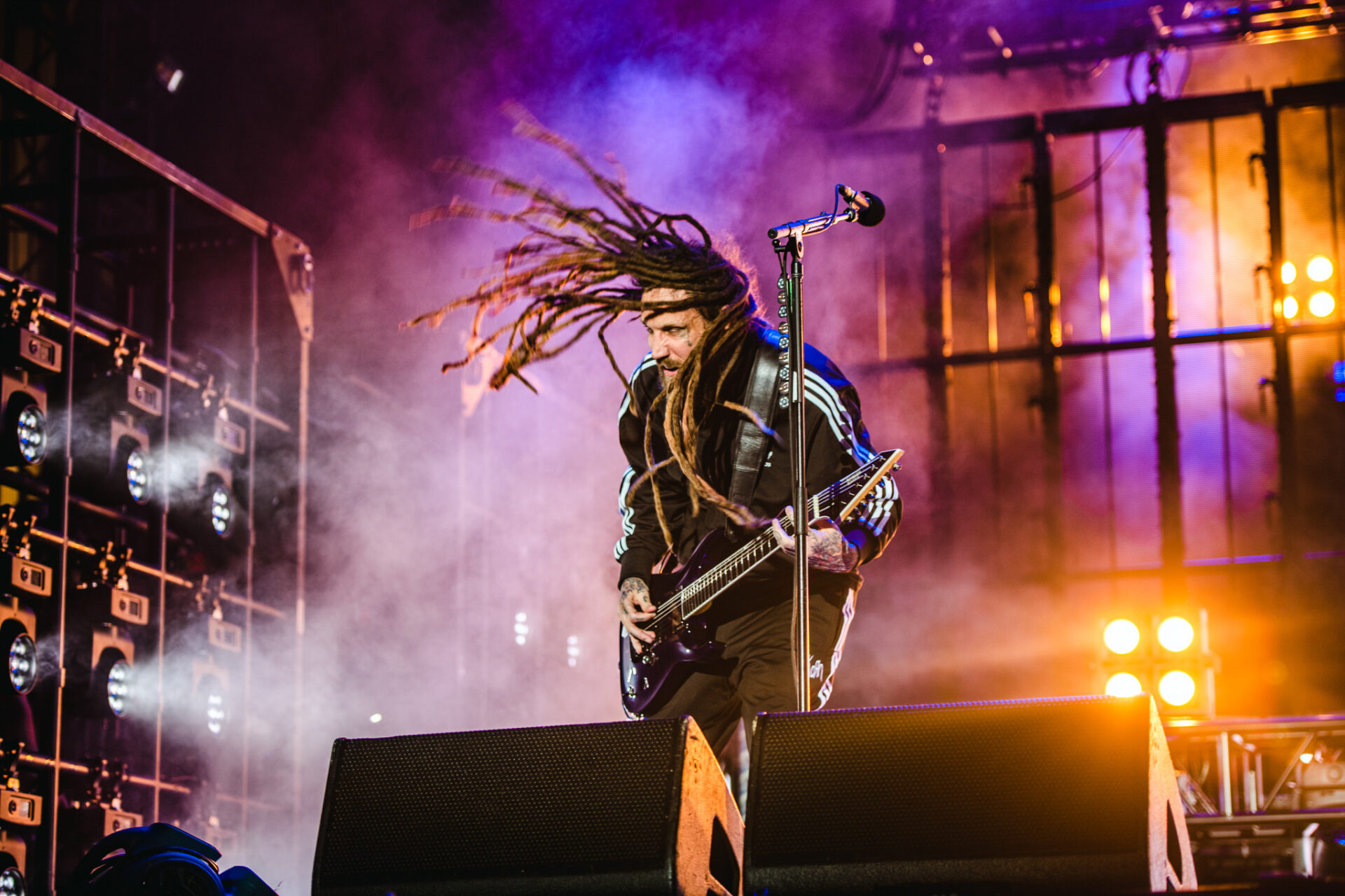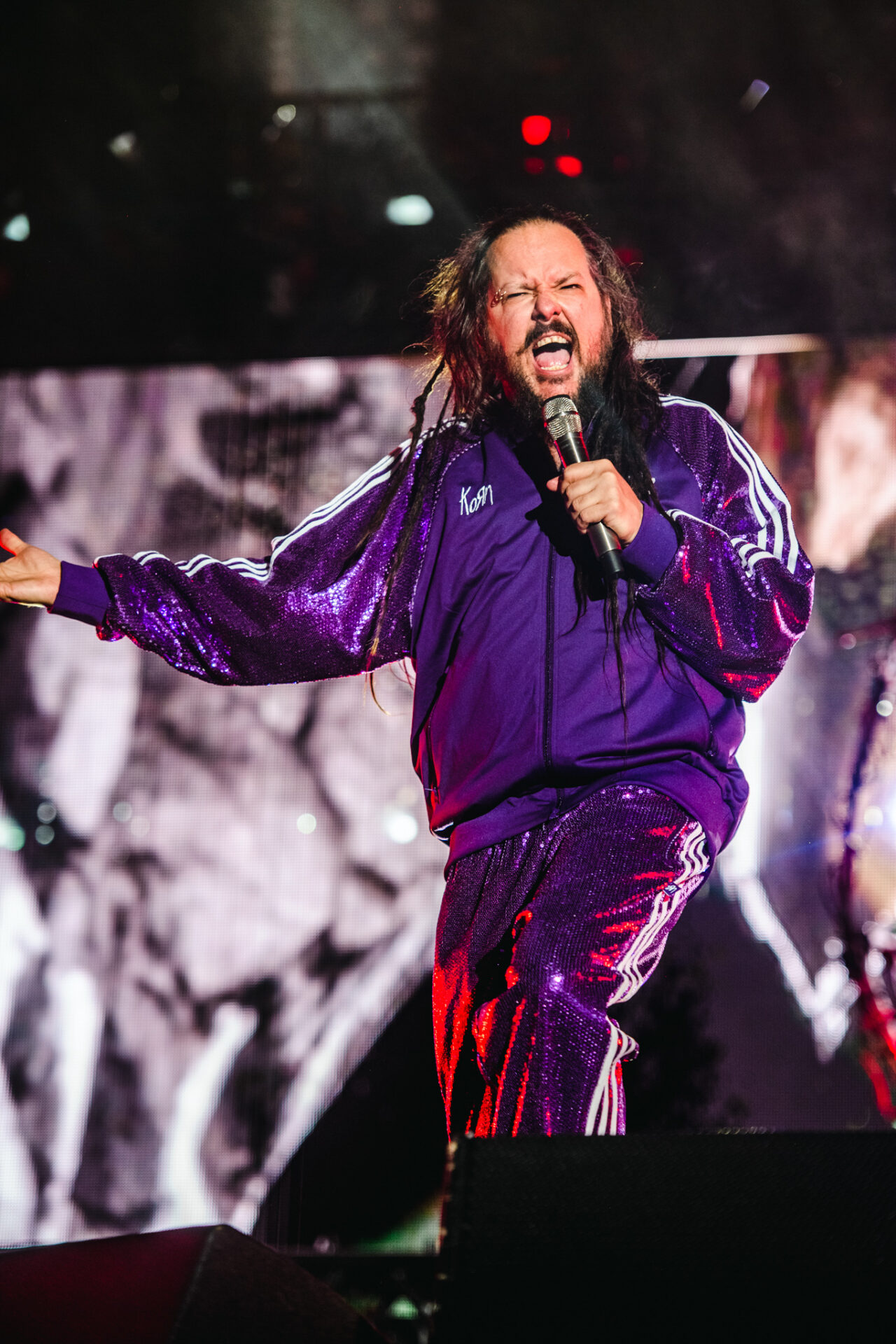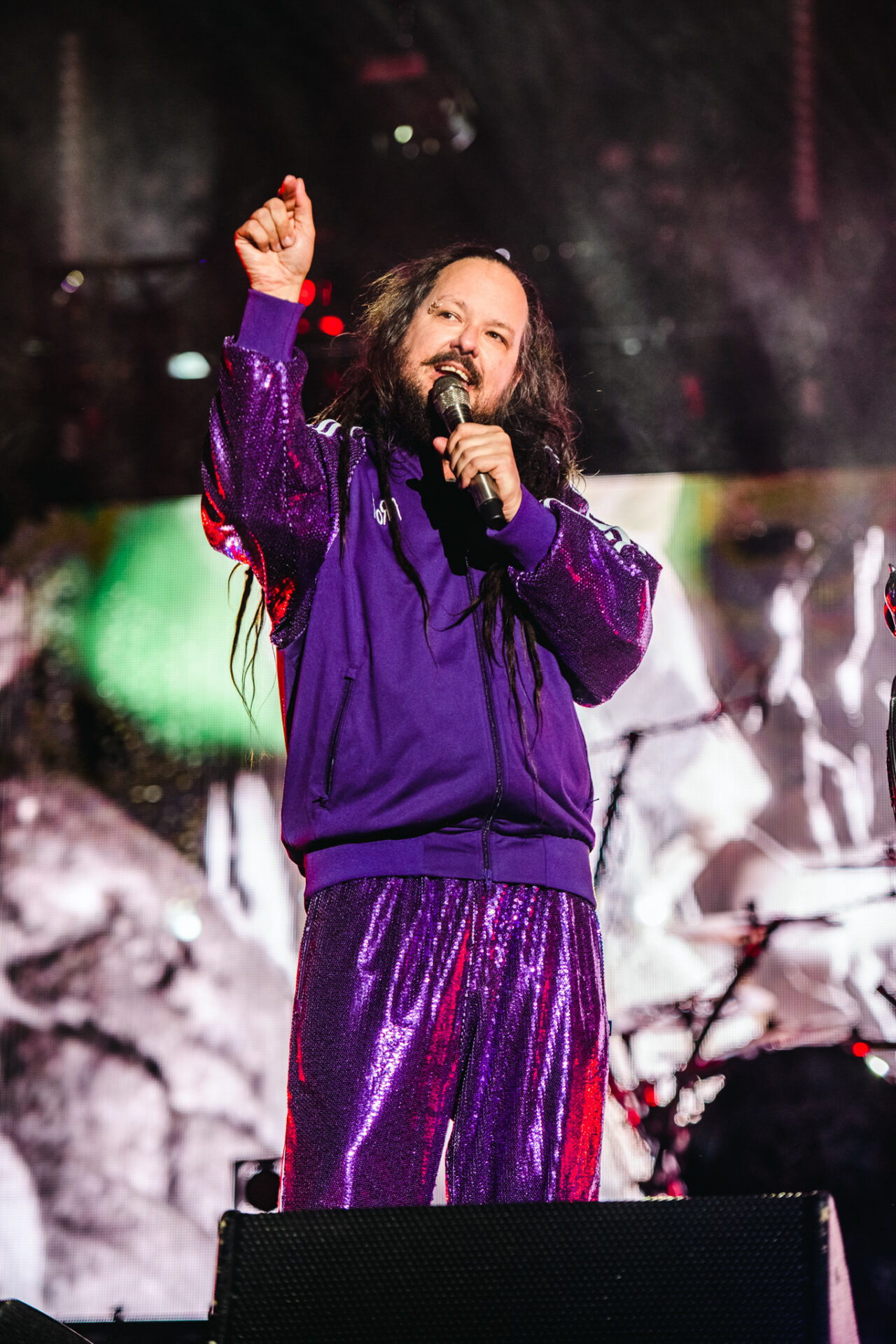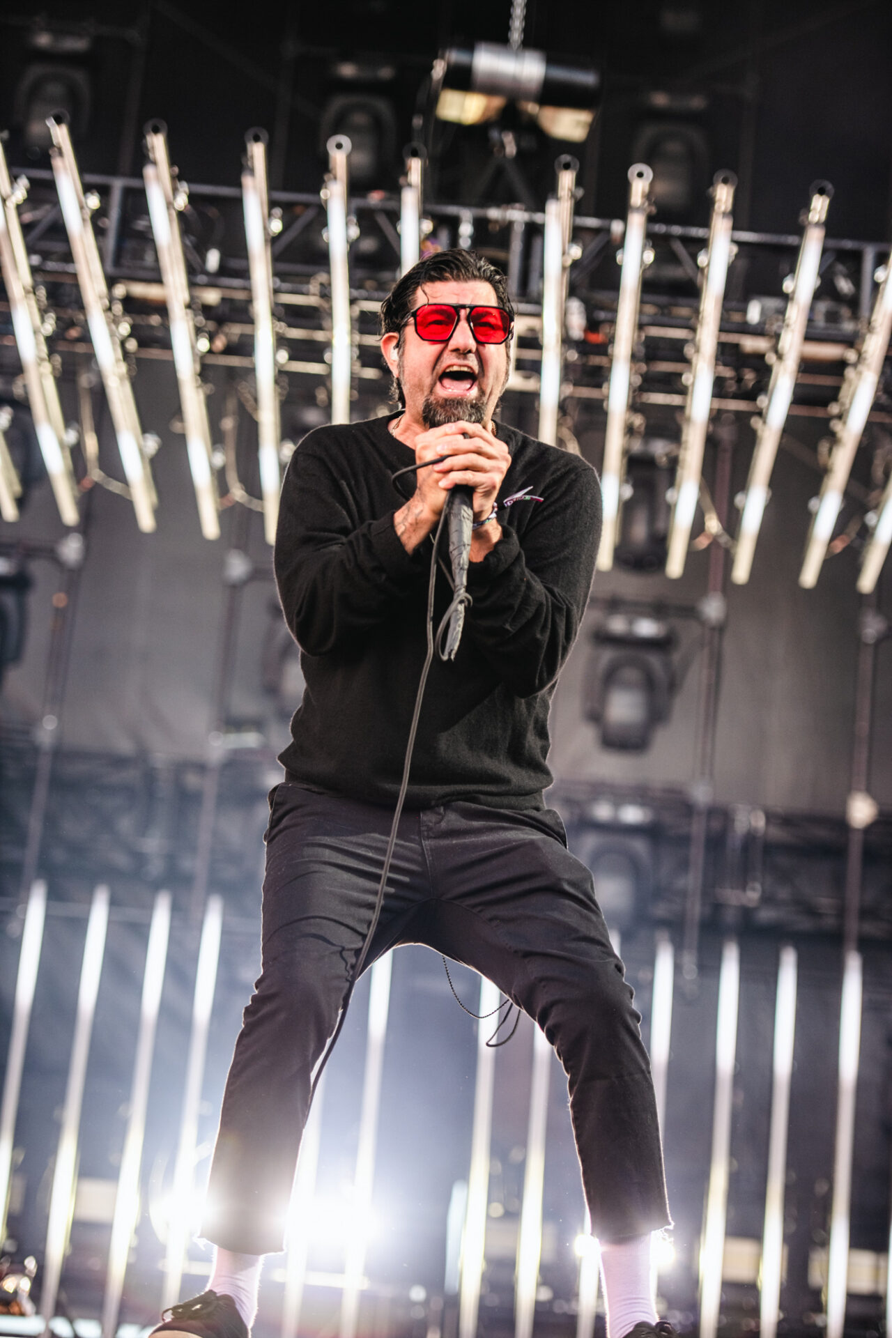 The grand finale on the main stages saw the legendary Deftones, Korn, and System of a Down, delivering amazing performances that exceeded all my expectations. Korn took the stage around 8:40 pm with a giant screen in front showcasing mesmerizing graphics as they played “Rotting in Vain”. The screen lifted as the opening notes of “A.D.I.D.A.S.” reverberated throughout the fairgrounds. We could now see singer Jonathan Davis sporting his iconic purple sparkly Adidas tracksuit, which is very apropos for the song. Later in the set, Davis teased the crowd with his bagpipe playing abilities, which made fans go crazy as it was signaling the start of their song “Shoots and Ladders” from their debut 1994 self-titled album. Also, a fun little treat for fans on was the band including a quick cover of Metallica’s “One” mixed in with the song.