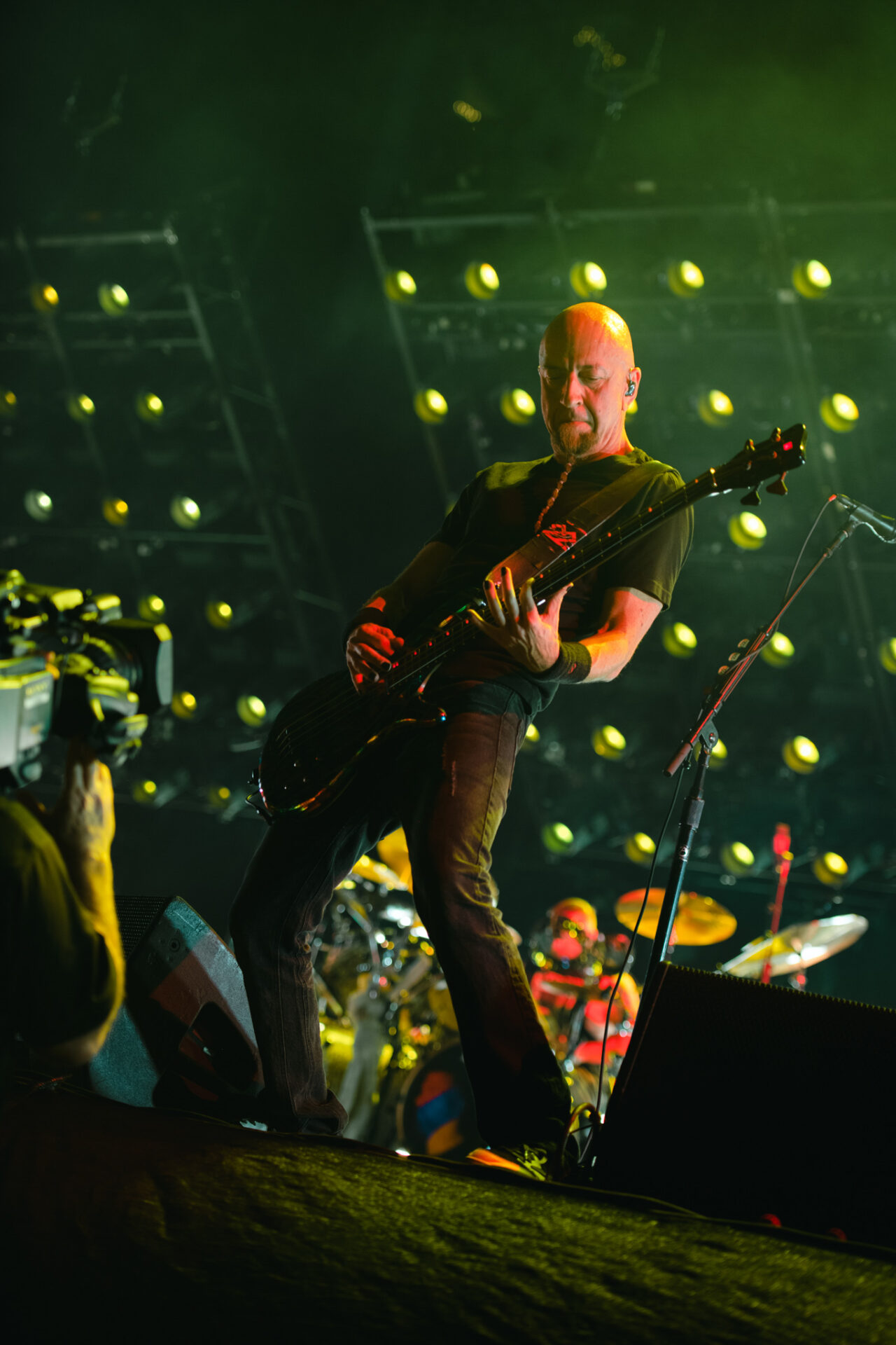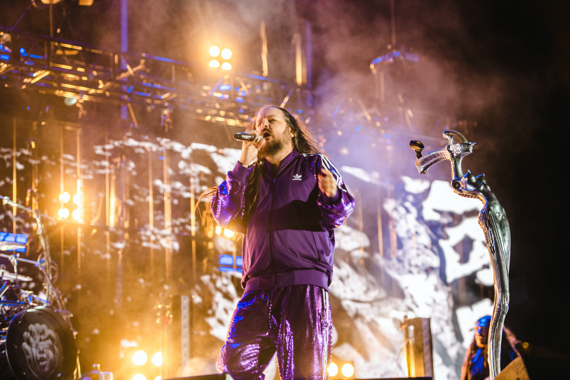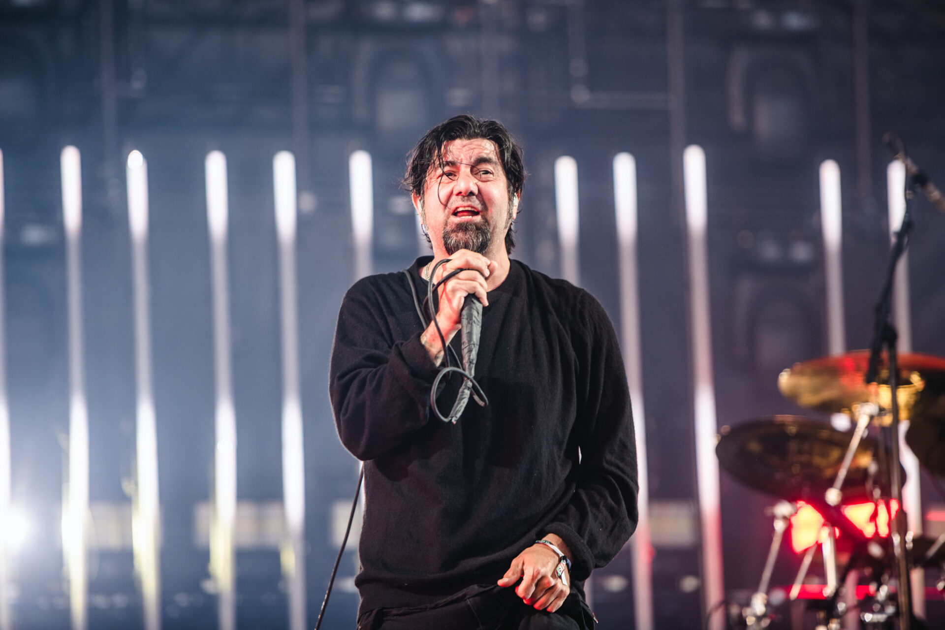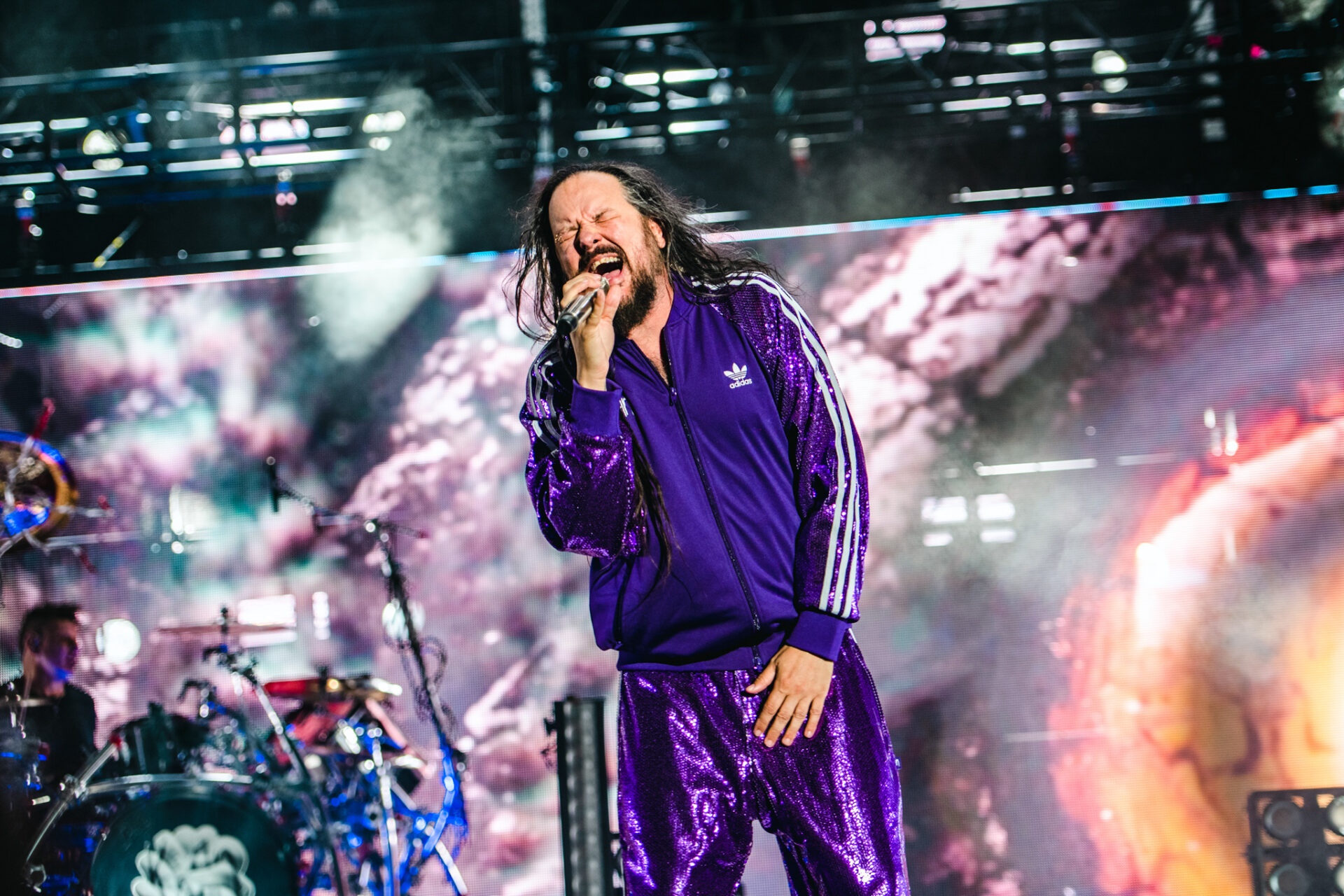The grand finale on the main stages saw the legendary Deftones, Korn, and System of a Down, delivering amazing performances that exceeded all my expectations. Korn took the stage around 8:40 pm with a giant screen in front showcasing mesmerizing graphics as they played “Rotting in Vain”. The screen lifted as the opening notes of “A.D.I.D.A.S.” reverberated throughout the fairgrounds. We could now see singer Jonathan Davis sporting his iconic purple sparkly Adidas tracksuit, which is very apropos for the song. Later in the set, Davis teased the crowd with his bagpipe playing abilities, which made fans go crazy as it was signaling the start of their song “Shoots and Ladders” from their debut 1994 self-titled album. Also, a fun little treat for fans on was the band including a quick cover of Metallica’s “One” mixed in with the song.