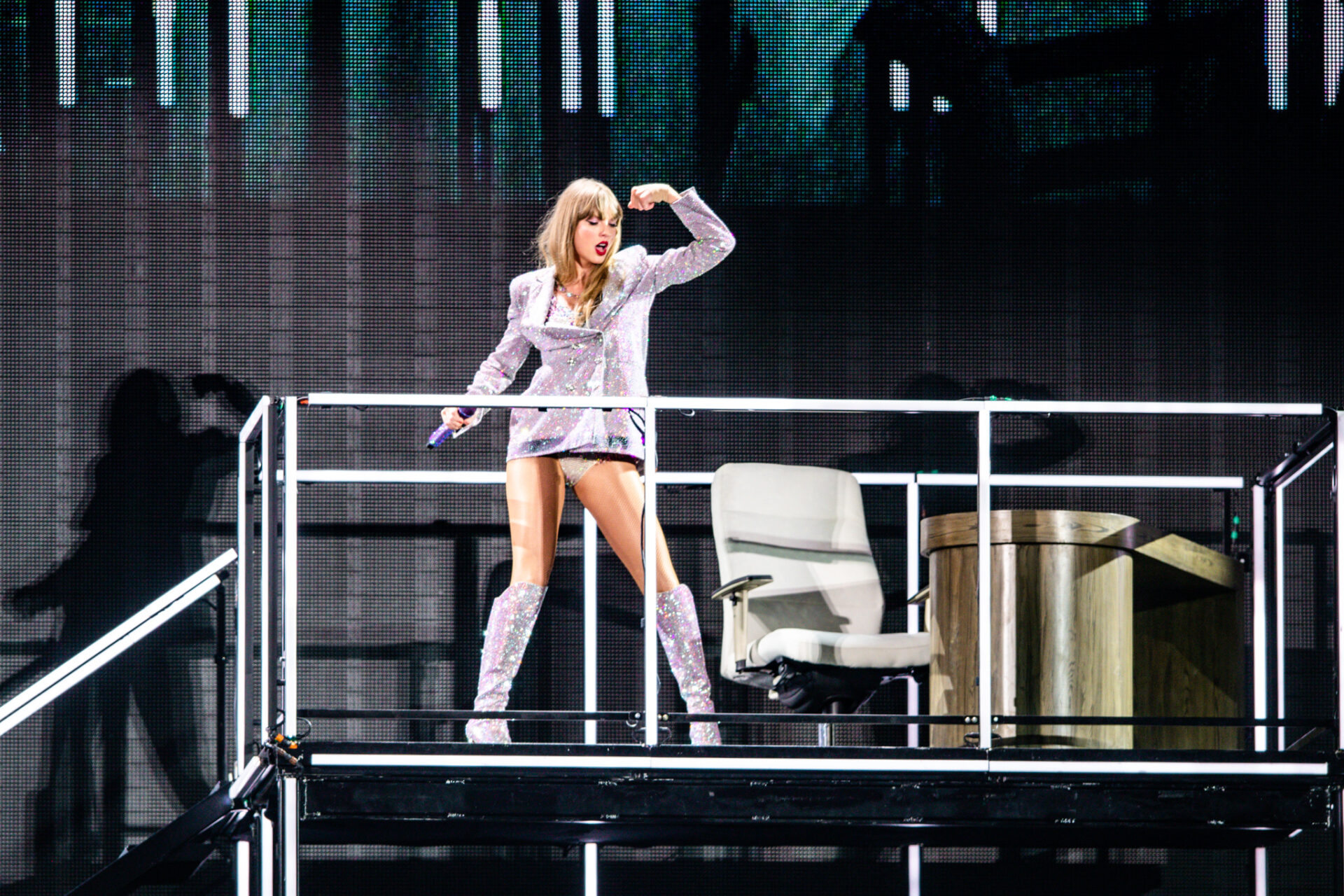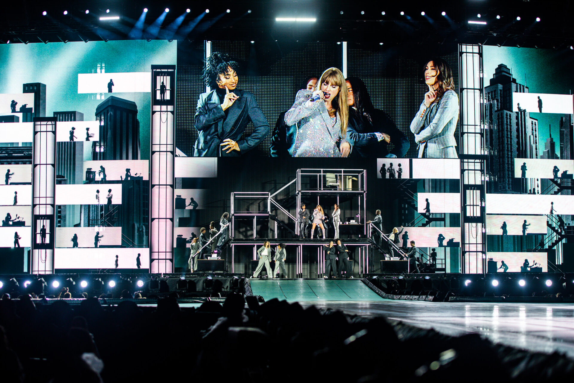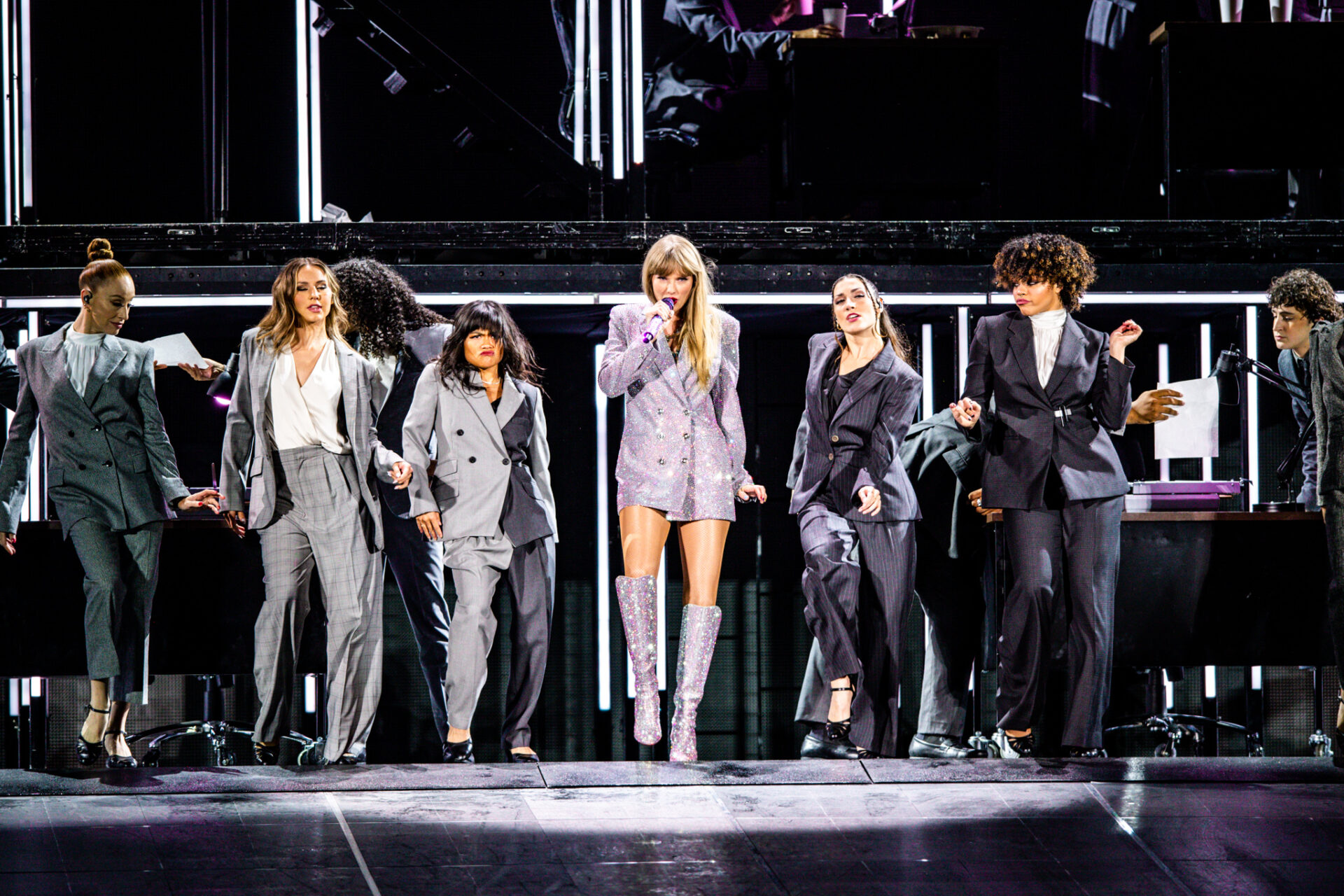 The dancers came together in the center of the massive catwalk, holding their billowy pieces aloft to form a shield-like enclosure. The music continued to build, with bits and pieces of various songs woven together in a montage intro that left the crowd on the edge of their seats. Suddenly, the enclosure opened, revealing Taylor Swift herself, who appeared like the mythical goddess Venus emerging from the sea. She was resplendent in a stunning, sparkly leotard and matching boots, and the audience erupted with deafening cheers as she began her set.