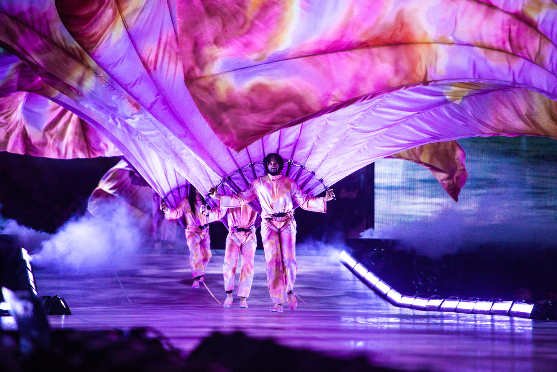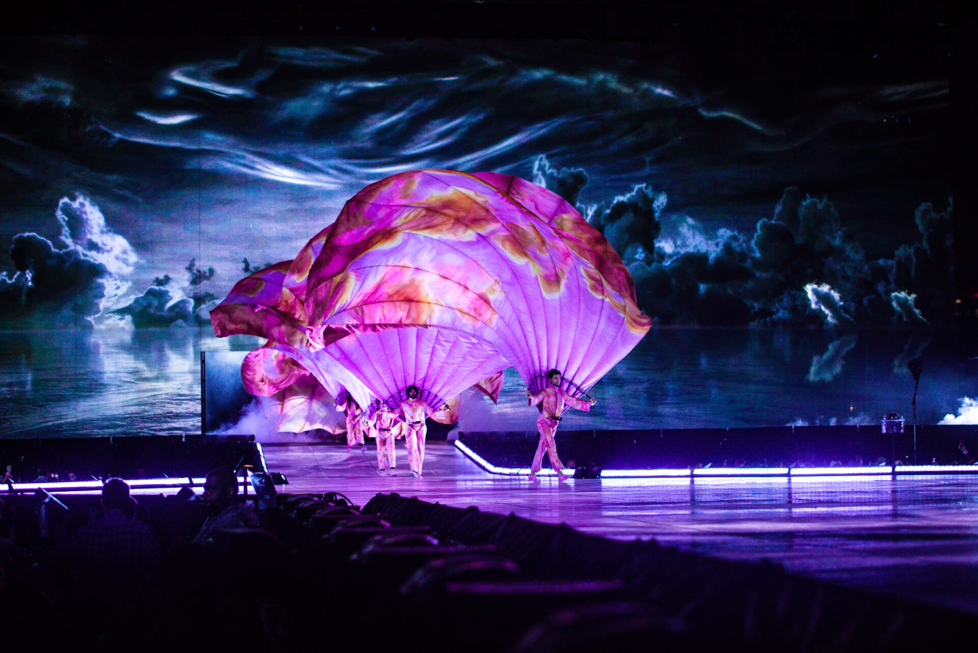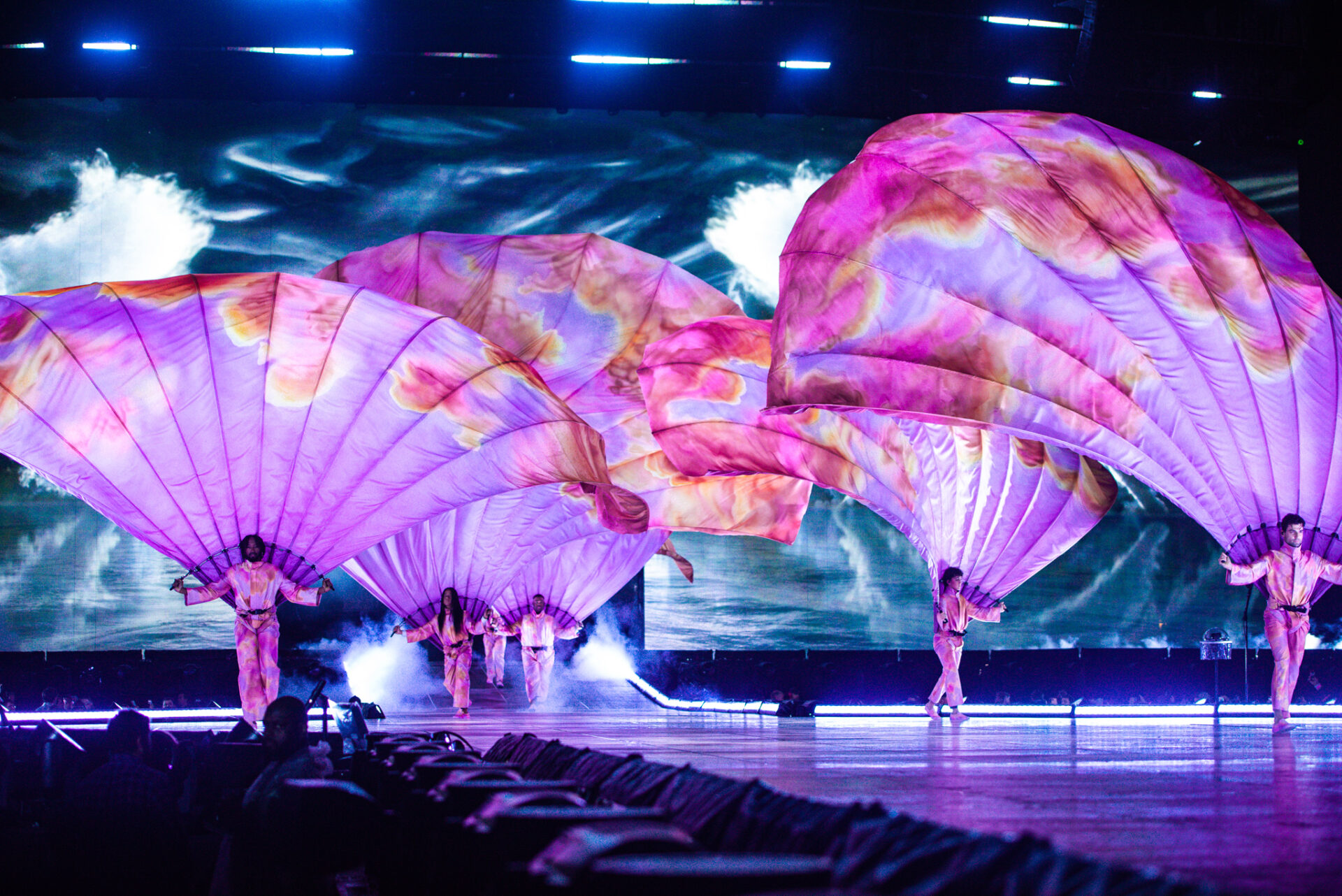 The dancers came together in the center of the massive catwalk, holding their billowy pieces aloft to form a shield-like enclosure. The music continued to build, with bits and pieces of various songs woven together in a montage intro that left the crowd on the edge of their seats. Suddenly, the enclosure opened, revealing Taylor Swift herself, who appeared like the mythical goddess Venus emerging from the sea. She was resplendent in a stunning, sparkly leotard and matching boots, and the audience erupted with deafening cheers as she began her set.