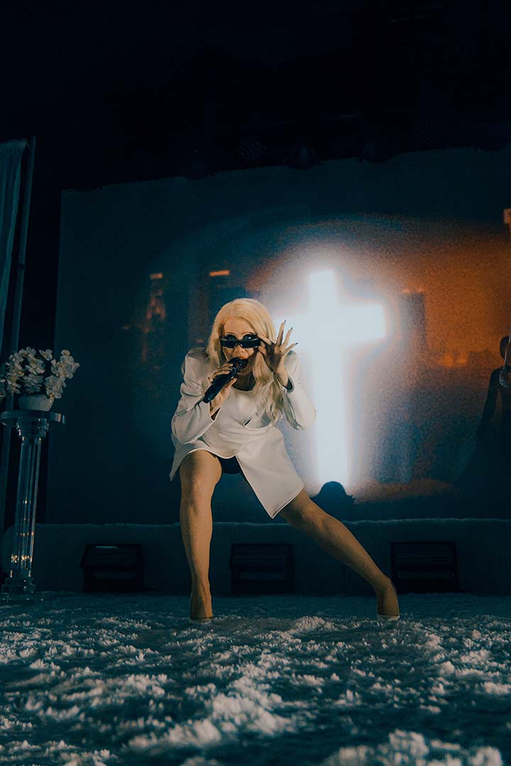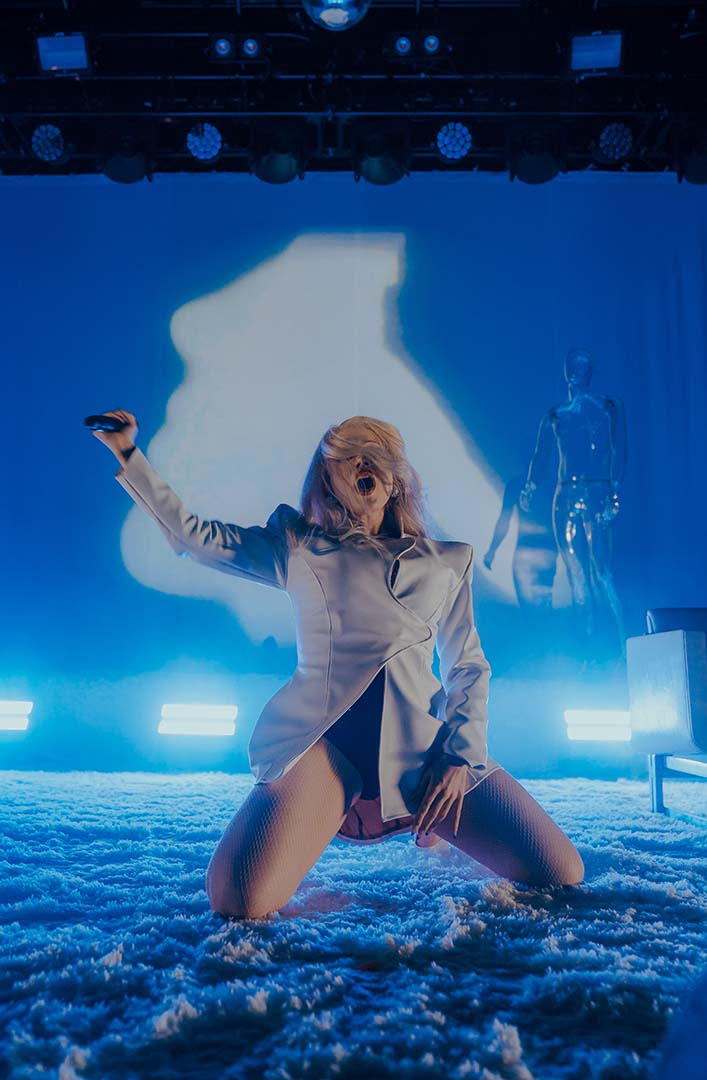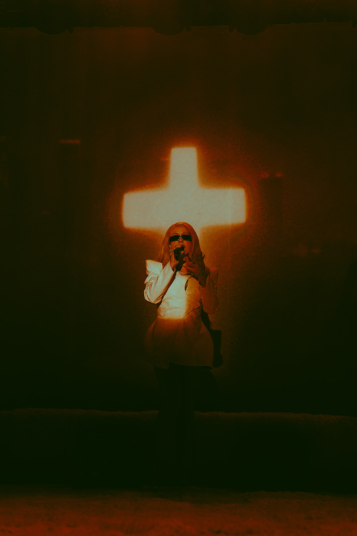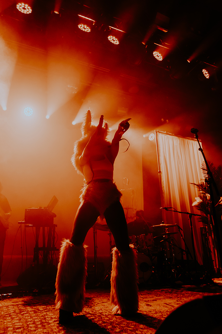 It was clear that many people in the crowd were introduced to Miss Madeline and BAYLI for the first time that evening, but had certainly become fans after their performances. However, the attention began to shift towards the main event: Slayyyter. The stage was draped with white curtains, the floor covered in a fuzzy white rug with art deco themed furniture and props across the stage. The vibe for the evening was giving a mid century modern nod to Hollywood… very much Slayyyter’s brand.