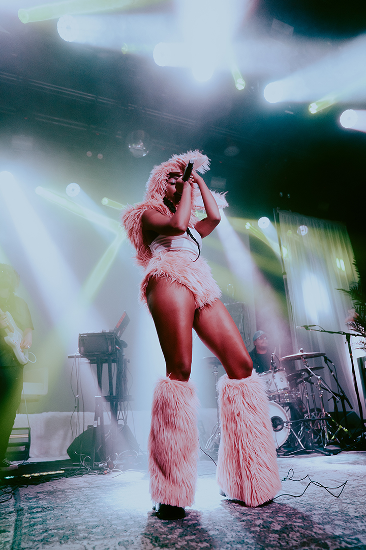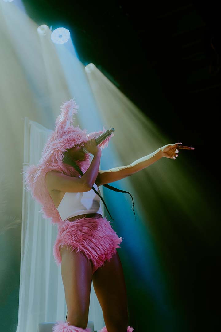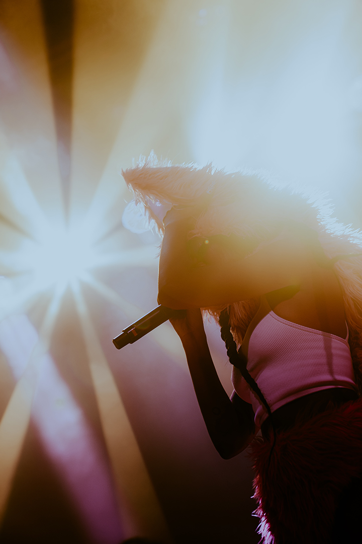 Next, BAYLI graced the stage for a hometown performance. Wearing a fuzzy pink hooded two-piece set with matching leg warmers and situated between two white curtains to stage left, BAYLI began her set. Her slower, soulful music was a welcomed change of pace for the crowd to catch their breath. Over her 30 minute set time, BAYLI covered a range of hits including “TELLY BAG”, “think of drugs” and ending with her hit single “sushi for breakfast”.