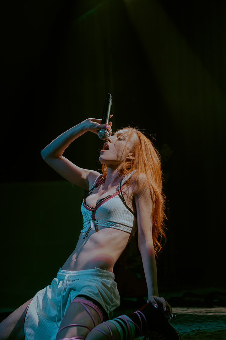 Just before 10pm, the lights throughout the venue went dark and a countdown flashed on the white curtain in center stage. The crowd began screaming down the seconds until the show began, and the anticipation was about to pop when Slayyyter bursted onto the stage and immediately ripped into her hit single “Out Of Time”.