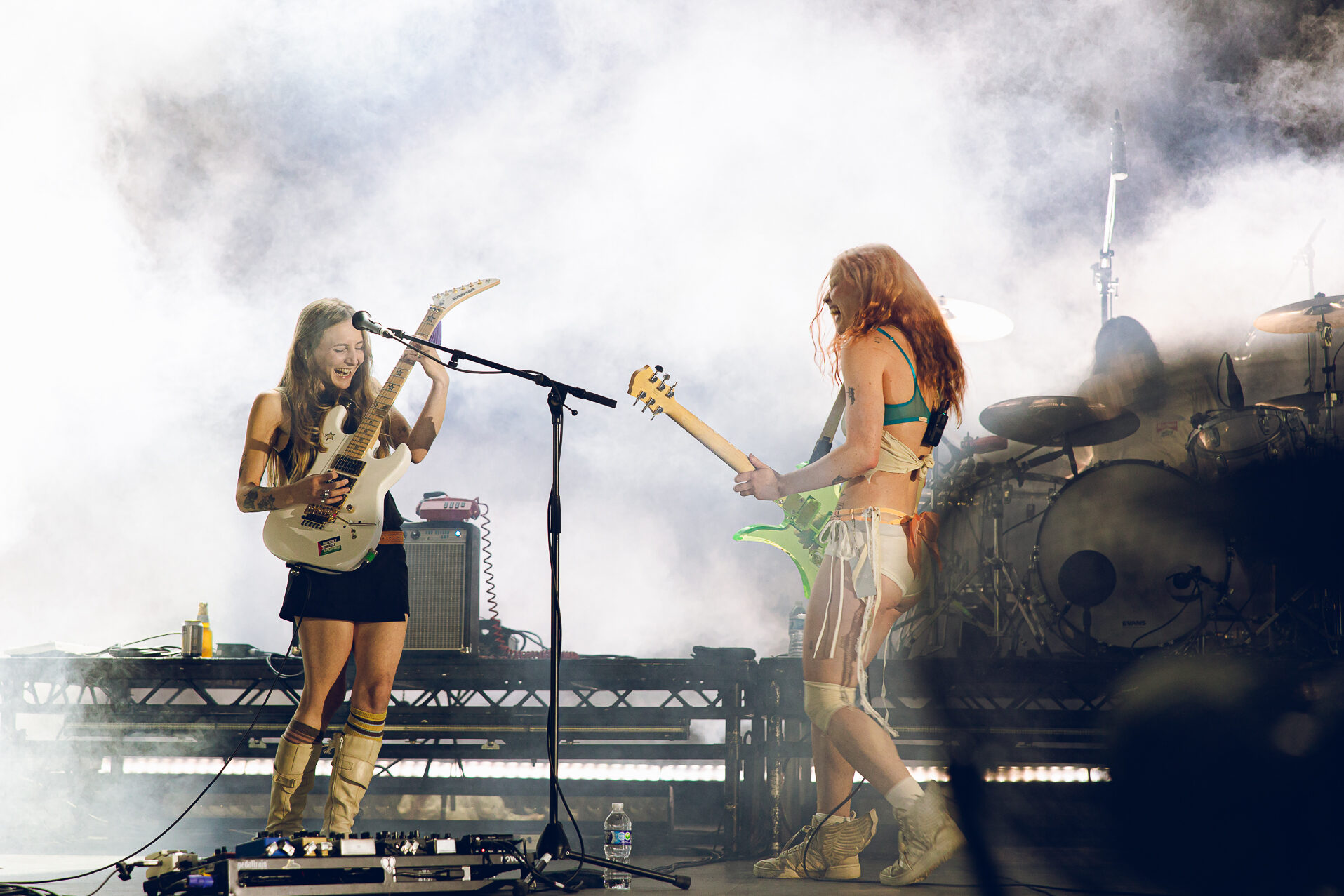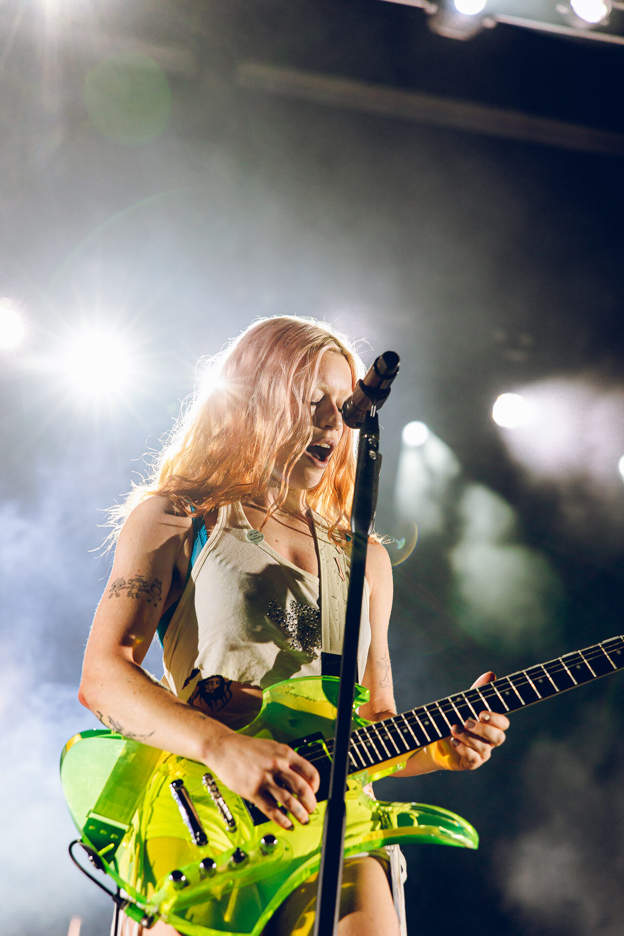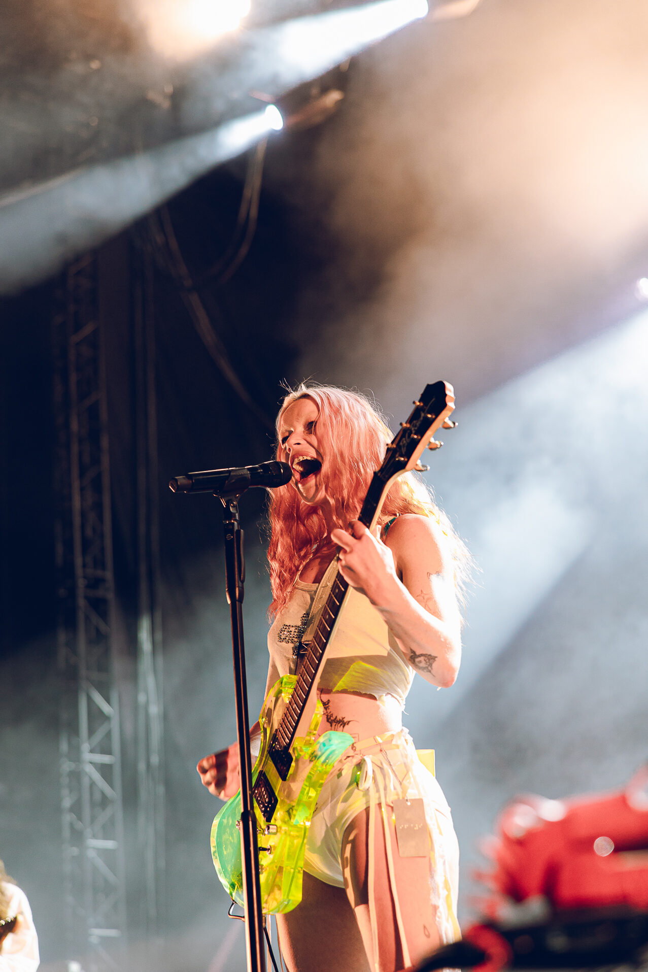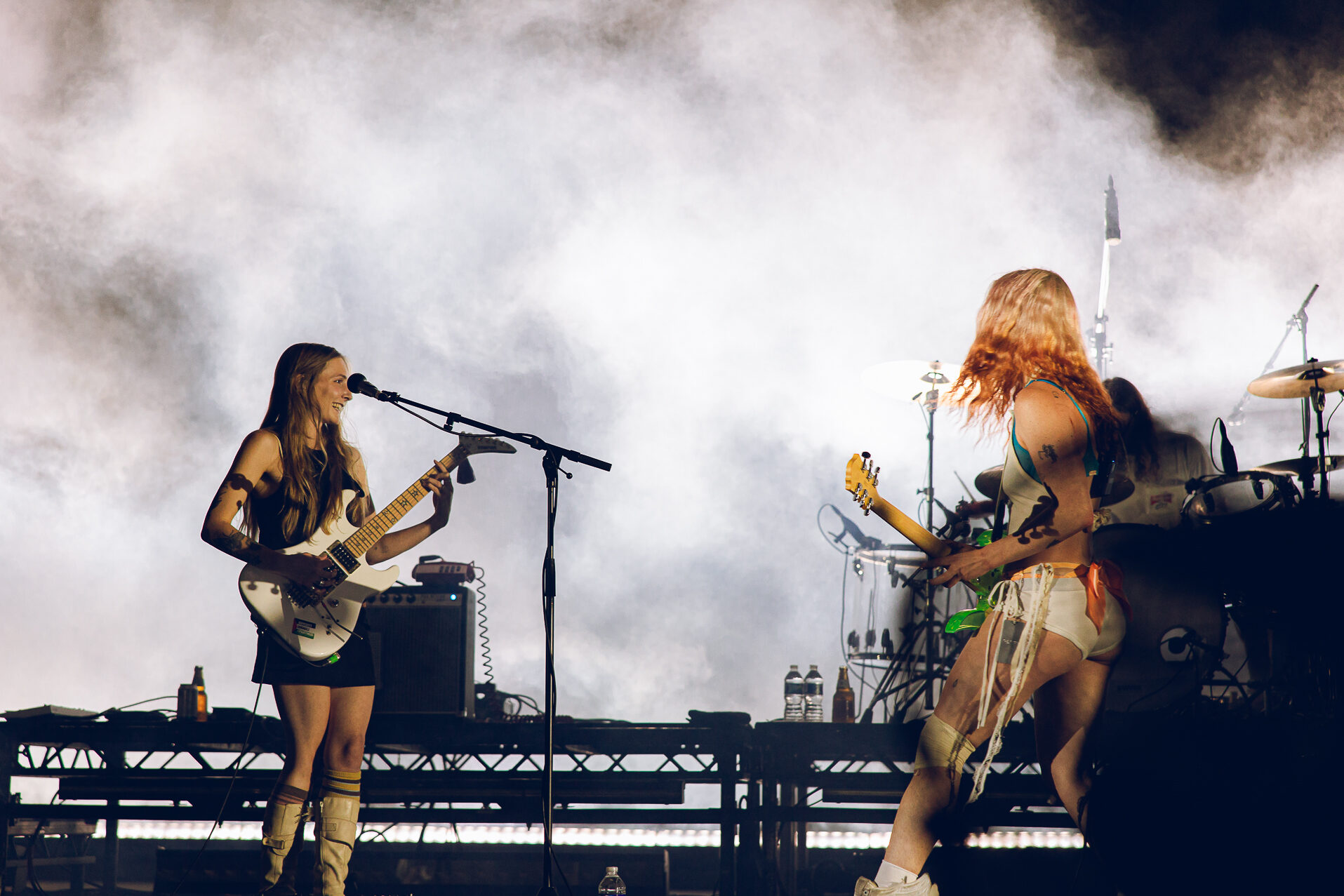Wet Leg started their set with “Catch These Fists”, the hit single off of Moisturizer. With strobe lights completely engulfing the outdoor venue, Teasdale eyed her fans with a piercing gaze and bleached eyebrows. She said every word with intention and a bit of playful sarcasm. The fans at it up. Wet Leg’s energy could be felt all the way in the back of the fairgrounds (and by the kayaks and boats passing by on the river hoping to catch a free show). Not every band would start their set with their newest hit single, but Wet Leg didn’t want to keep their fans waiting. Their set included some of the most loved songs from their debut album, including “Chaise Longue”, “Ur Mum”, and “Wet Dream”, while playing some of the softer, more pop-driven songs from their new album. One of the highlights of their Chicago show was the tour debut of “11:21”, a slow and thoughtful song reminiscent of a Karen O ballad. Every member of Wet Leg brought their A game to this show, and they will definitely sell out their next show in Chicago, whenever we’re lucky enough to see them again.