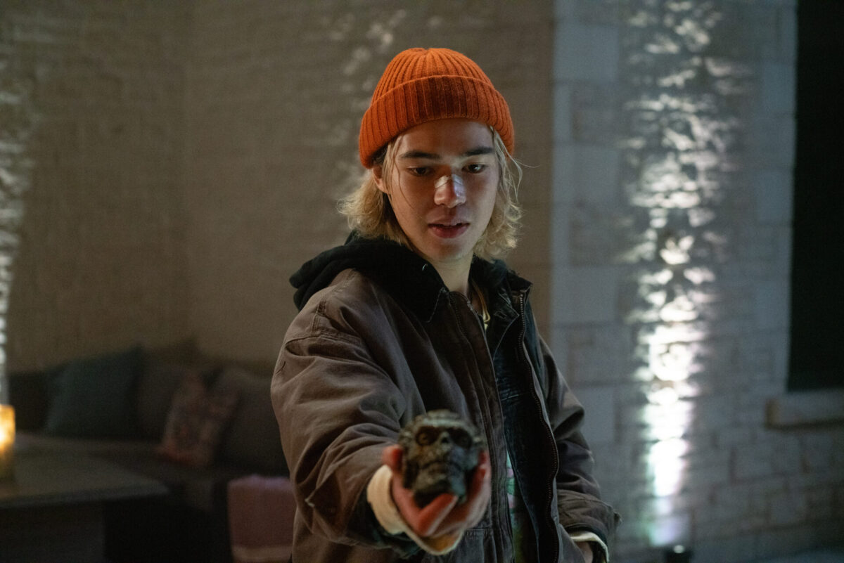 But as the thrills unfold in this 97-minute package, Owen Egerton’s story neither elevates nor detracts from the film. The characters have just enough archetypal fiber to be fodder for the evil. Chrys (Dafne Keen) has moved in with her cousin, Rel (Sky Yang), in the aftermath of a personal tragedy concerning her father’s death. In looking for a brand new start, she’s also trying to leave addiction and guilt behind. Chrys’s start at the new high school begins a little rough. High school varsity jock Dean (Jhaleil Swaby) has heard about her story and decides to taunt her with it. She and a few other students, including Dean’s girlfriend Grace (Ali Skovbye), Chrys’s romantic interest Ellie (Sophie Nelisse), Rel, and Dean, end up in detention with the rather ornery teacher, Mr. Craven (Nick Frost).